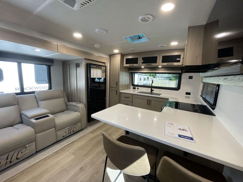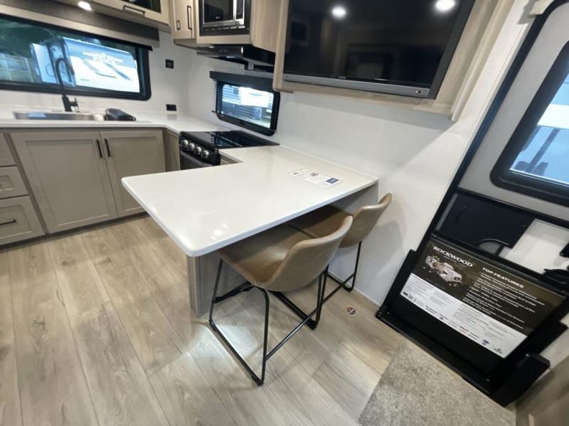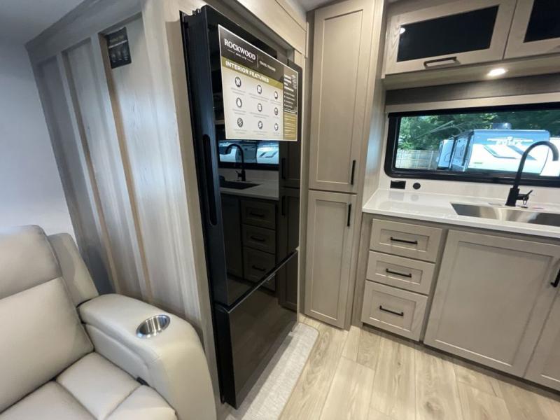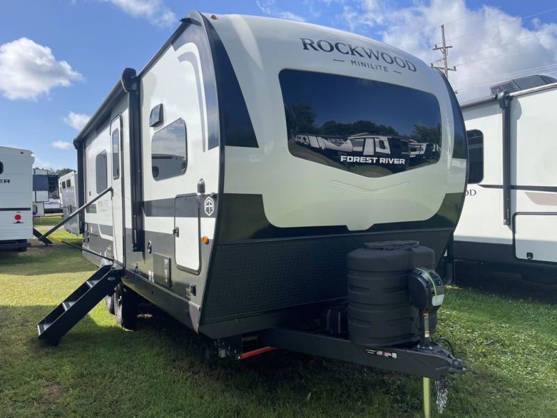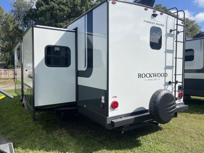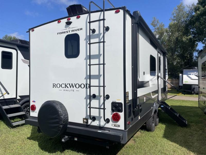 Each Rockwood Mini Lite travel trailer by Forest River is constructed with a fully laminated one-piece walkable roof, sleek frameless windows, and a six-sided full aluminum frame for strength and durability. The 12V thermostatically controlled heated tanks, plus radiant foil in the underbelly will allow you to camp well into the colder months, and the 200W roof solar panel will be perfect for a little off-gridding. Each model includes solid surface kitchen countertops, hidden hinge cabinet doors, roller shades, plus many more interior features. Having an AIR 360+ omnidirectional antenna with WiFi prep on board gives you the option to get some work done if it's needed, and the power tongue jack provides hassle-free set up, so you can enjoy more time relaxing!
