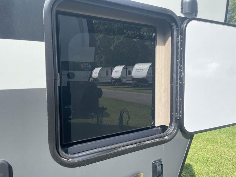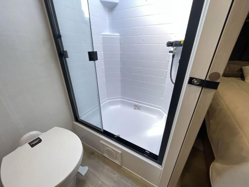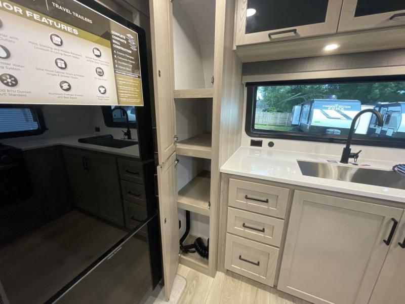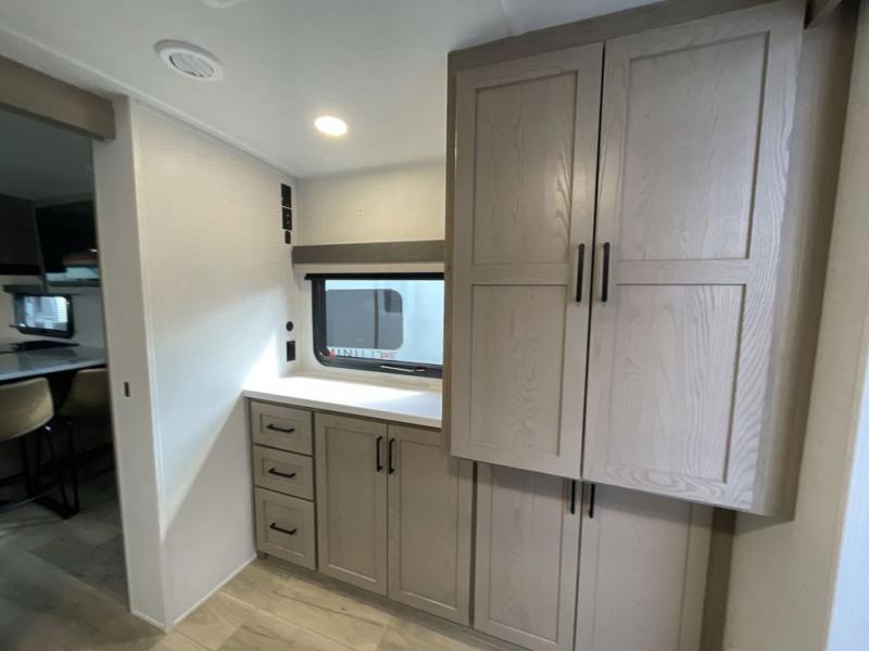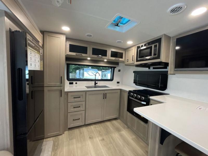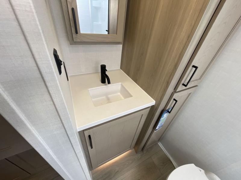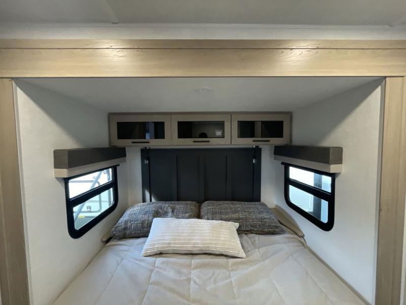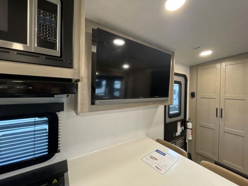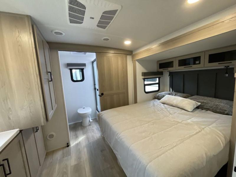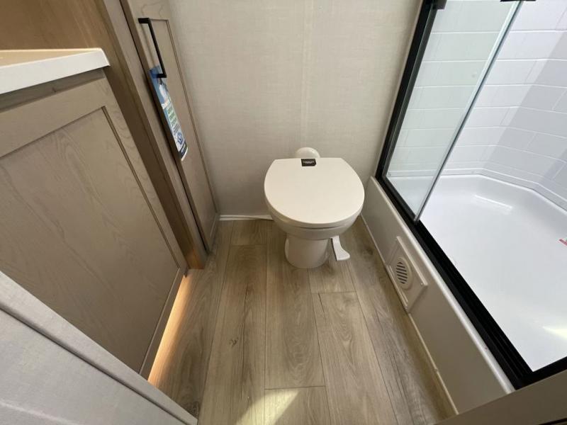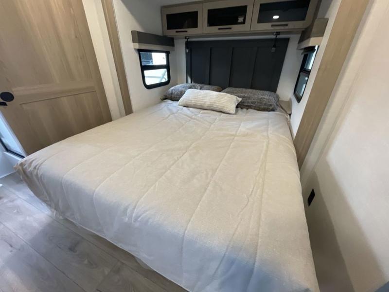This travel trailer is the best option for you and your partner! The lavish full rear bathroom features a spacious layout and a convenient linen closet, perfect for relaxation and refreshment. The elegant bedroom boasts a plush queen bed, ample wardrobe space, and stylish dresser, creating a serene retreat. The spacious living room and kitchen combined area is the heart of the trailer, featuring plush theater seating for cozy movie nights, a generous closet for storing essentials, and a 12V Smart TV for entertainment on the go. Plus, the expansive countertop with chairs provides a perfect spot for gourmet meals or socializing, while the premium three-burner cooktop, well-stocked kitchen pantry, and high-performance microwave make meal prep and cooking a true delight.