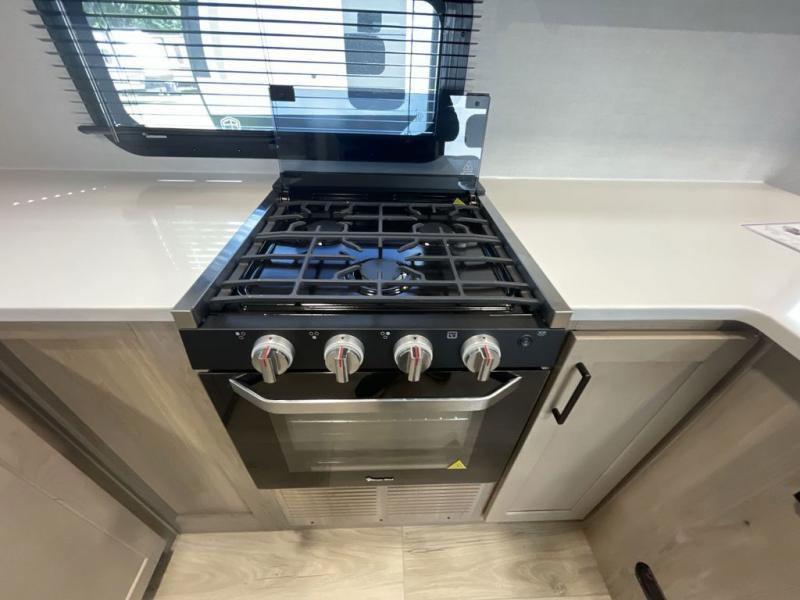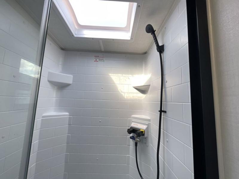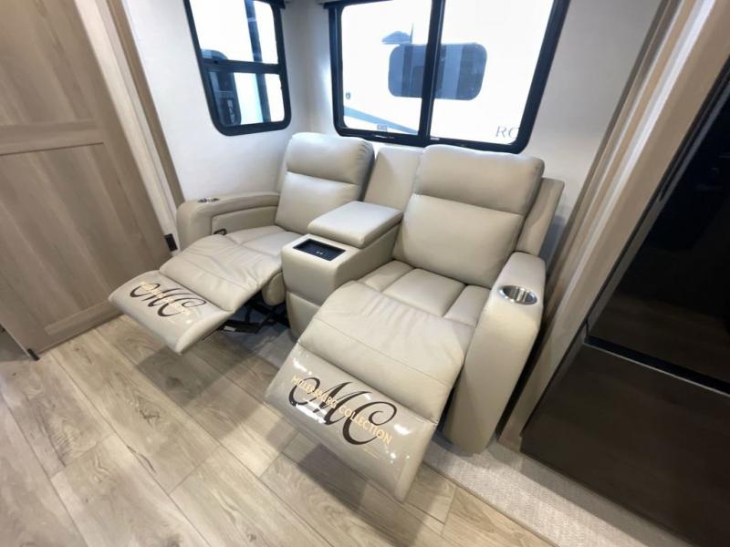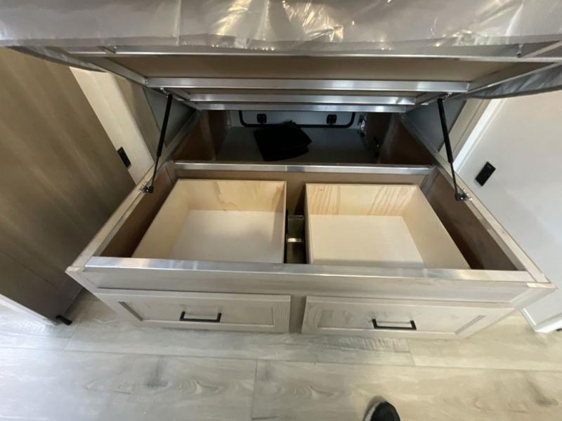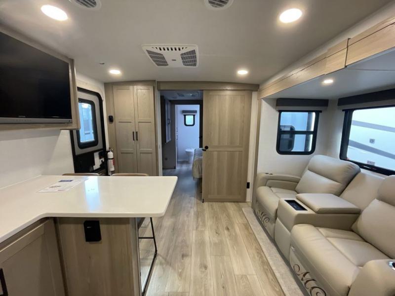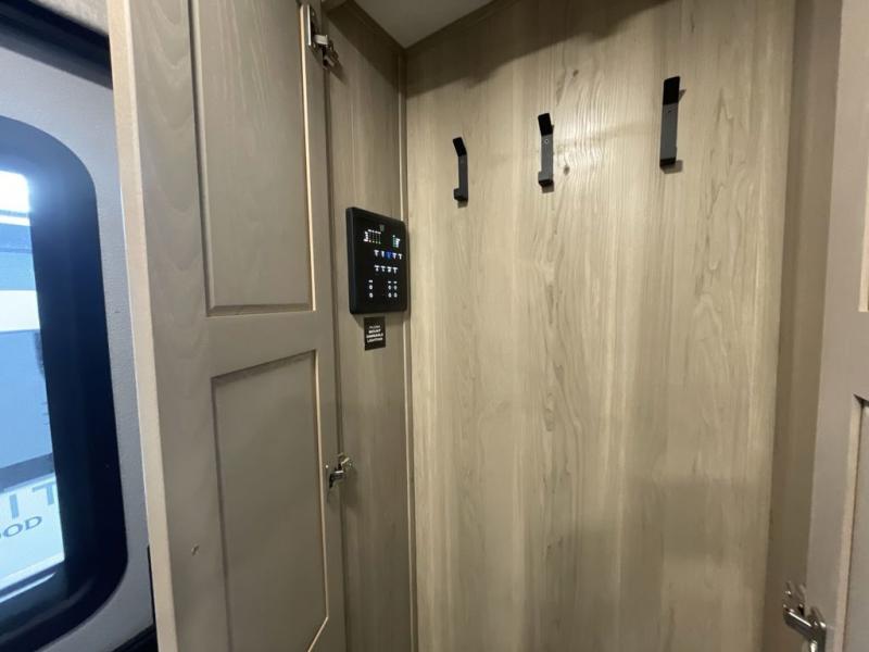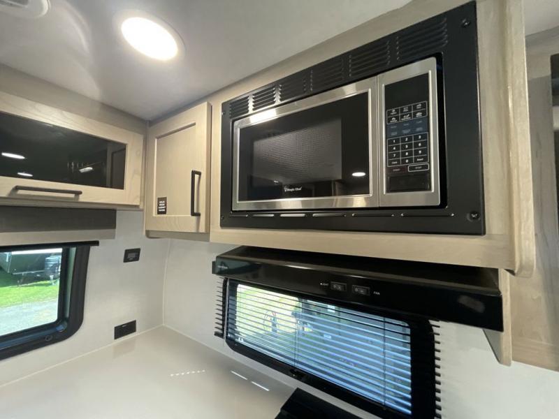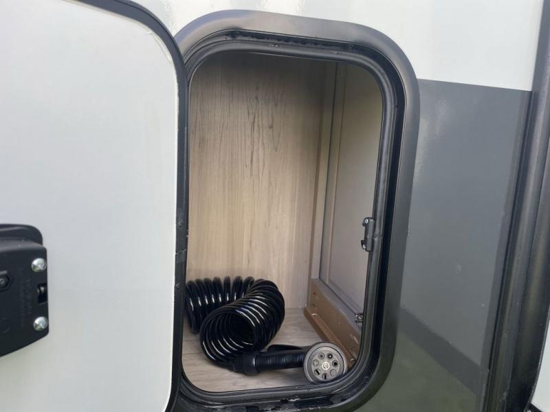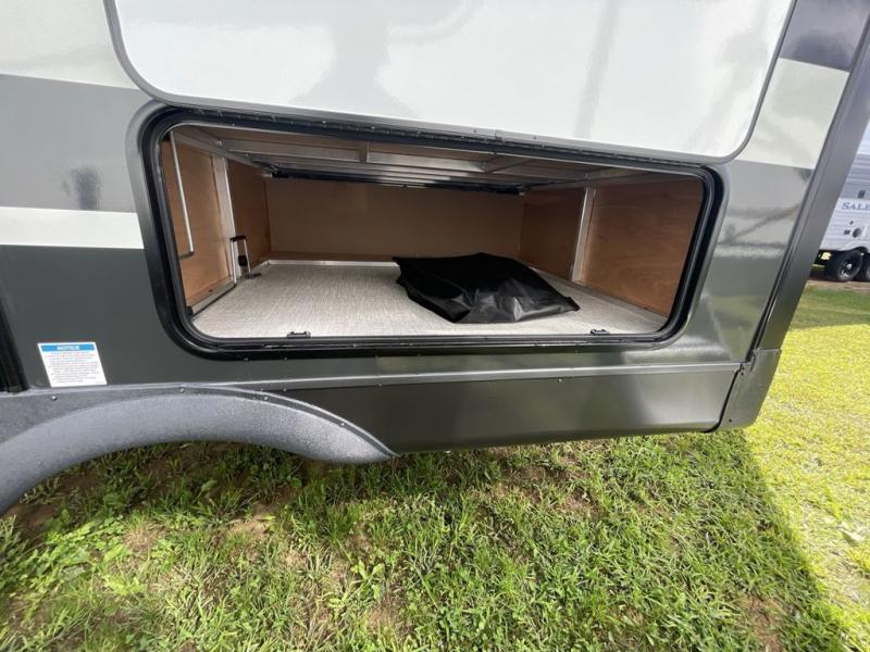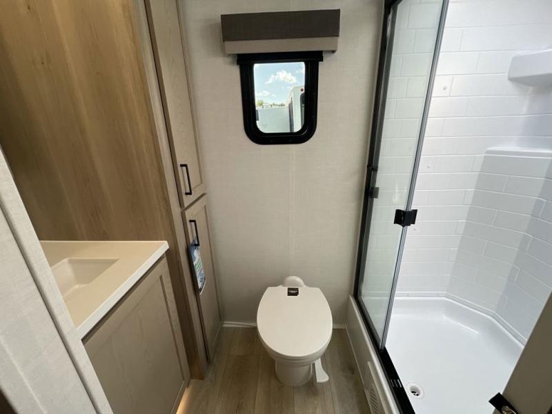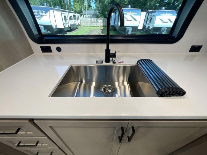 This travel trailer is the best option for you and your partner! The lavish full rear bathroom features a spacious layout and a convenient linen closet, perfect for relaxation and refreshment. The elegant bedroom boasts a plush queen bed, ample wardrobe space, and stylish dresser, creating a serene retreat. The spacious living room and kitchen combined area is the heart of the trailer, featuring plush theater seating for cozy movie nights, a generous closet for storing essentials, and a 12V Smart TV for entertainment on the go. Plus, the expansive countertop with chairs provides a perfect spot for gourmet meals or socializing, while the premium three-burner cooktop, well-stocked kitchen pantry, and high-performance microwave make meal prep and cooking a true delight.