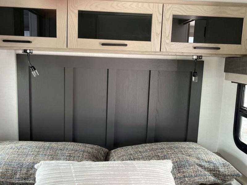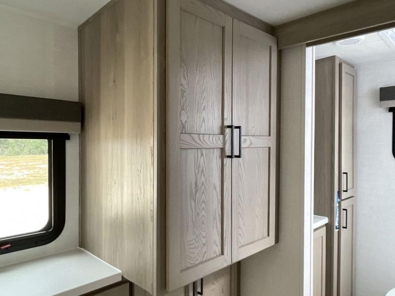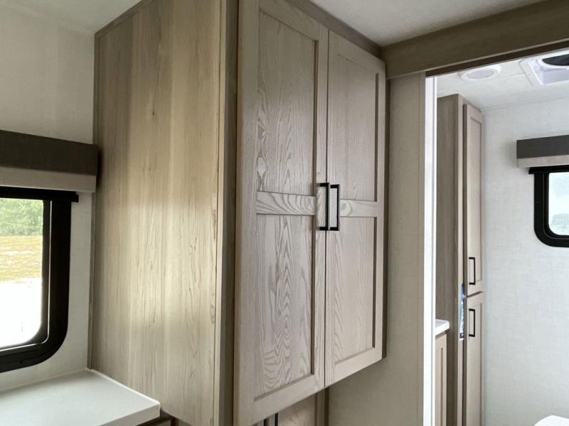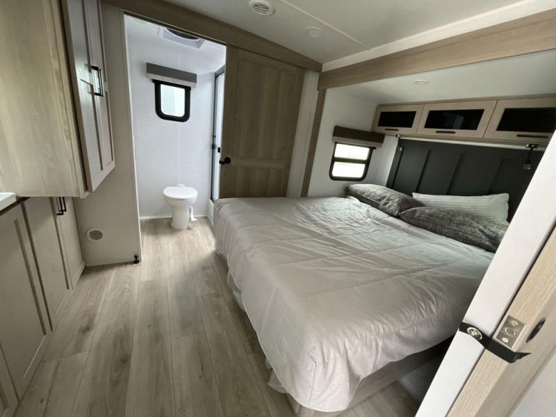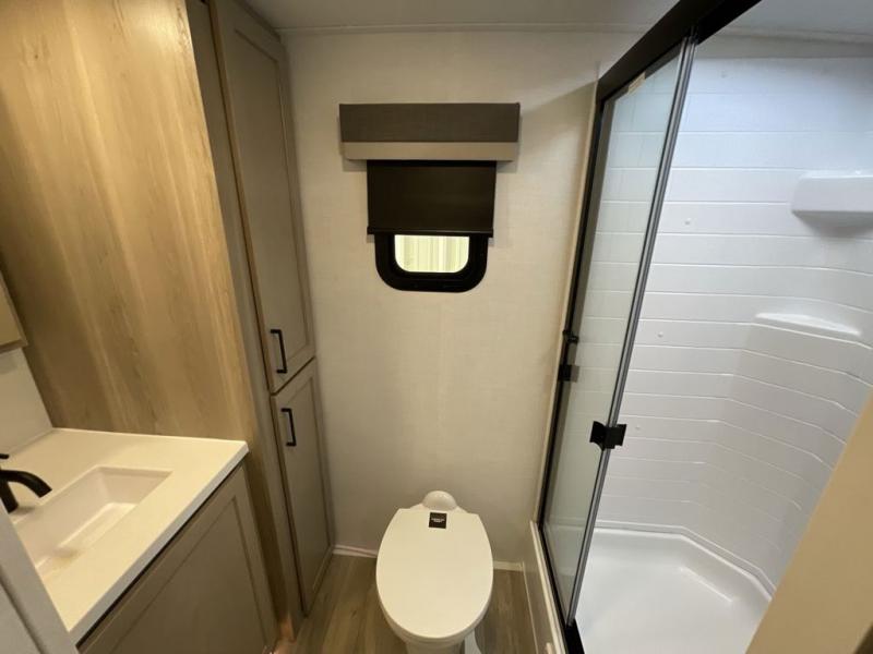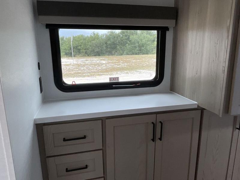 This travel trailer is the best option for you and your partner! The lavish full rear bathroom features a spacious layout and a convenient linen closet, perfect for relaxation and refreshment. The elegant bedroom boasts a plush queen bed, ample wardrobe space, and stylish dresser, creating a serene retreat. The spacious living room and kitchen combined area is the heart of the trailer, featuring plush theater seating for cozy movie nights, a generous closet for storing essentials, and a 12V Smart TV for entertainment on the go. Plus, the expansive countertop with chairs provides a perfect spot for gourmet meals or socializing, while the premium three-burner cooktop, well-stocked kitchen pantry, and high-performance microwave make meal prep and cooking a true delight.