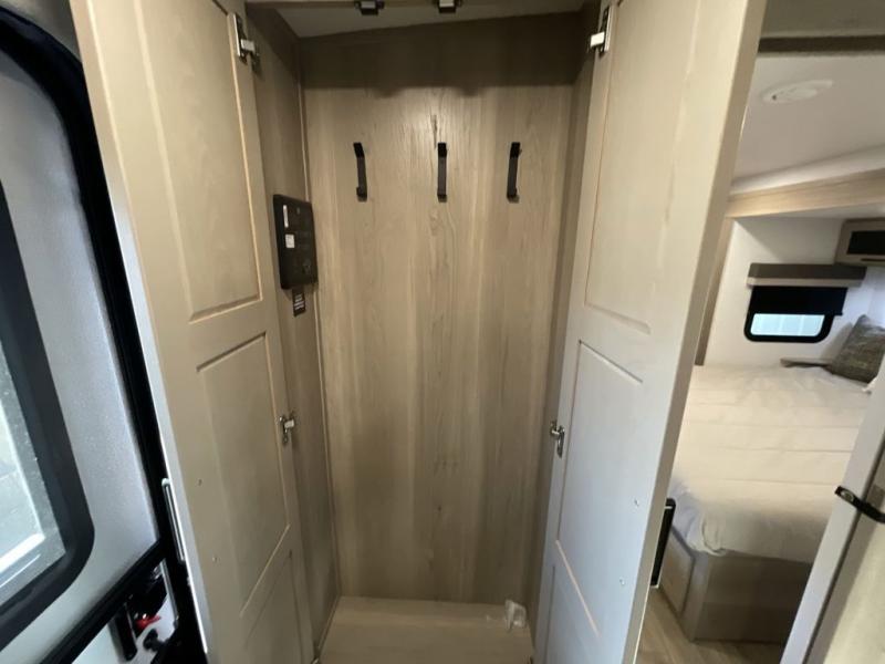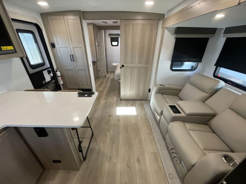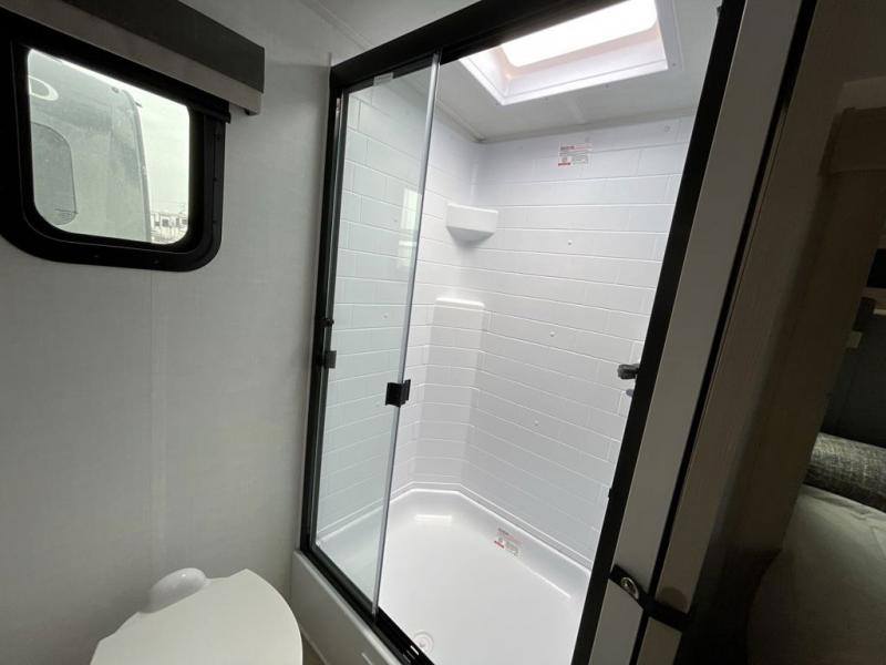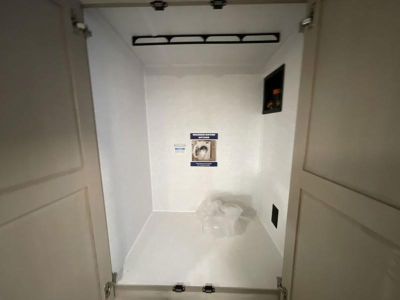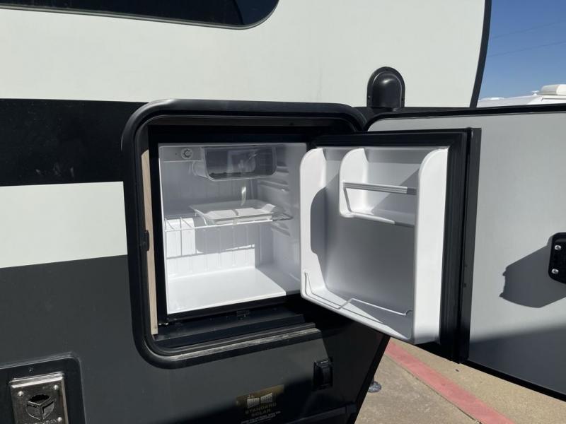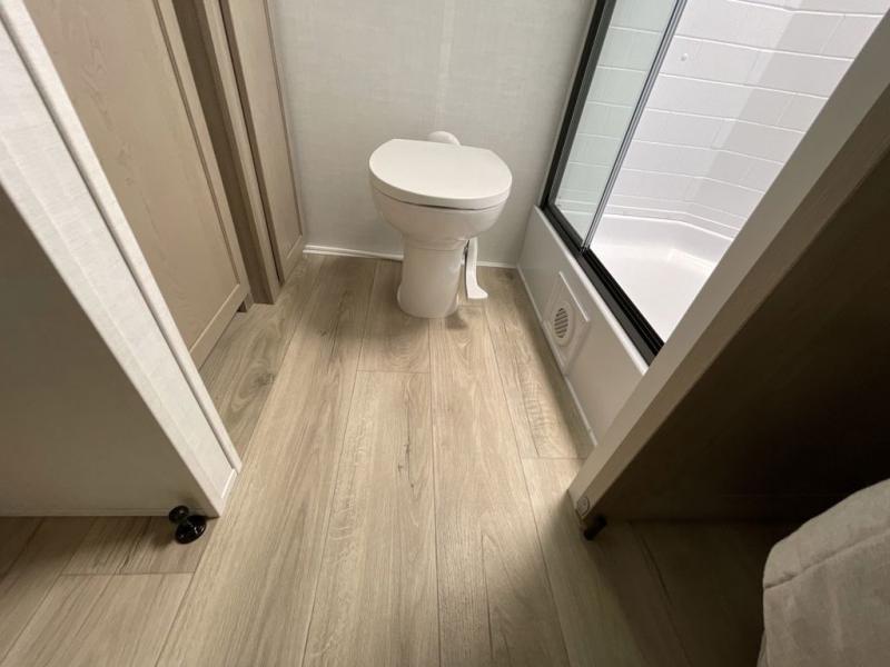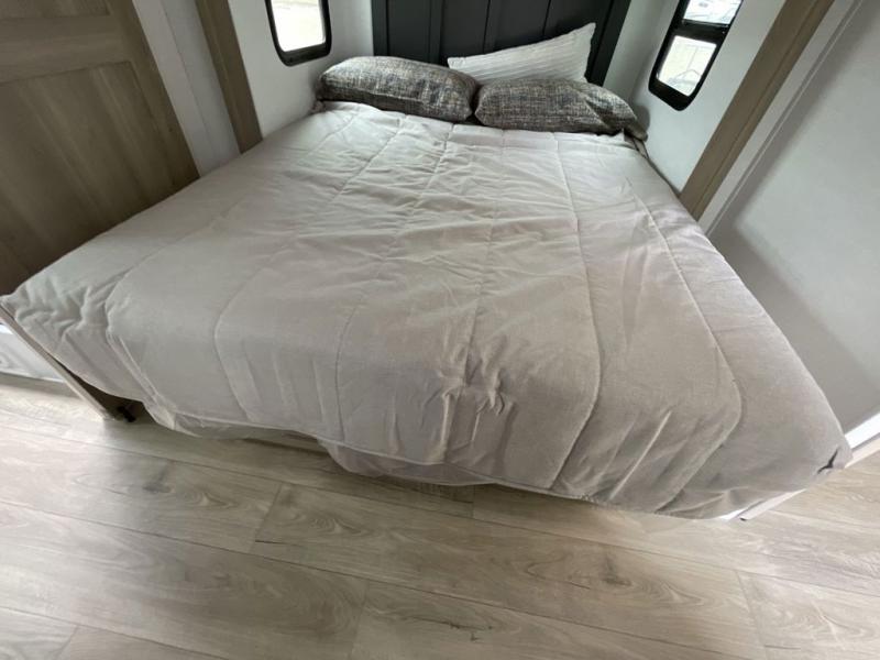 This travel trailer is the best option for you and your partner! The lavish full rear bathroom features a spacious layout and a convenient linen closet, perfect for relaxation and refreshment. The elegant bedroom boasts a plush queen bed, ample wardrobe space, and stylish dresser, creating a serene retreat. The spacious living room and kitchen combined area is the heart of the trailer, featuring plush theater seating for cozy movie nights, a generous closet for storing essentials, and a 12V Smart TV for entertainment on the go. Plus, the expansive countertop with chairs provides a perfect spot for gourmet meals or socializing, while the premium three-burner cooktop, well-stocked kitchen pantry, and high-performance microwave make meal prep and cooking a true delight.