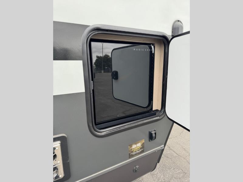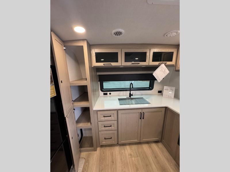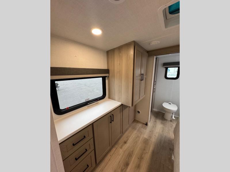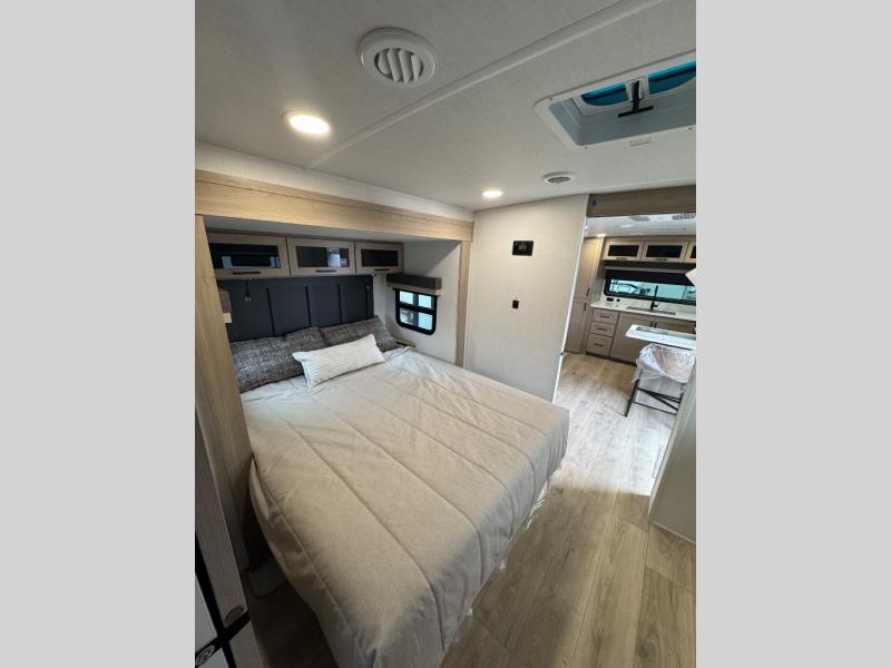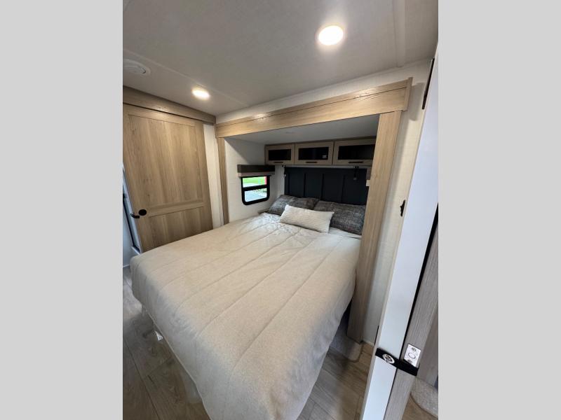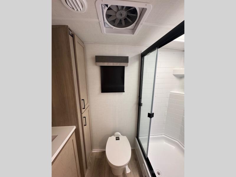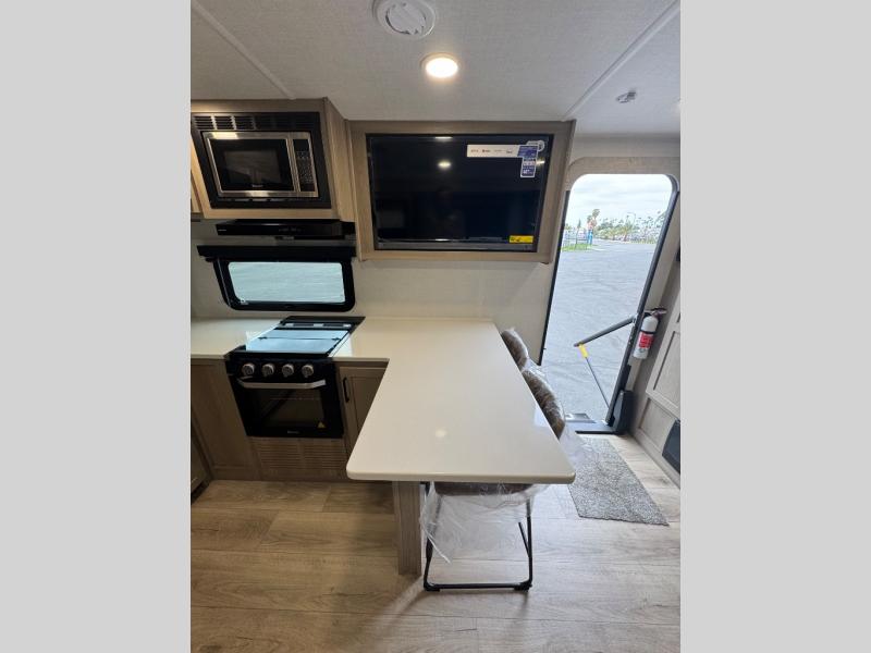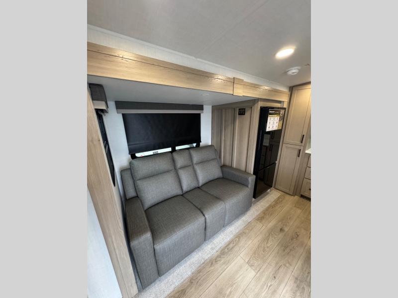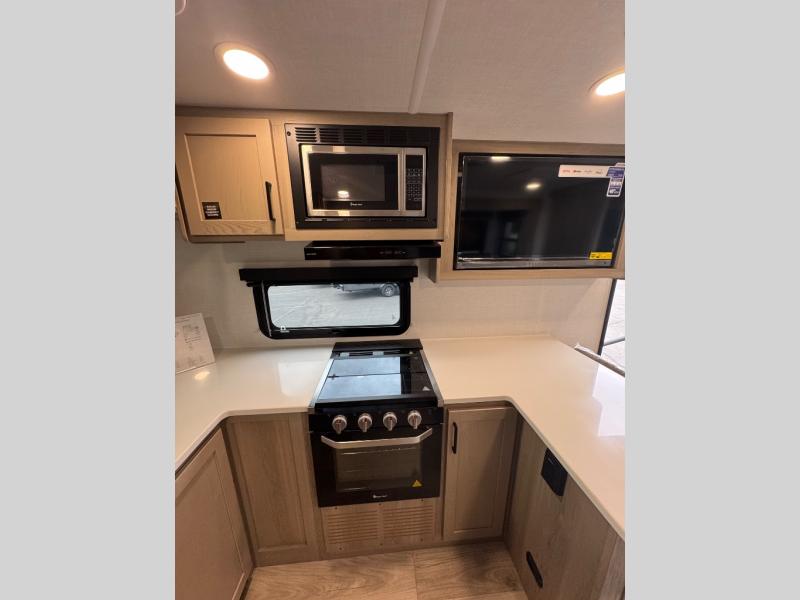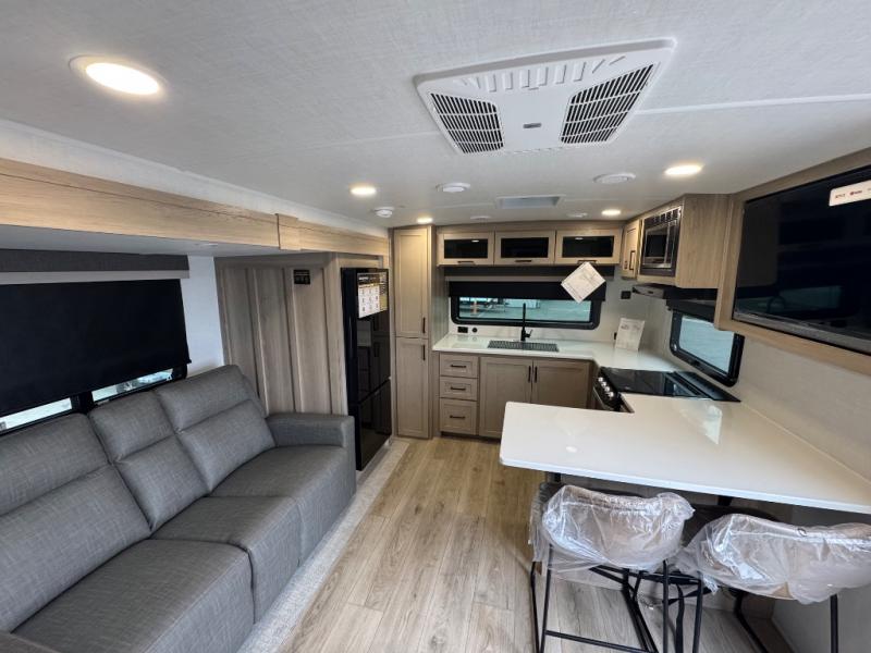 This travel trailer is the best option for you and your partner! The lavish full rear bathroom features a spacious layout and a convenient linen closet, perfect for relaxation and refreshment. The elegant bedroom boasts a plush queen bed, ample wardrobe space, and stylish dresser, creating a serene retreat. The spacious living room and kitchen combined area is the heart of the trailer, featuring plush theater seating for cozy movie nights, a generous closet for storing essentials, and a 12V Smart TV for entertainment on the go. Plus, the expansive countertop with chairs provides a perfect spot for gourmet meals or socializing, while the premium three-burner cooktop, well-stocked kitchen pantry, and high-performance microwave make meal prep and cooking a true delight.
