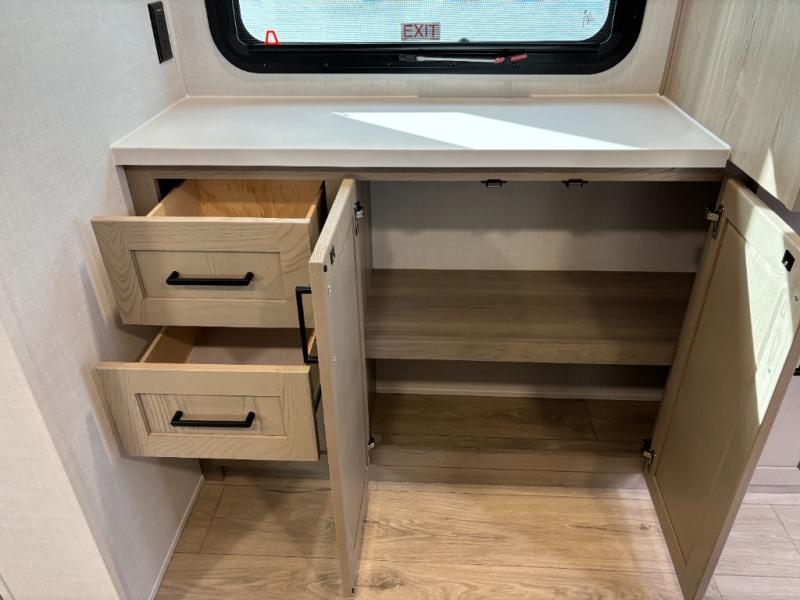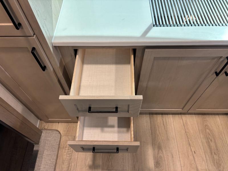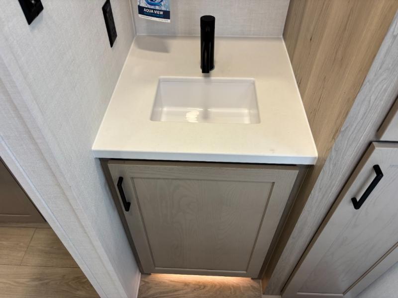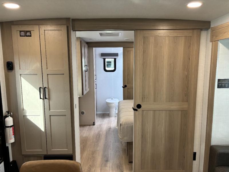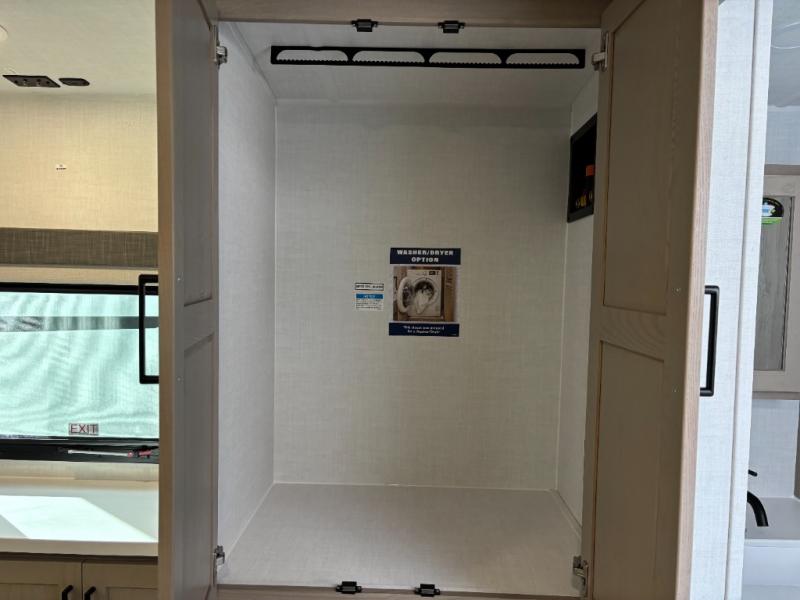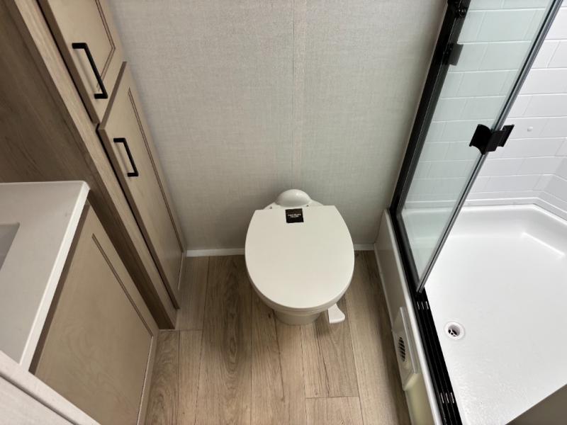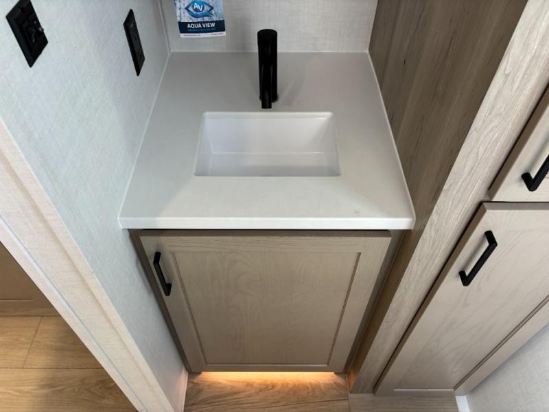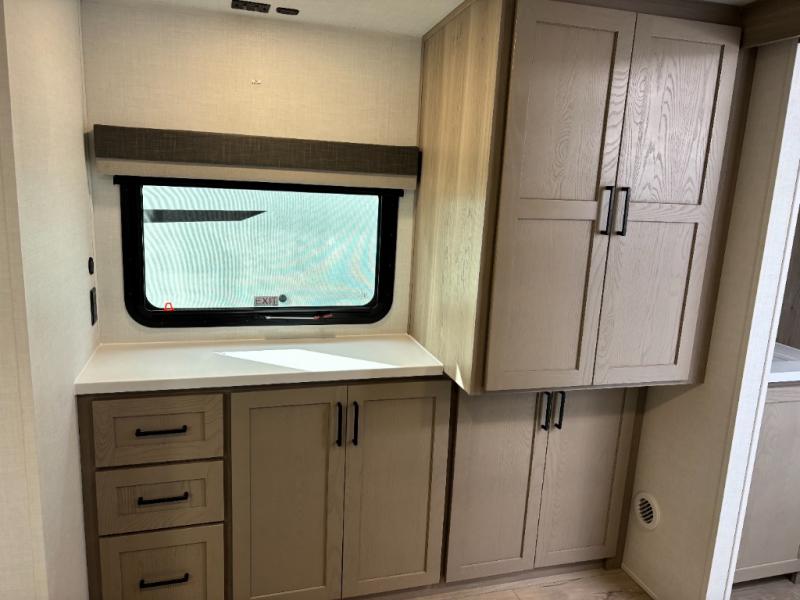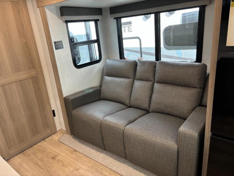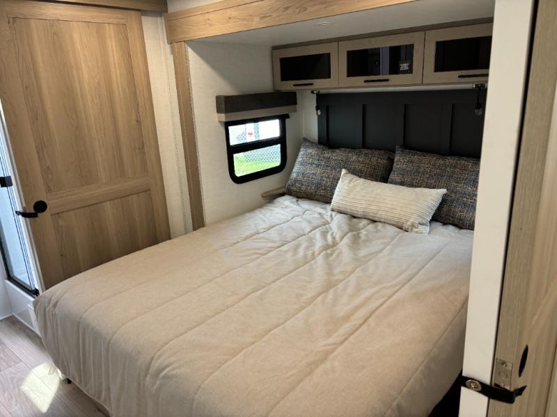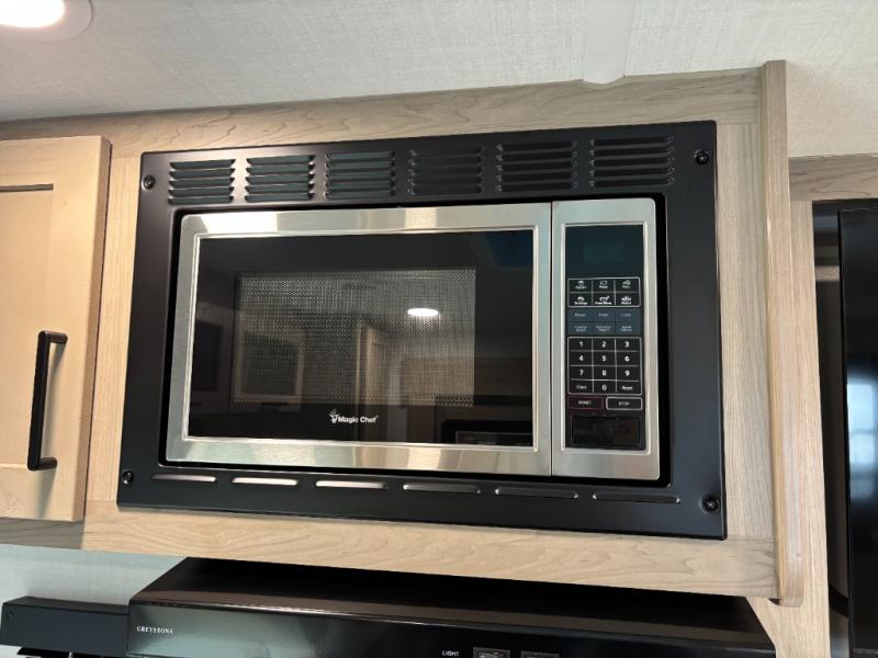 This travel trailer is the best option for you and your partner! The lavish full rear bathroom features a spacious layout and a convenient linen closet, perfect for relaxation and refreshment. The elegant bedroom boasts a plush queen bed, ample wardrobe space, and stylish dresser, creating a serene retreat. The spacious living room and kitchen combined area is the heart of the trailer, featuring plush theater seating for cozy movie nights, a generous closet for storing essentials, and a 12V Smart TV for entertainment on the go. Plus, the expansive countertop with chairs provides a perfect spot for gourmet meals or socializing, while the premium three-burner cooktop, well-stocked kitchen pantry, and high-performance microwave make meal prep and cooking a true delight.