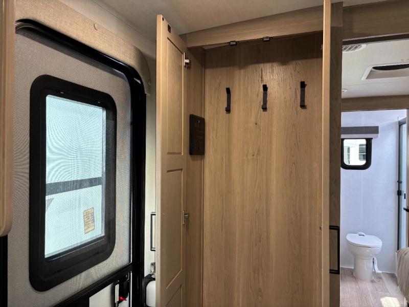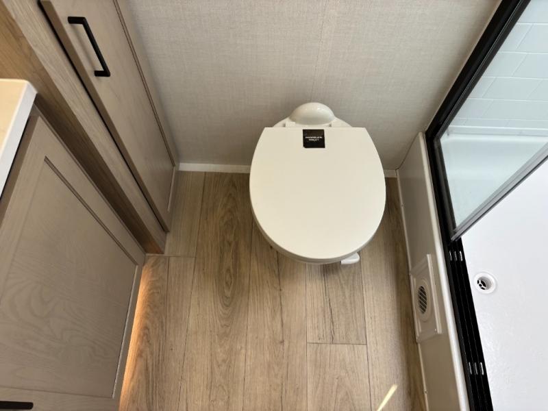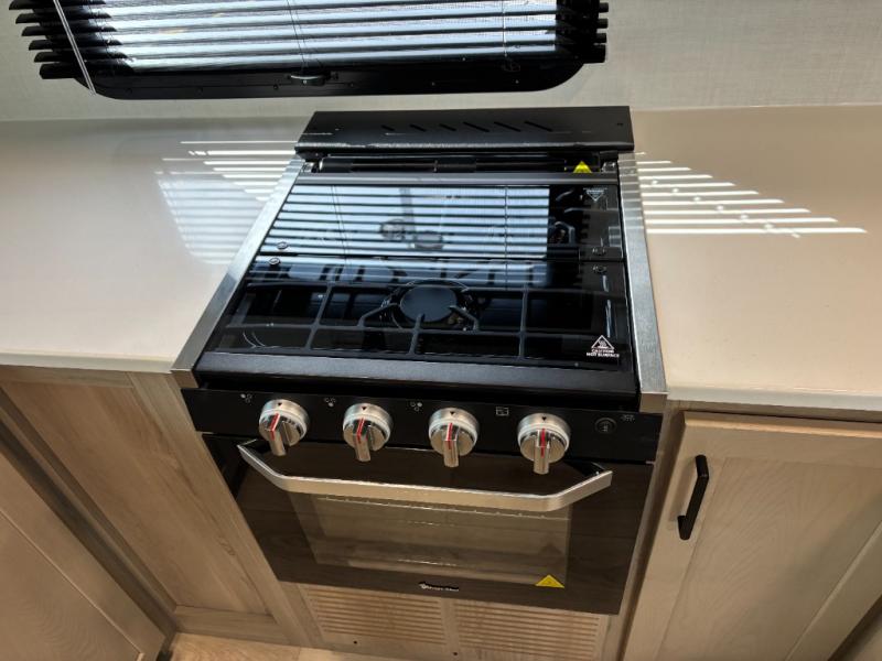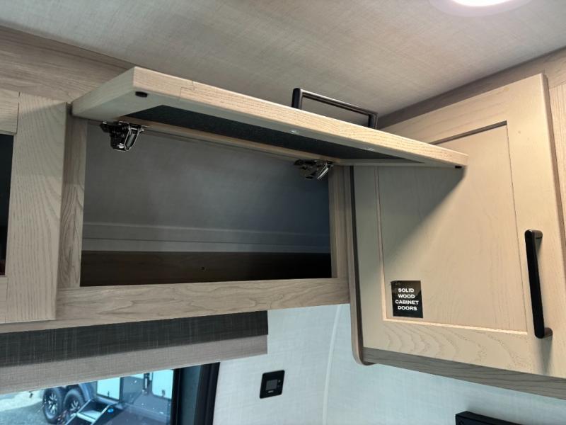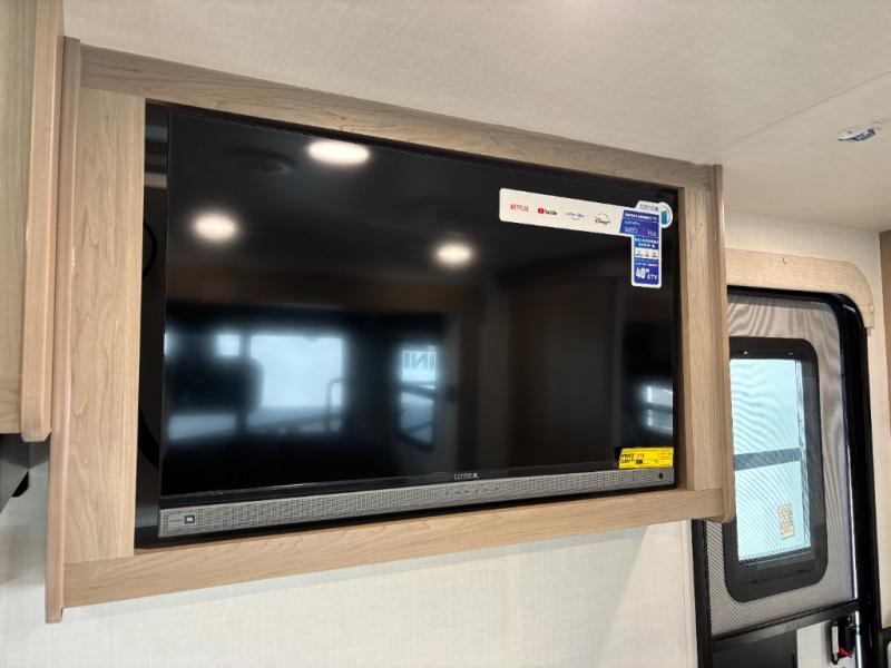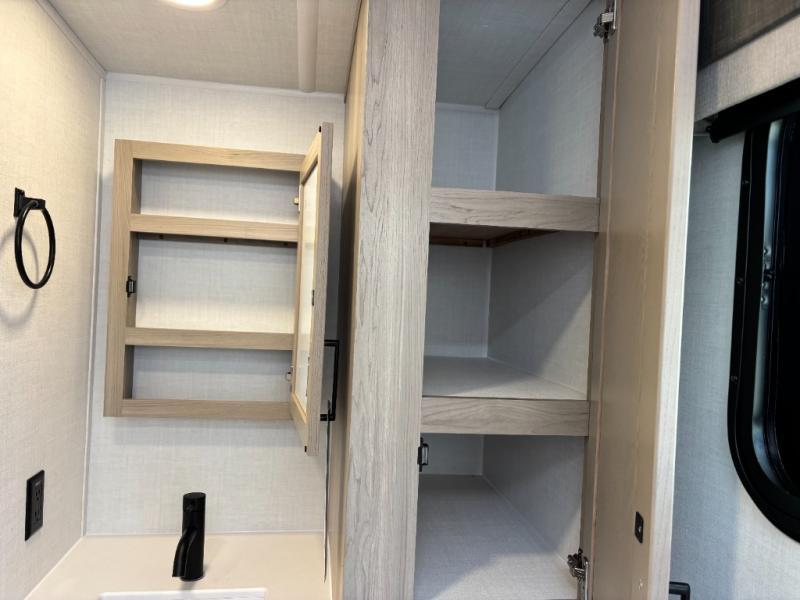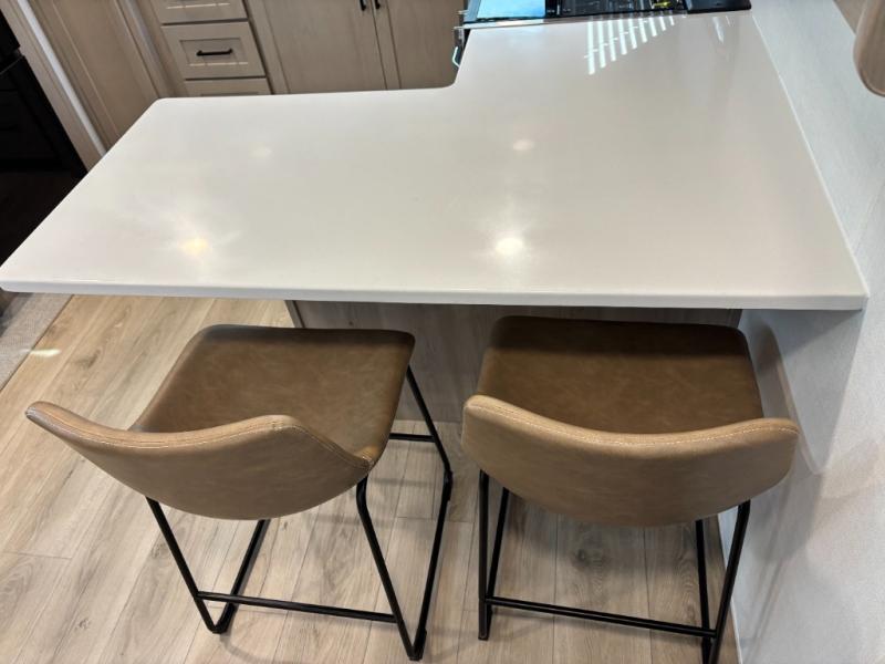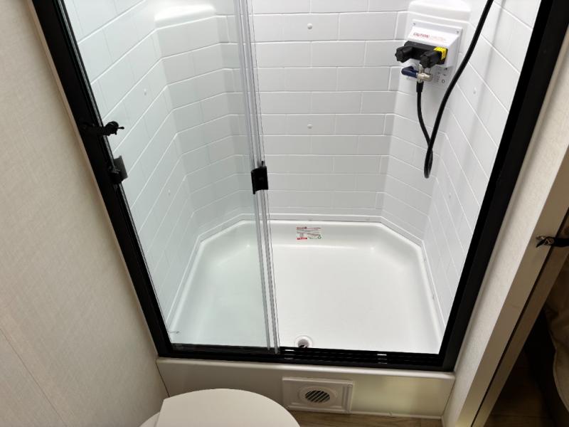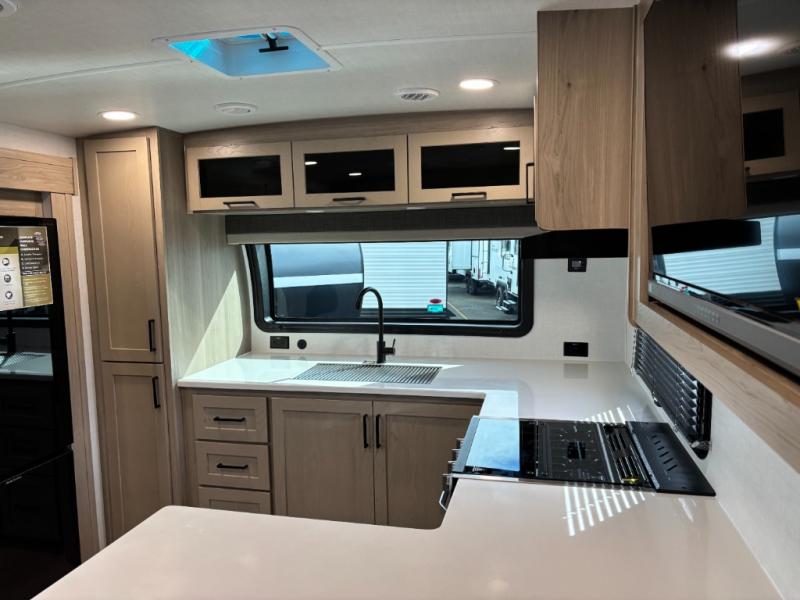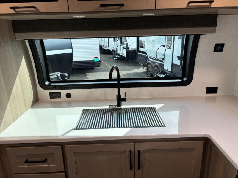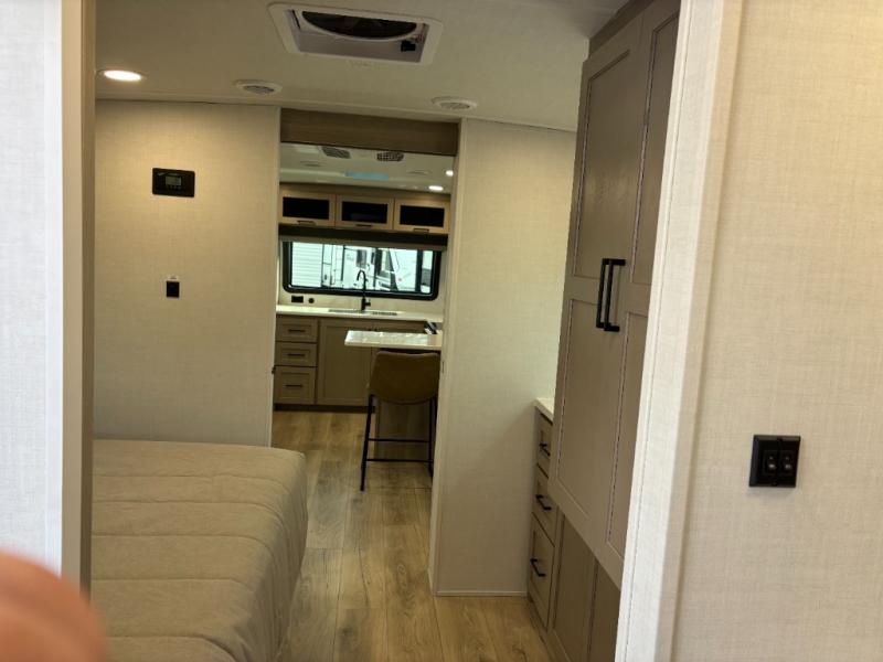 This travel trailer is the best option for you and your partner! The lavish full rear bathroom features a spacious layout and a convenient linen closet, perfect for relaxation and refreshment. The elegant bedroom boasts a plush queen bed, ample wardrobe space, and stylish dresser, creating a serene retreat. The spacious living room and kitchen combined area is the heart of the trailer, featuring plush theater seating for cozy movie nights, a generous closet for storing essentials, and a 12V Smart TV for entertainment on the go. Plus, the expansive countertop with chairs provides a perfect spot for gourmet meals or socializing, while the premium three-burner cooktop, well-stocked kitchen pantry, and high-performance microwave make meal prep and cooking a true delight.