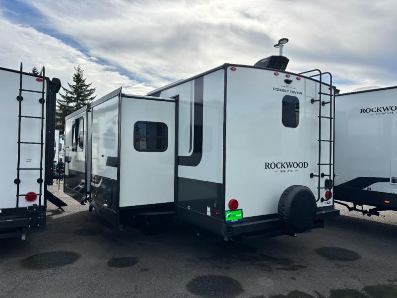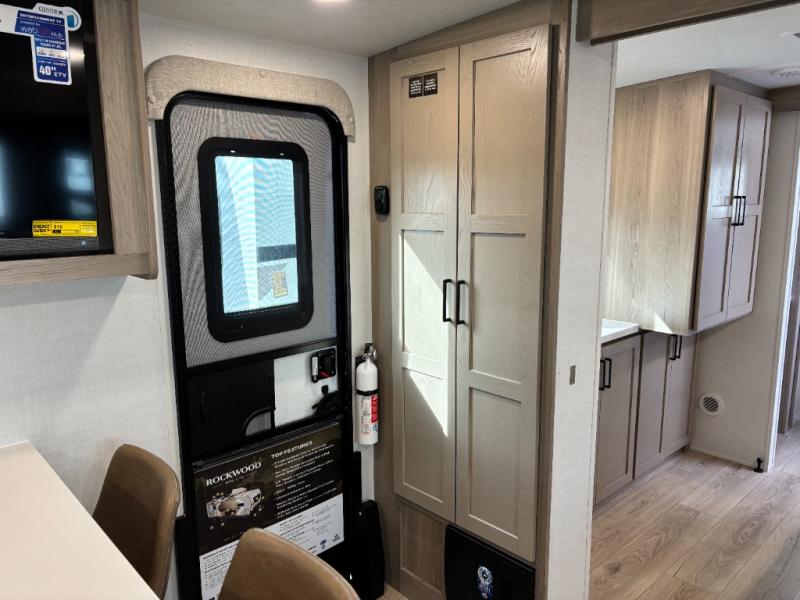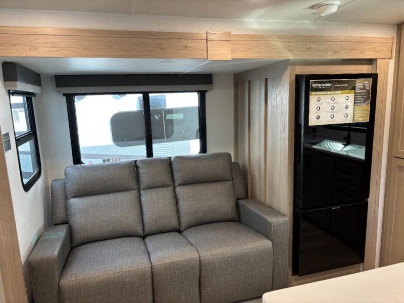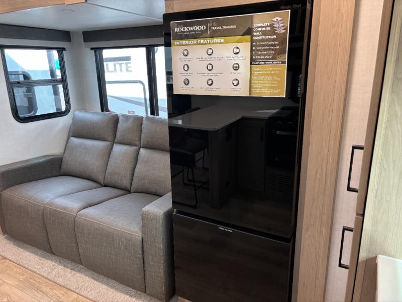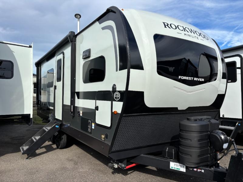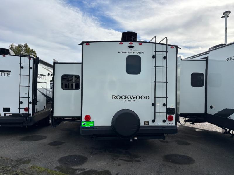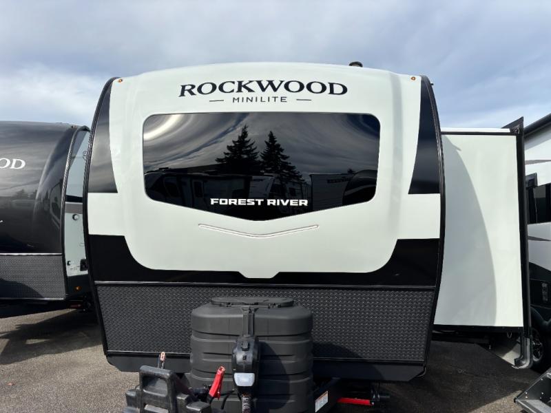 Each Rockwood Mini Lite travel trailer by Forest River is constructed with a fully laminated one-piece walkable roof, sleek frameless windows, and a six-sided full aluminum frame for strength and durability. The 12V thermostatically controlled heated tanks, plus radiant foil in the underbelly will allow you to camp well into the colder months, and the 200W roof solar panel will be perfect for a little off-gridding. Each model includes solid surface kitchen countertops, hidden hinge cabinet doors, roller shades, plus many more interior features. Having an AIR 360+ omnidirectional antenna with WiFi prep on board gives you the option to get some work done if it's needed, and the power tongue jack provides hassle-free set up, so you can enjoy more time relaxing!