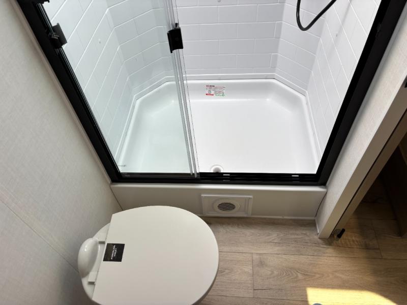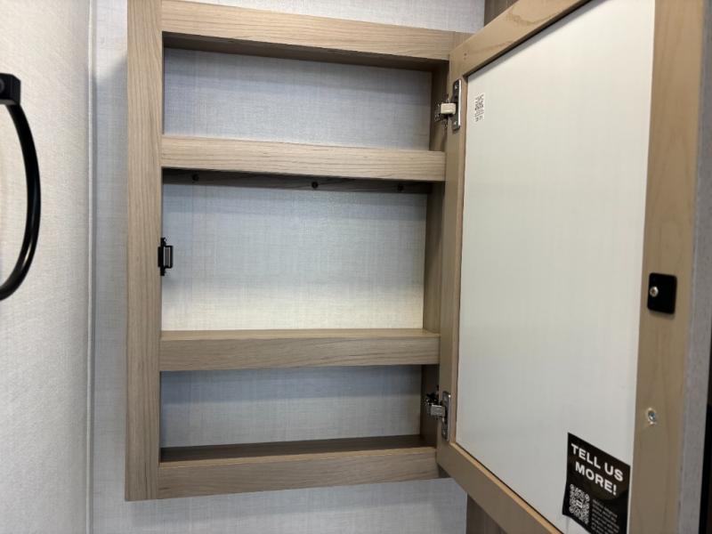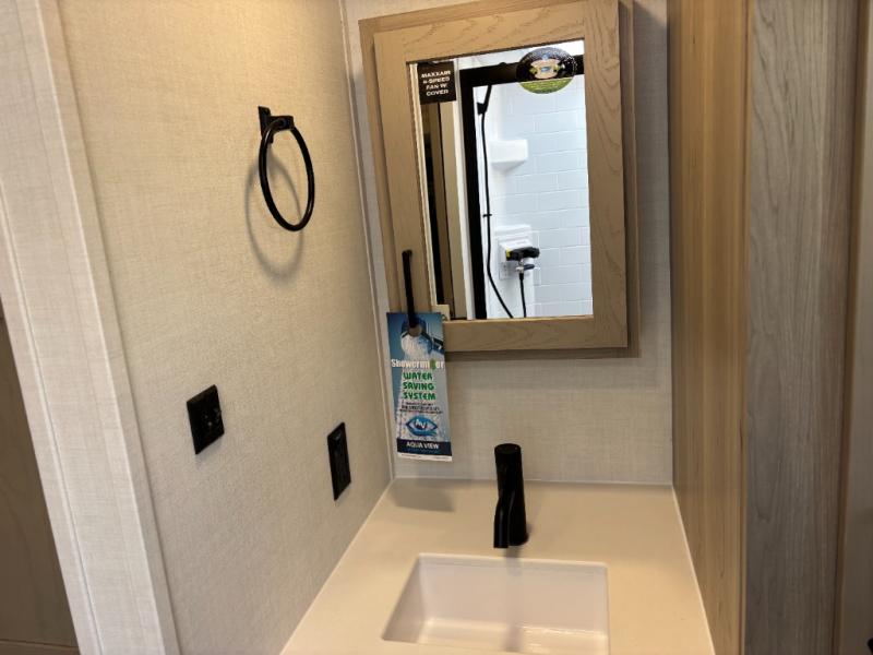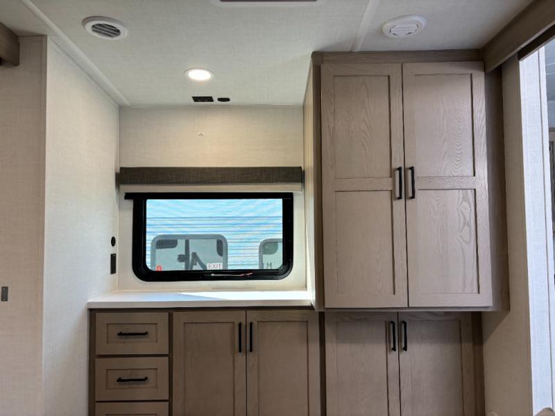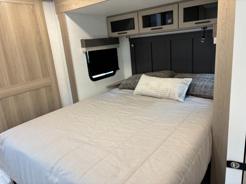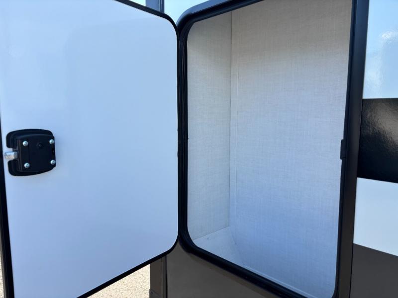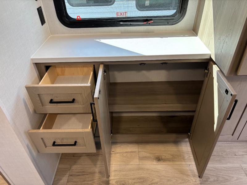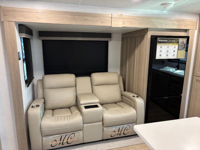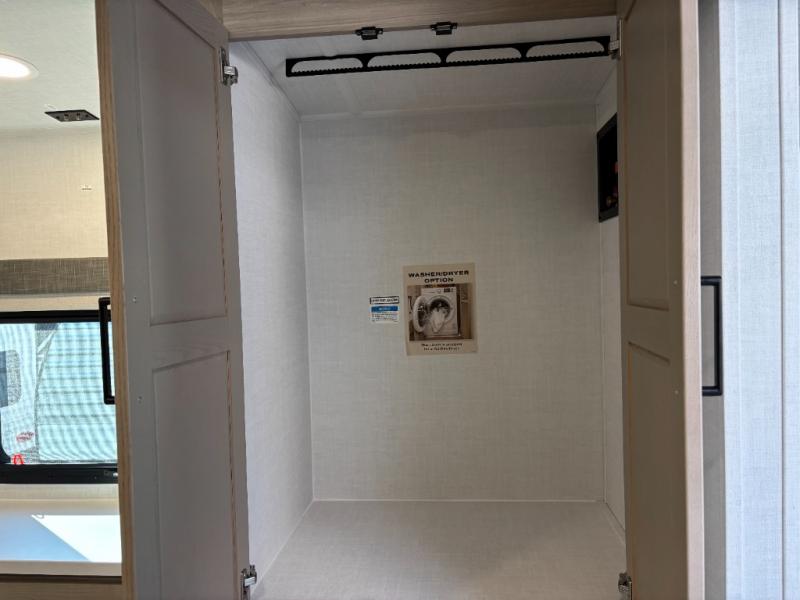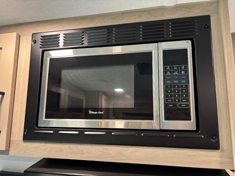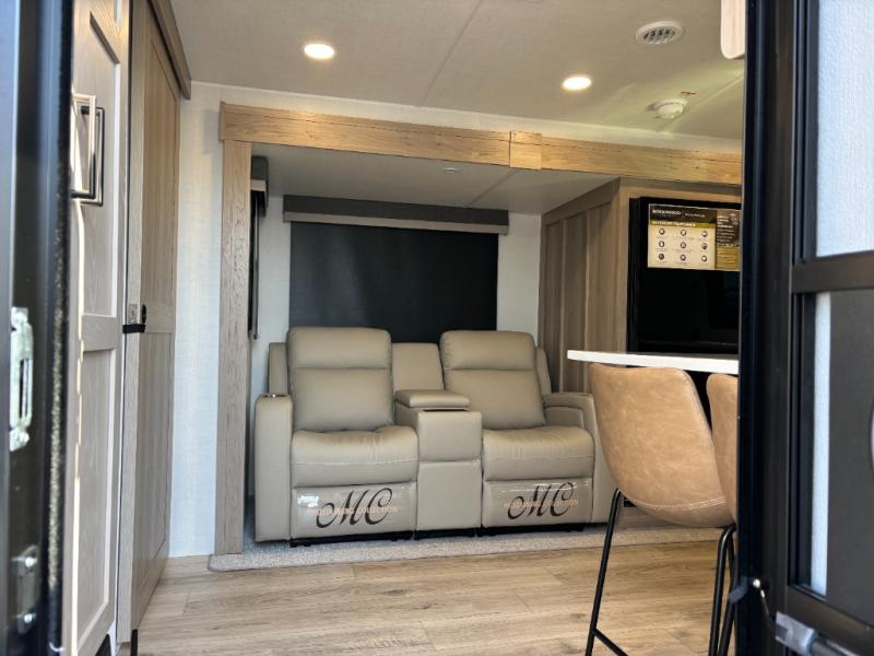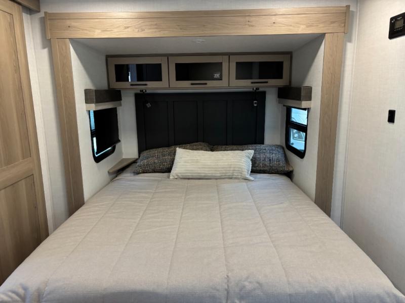 This travel trailer is the best option for you and your partner! The lavish full rear bathroom features a spacious layout and a convenient linen closet, perfect for relaxation and refreshment. The elegant bedroom boasts a plush queen bed, ample wardrobe space, and stylish dresser, creating a serene retreat. The spacious living room and kitchen combined area is the heart of the trailer, featuring plush theater seating for cozy movie nights, a generous closet for storing essentials, and a 12V Smart TV for entertainment on the go. Plus, the expansive countertop with chairs provides a perfect spot for gourmet meals or socializing, while the premium three-burner cooktop, well-stocked kitchen pantry, and high-performance microwave make meal prep and cooking a true delight.
