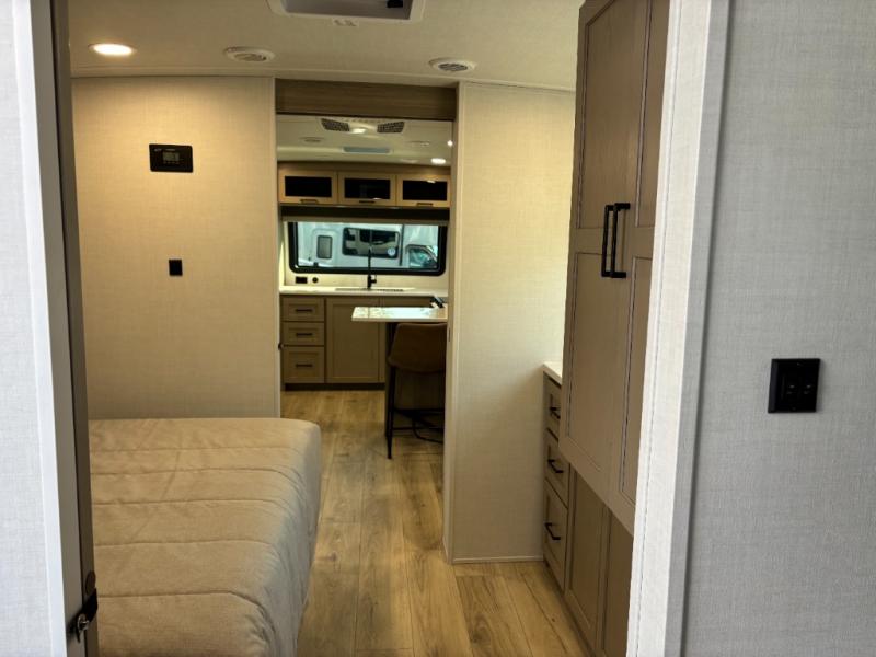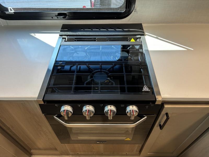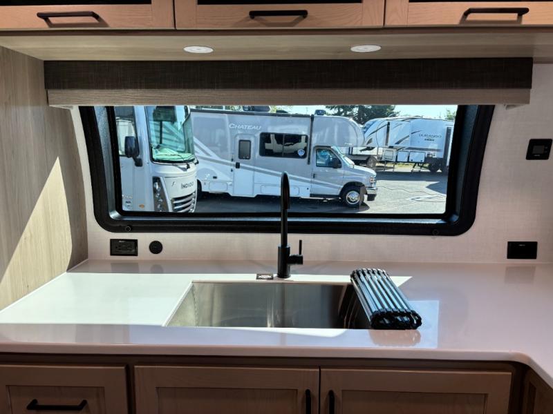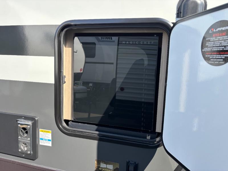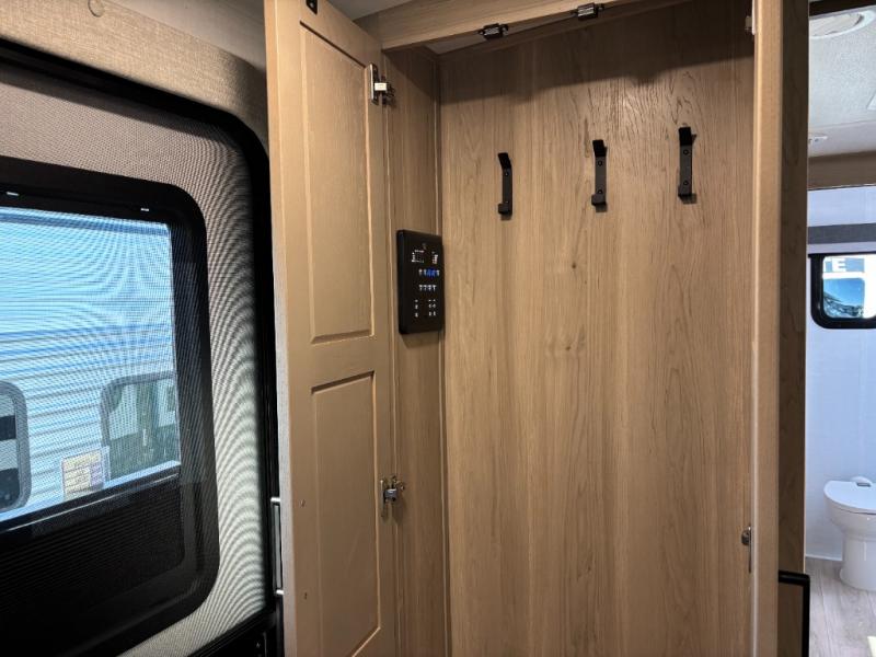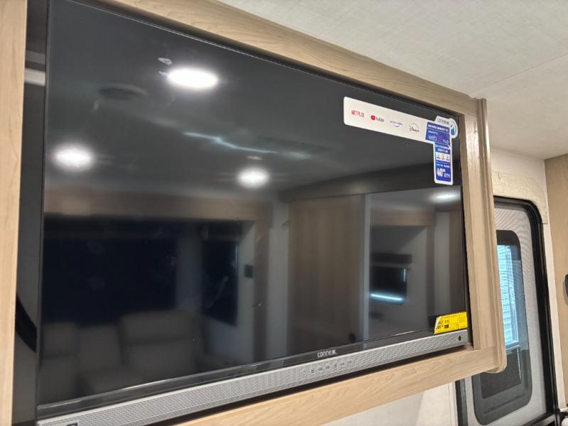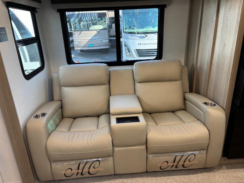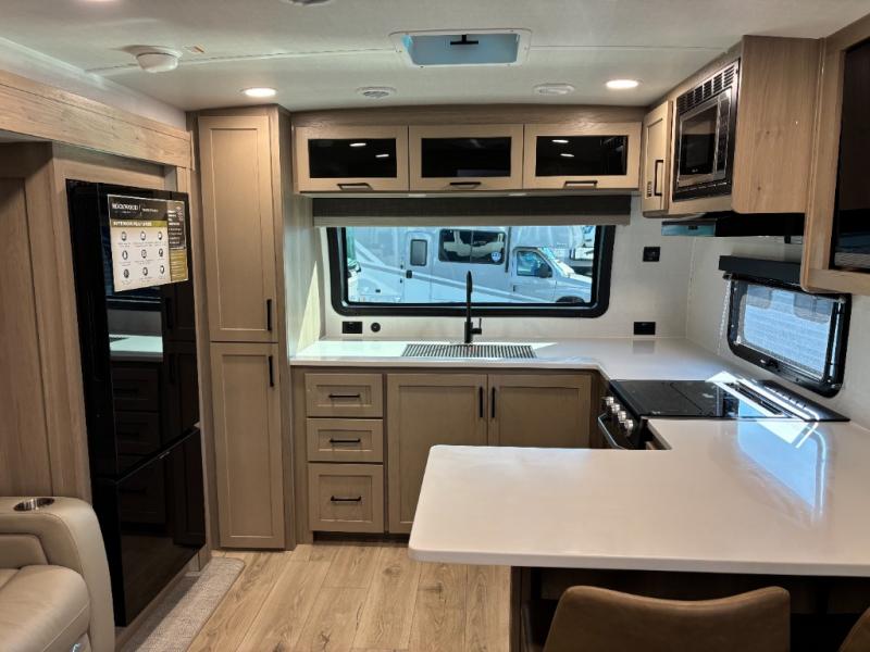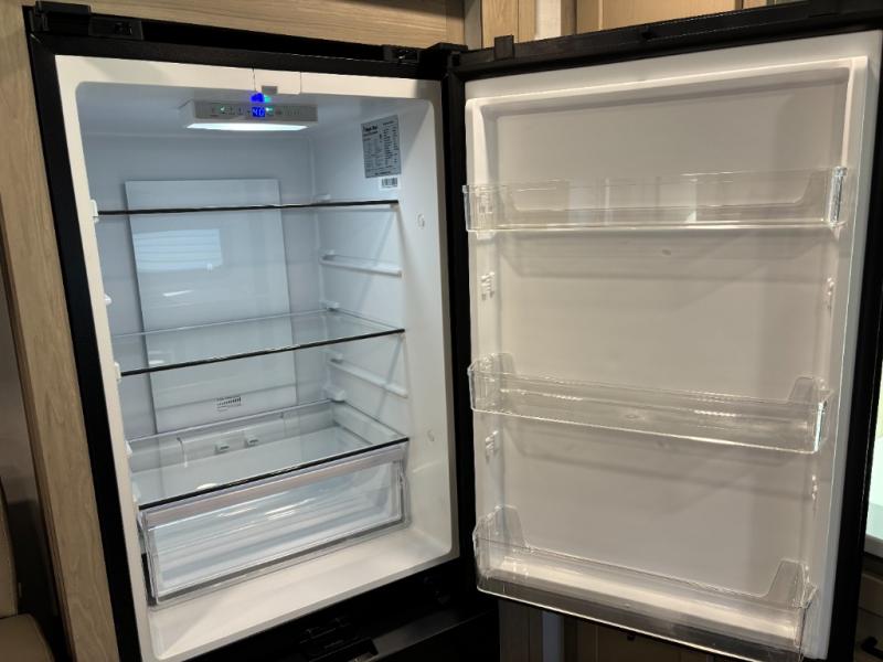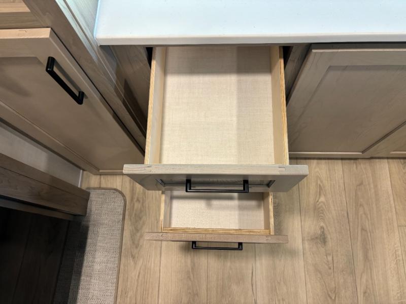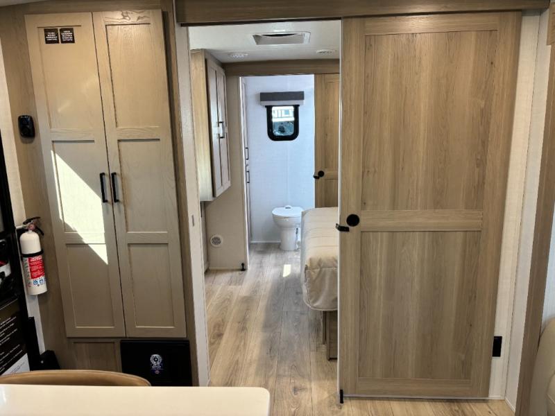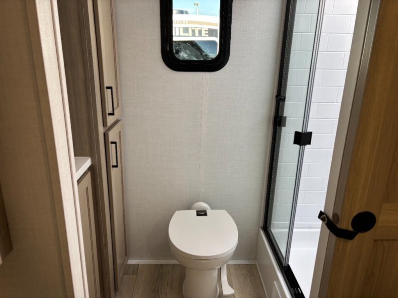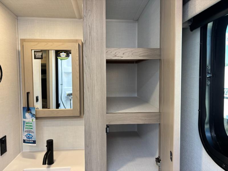 This travel trailer is the best option for you and your partner! The lavish full rear bathroom features a spacious layout and a convenient linen closet, perfect for relaxation and refreshment. The elegant bedroom boasts a plush queen bed, ample wardrobe space, and stylish dresser, creating a serene retreat. The spacious living room and kitchen combined area is the heart of the trailer, featuring plush theater seating for cozy movie nights, a generous closet for storing essentials, and a 12V Smart TV for entertainment on the go. Plus, the expansive countertop with chairs provides a perfect spot for gourmet meals or socializing, while the premium three-burner cooktop, well-stocked kitchen pantry, and high-performance microwave make meal prep and cooking a true delight.