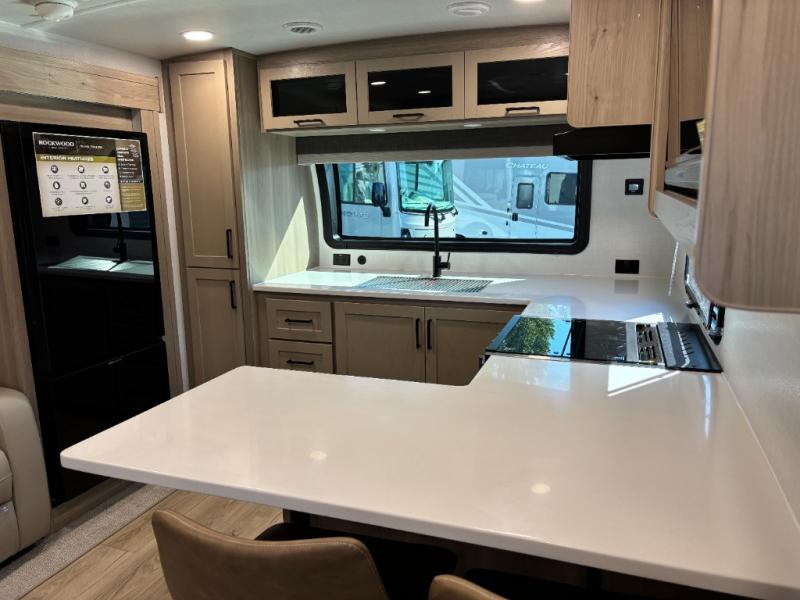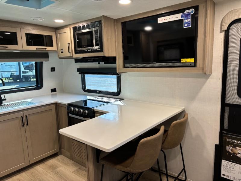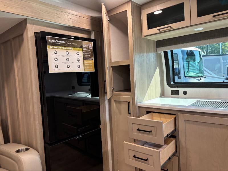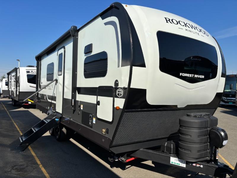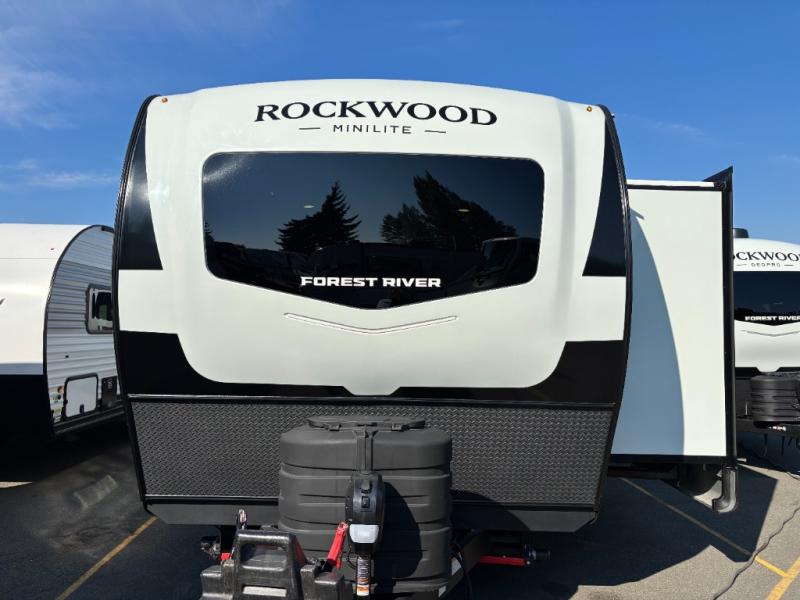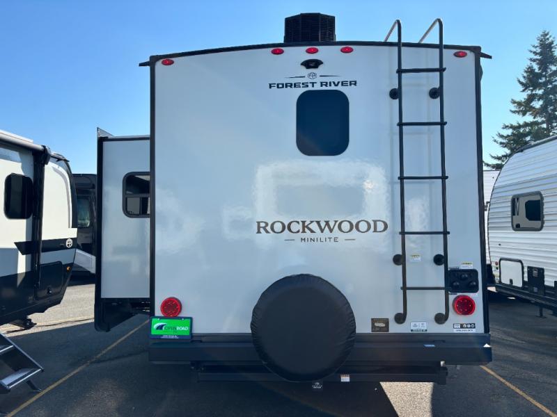 Each Rockwood Mini Lite travel trailer by Forest River is constructed with a fully laminated one-piece walkable roof, sleek frameless windows, and a six-sided full aluminum frame for strength and durability. The 12V thermostatically controlled heated tanks, plus radiant foil in the underbelly will allow you to camp well into the colder months, and the 200W roof solar panel will be perfect for a little off-gridding. Each model includes solid surface kitchen countertops, hidden hinge cabinet doors, roller shades, plus many more interior features. Having an AIR 360+ omnidirectional antenna with WiFi prep on board gives you the option to get some work done if it's needed, and the power tongue jack provides hassle-free set up, so you can enjoy more time relaxing!