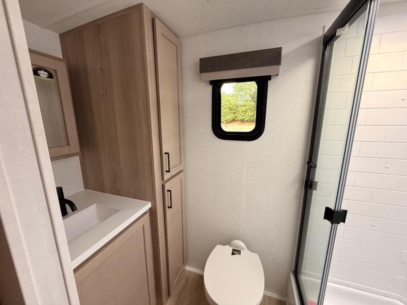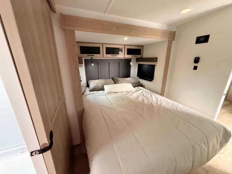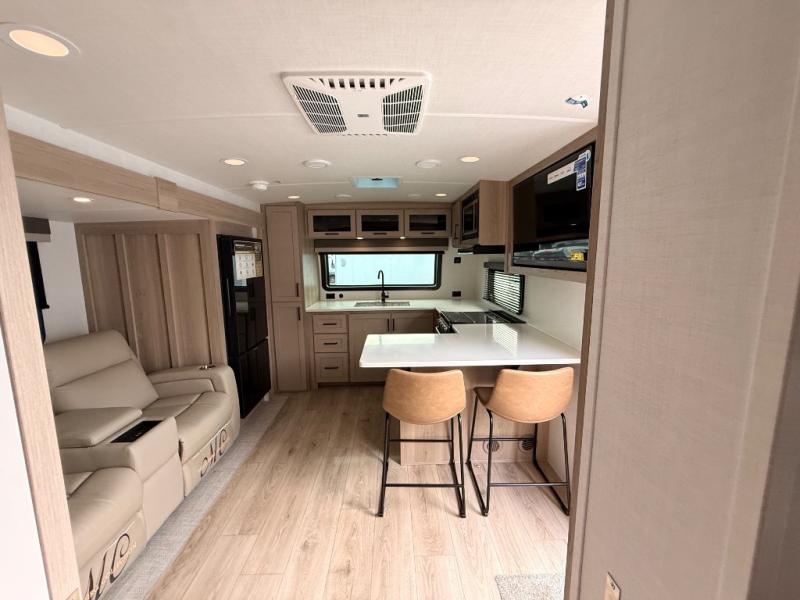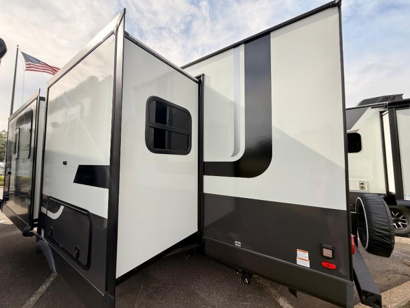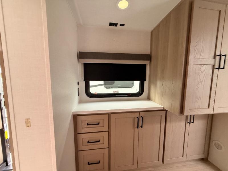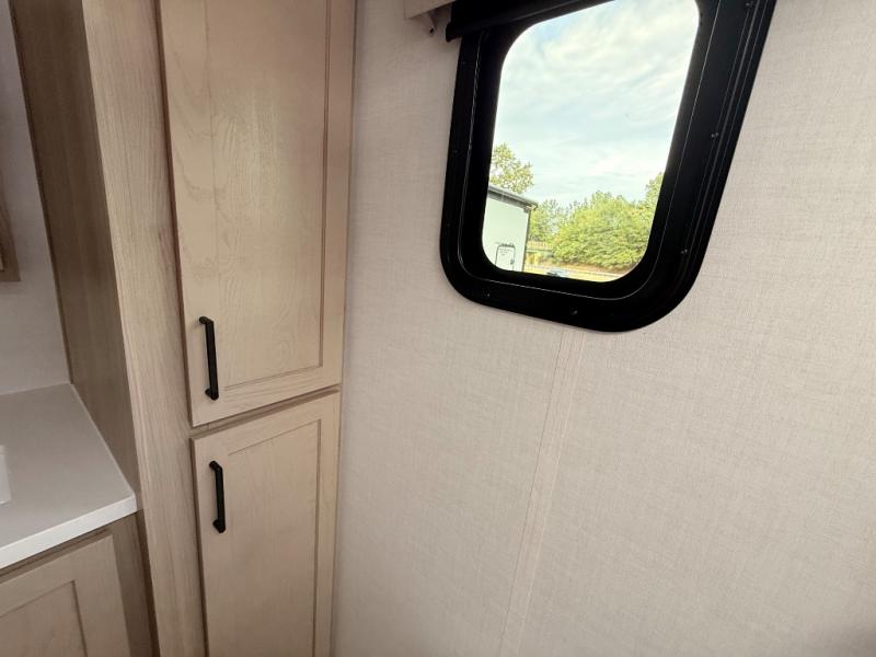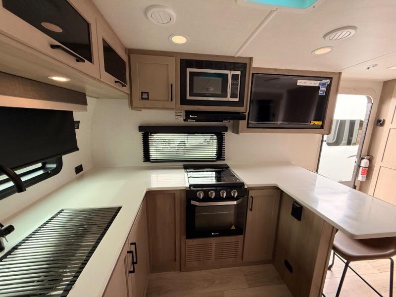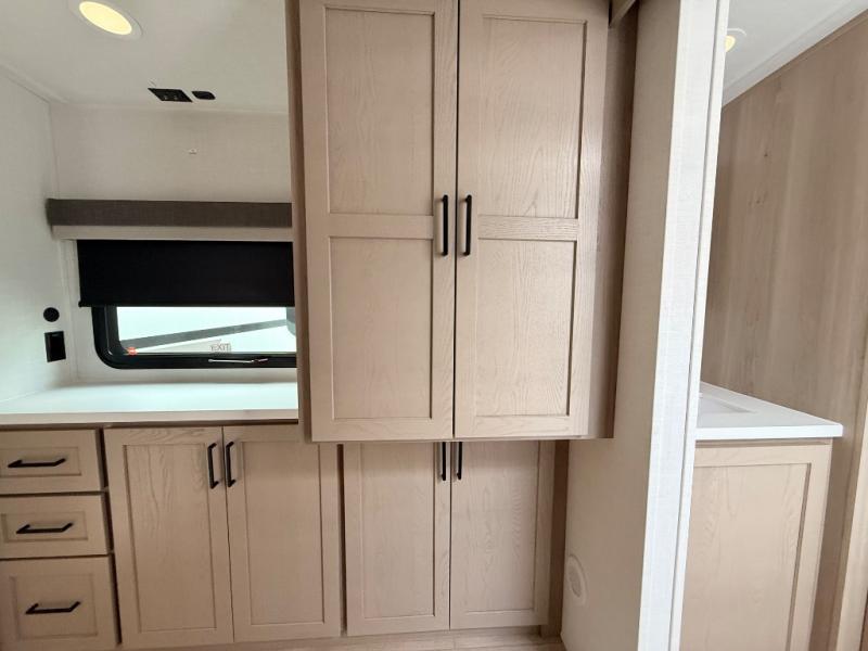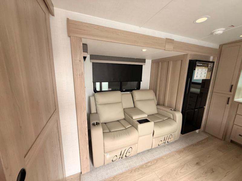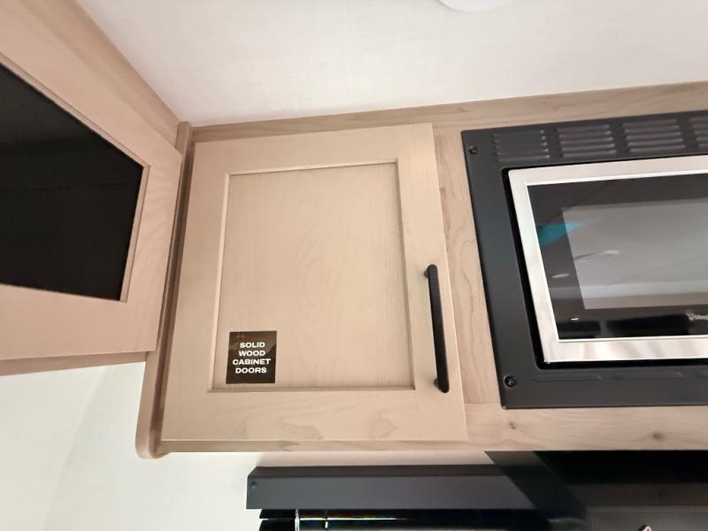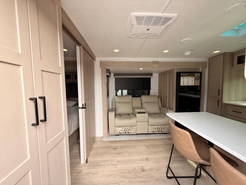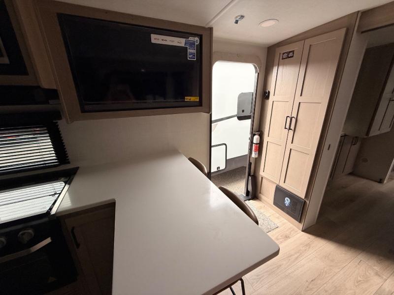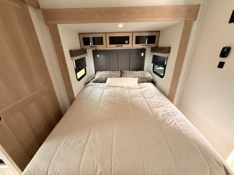 This travel trailer is the best option for you and your partner! The lavish full rear bathroom features a spacious layout and a convenient linen closet, perfect for relaxation and refreshment. The elegant bedroom boasts a plush queen bed, ample wardrobe space, and stylish dresser, creating a serene retreat. The spacious living room and kitchen combined area is the heart of the trailer, featuring plush theater seating for cozy movie nights, a generous closet for storing essentials, and a 12V Smart TV for entertainment on the go. Plus, the expansive countertop with chairs provides a perfect spot for gourmet meals or socializing, while the premium three-burner cooktop, well-stocked kitchen pantry, and high-performance microwave make meal prep and cooking a true delight.
