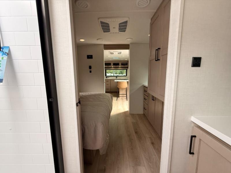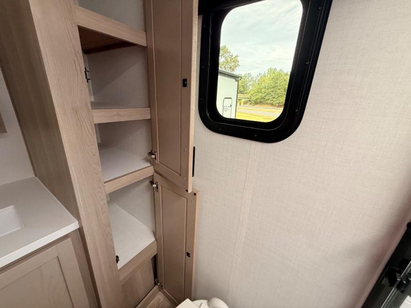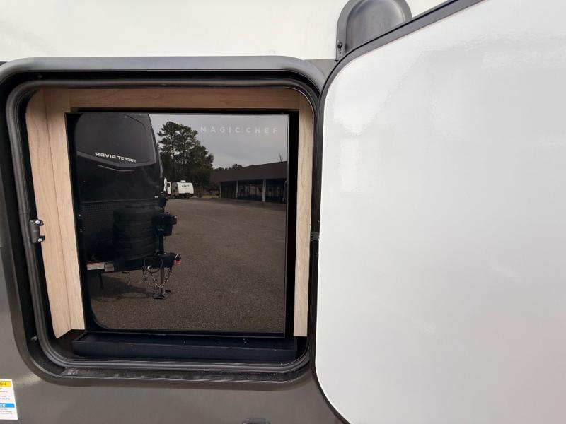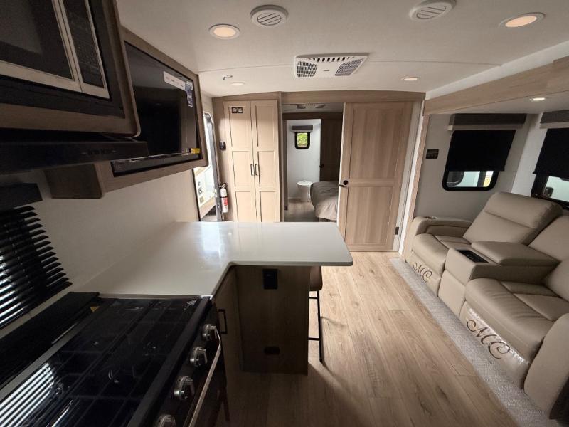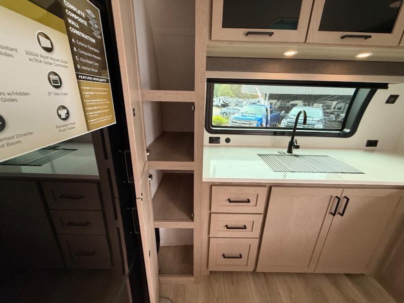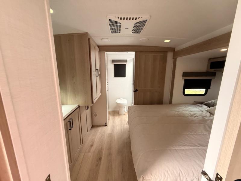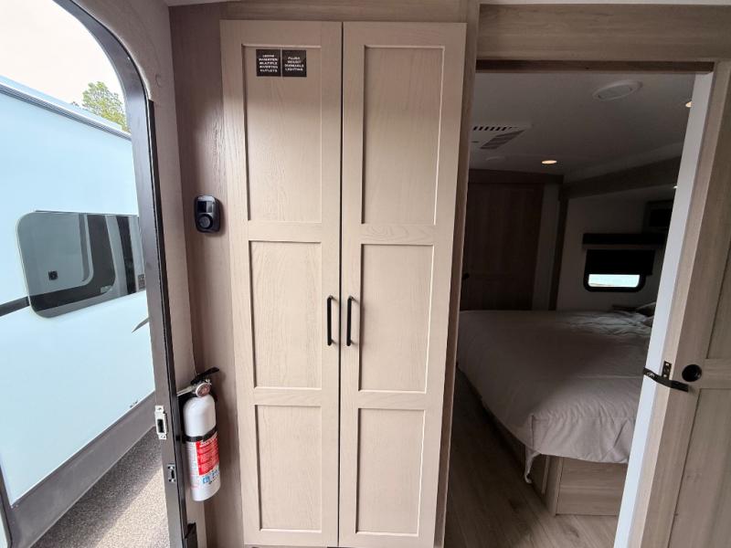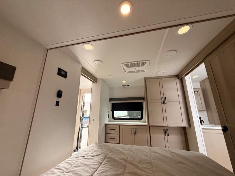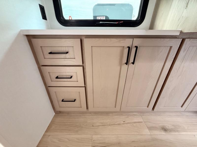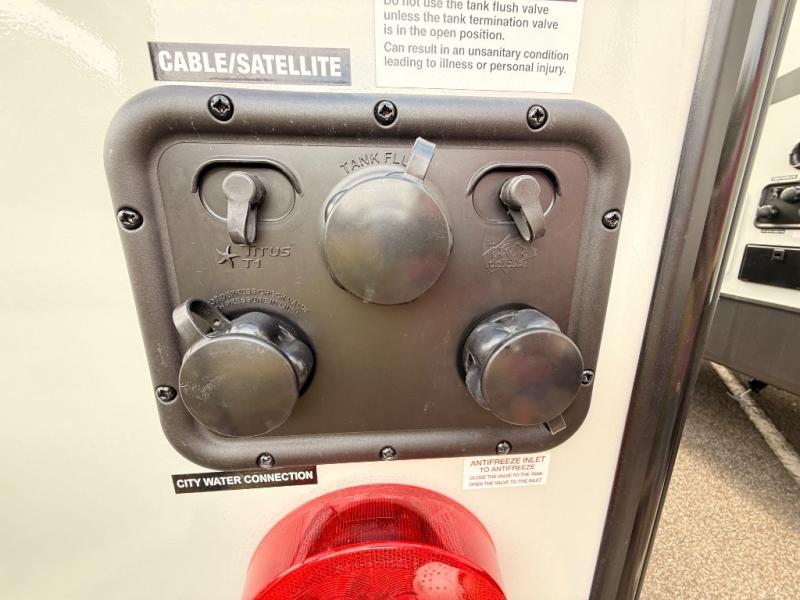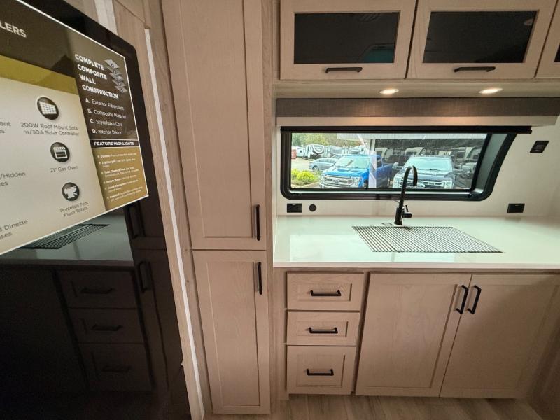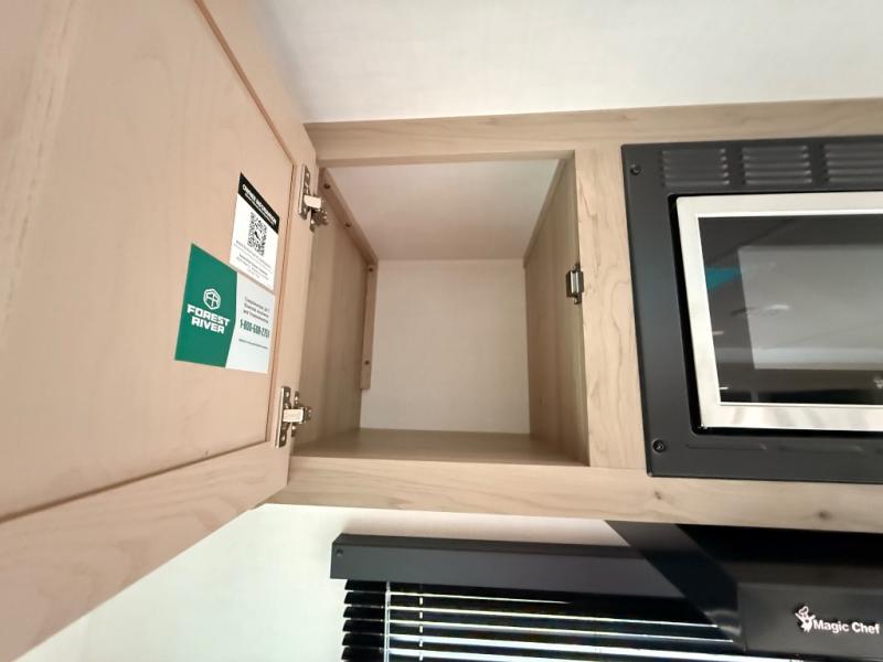 This travel trailer is the best option for you and your partner! The lavish full rear bathroom features a spacious layout and a convenient linen closet, perfect for relaxation and refreshment. The elegant bedroom boasts a plush queen bed, ample wardrobe space, and stylish dresser, creating a serene retreat. The spacious living room and kitchen combined area is the heart of the trailer, featuring plush theater seating for cozy movie nights, a generous closet for storing essentials, and a 12V Smart TV for entertainment on the go. Plus, the expansive countertop with chairs provides a perfect spot for gourmet meals or socializing, while the premium three-burner cooktop, well-stocked kitchen pantry, and high-performance microwave make meal prep and cooking a true delight.