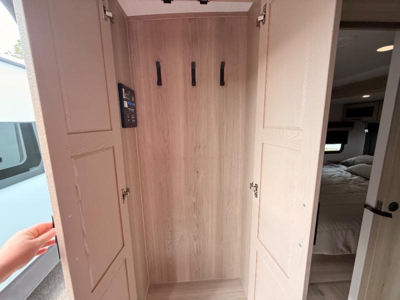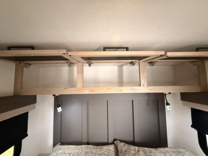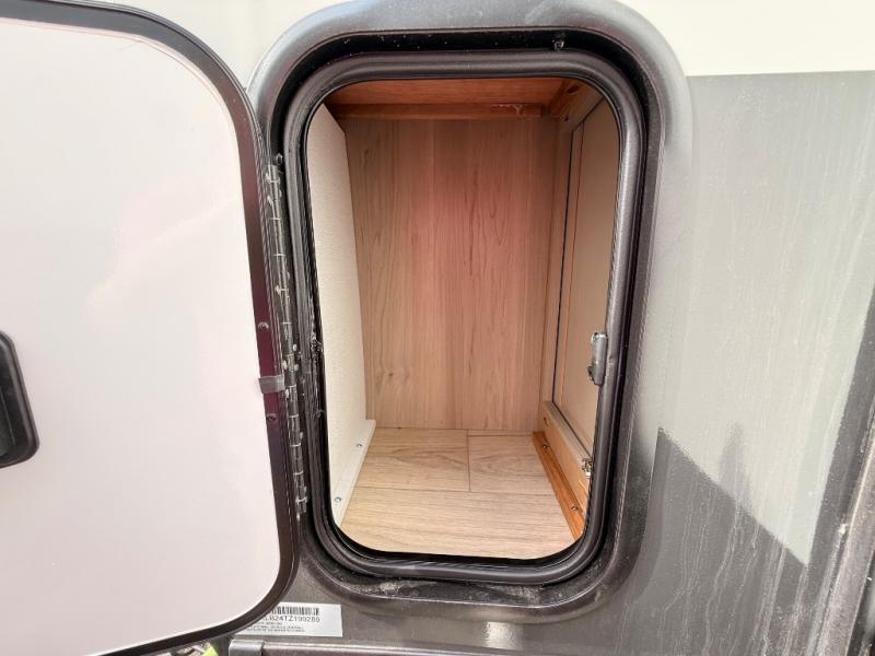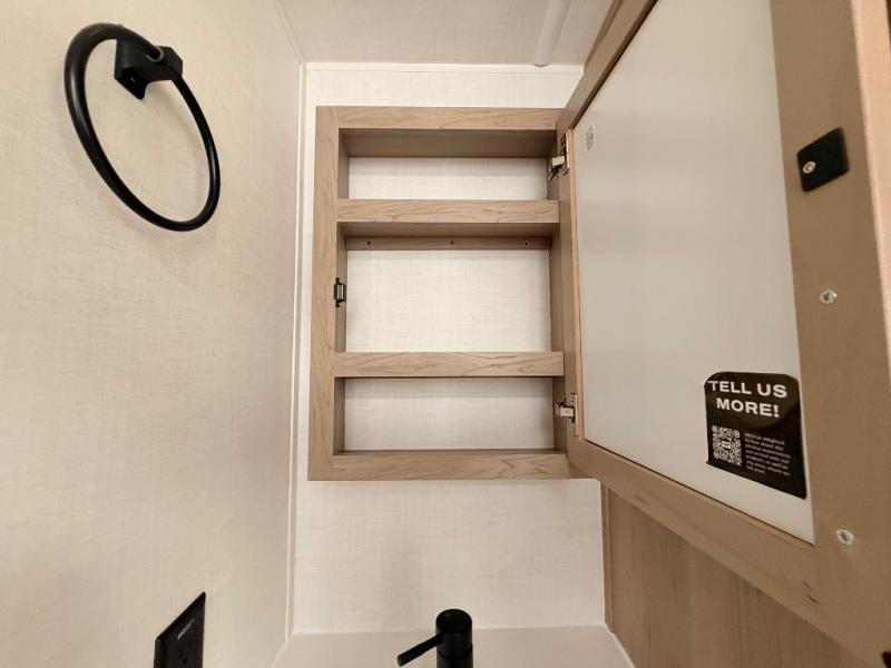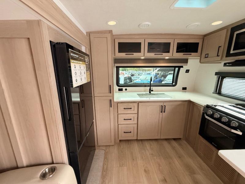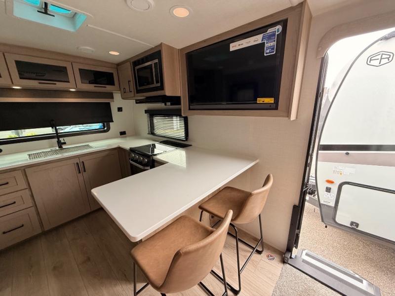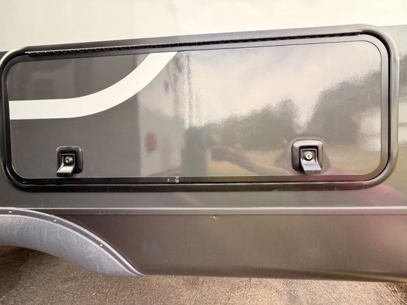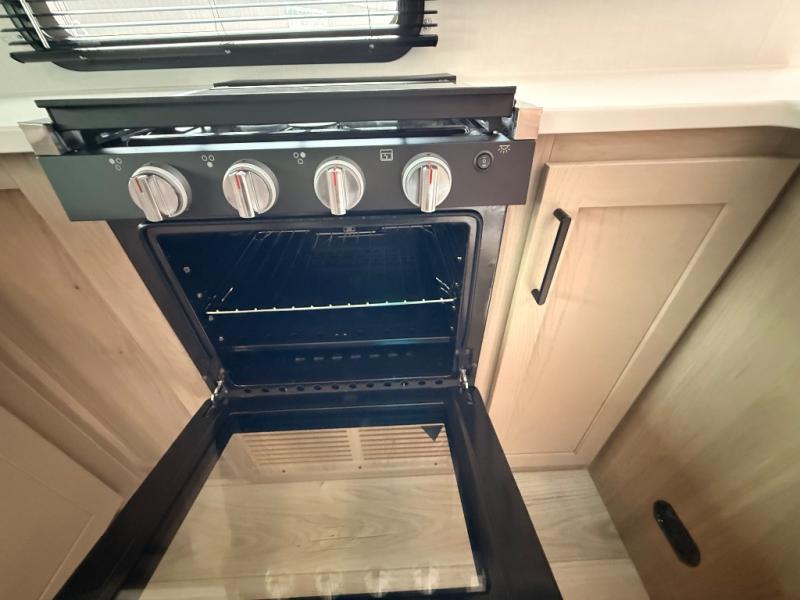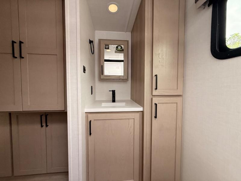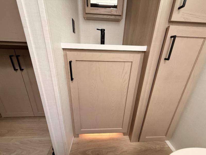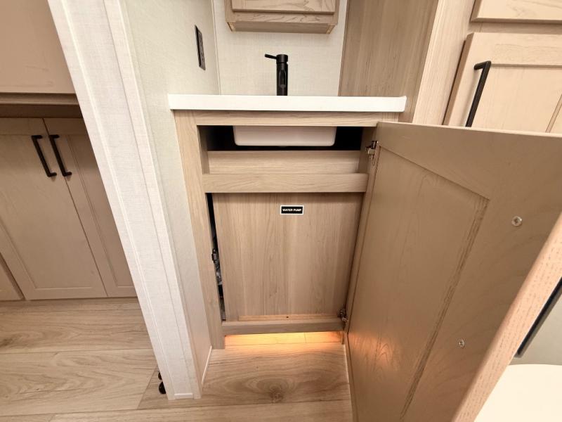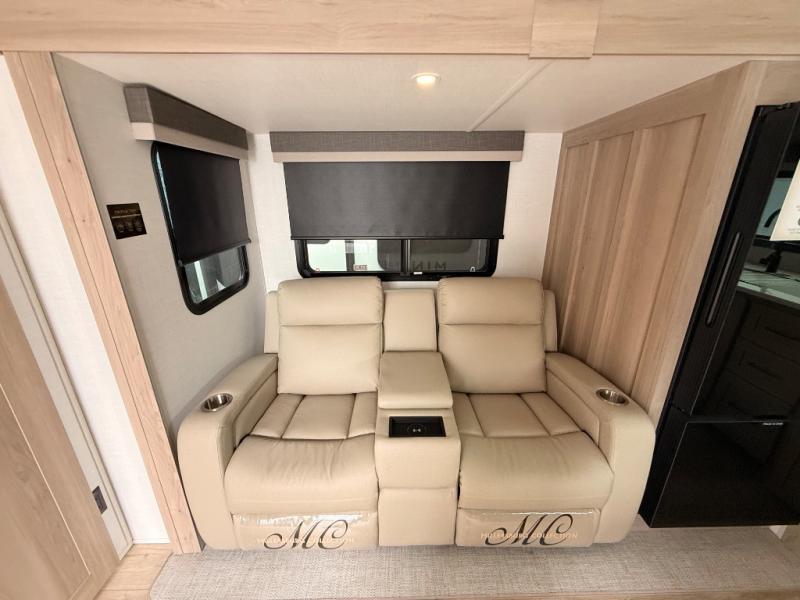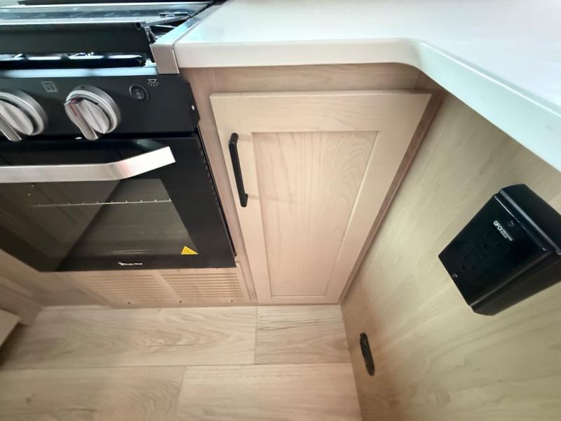 This travel trailer is the best option for you and your partner! The lavish full rear bathroom features a spacious layout and a convenient linen closet, perfect for relaxation and refreshment. The elegant bedroom boasts a plush queen bed, ample wardrobe space, and stylish dresser, creating a serene retreat. The spacious living room and kitchen combined area is the heart of the trailer, featuring plush theater seating for cozy movie nights, a generous closet for storing essentials, and a 12V Smart TV for entertainment on the go. Plus, the expansive countertop with chairs provides a perfect spot for gourmet meals or socializing, while the premium three-burner cooktop, well-stocked kitchen pantry, and high-performance microwave make meal prep and cooking a true delight.