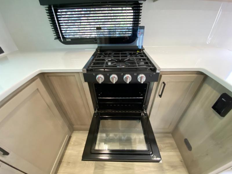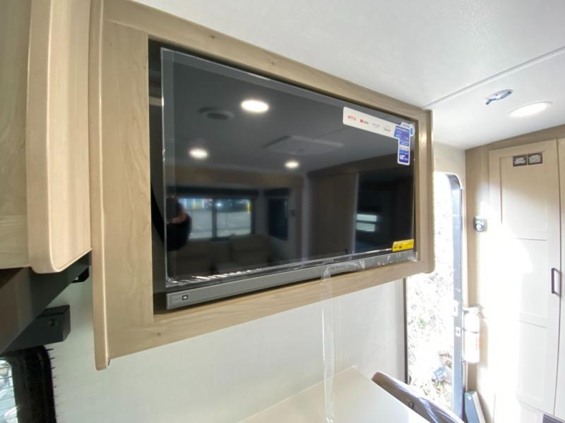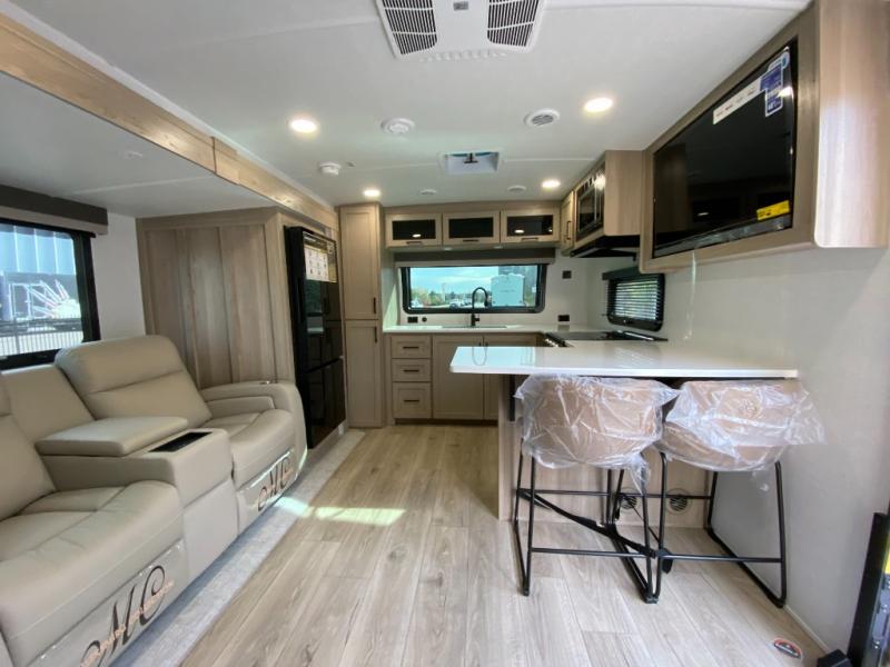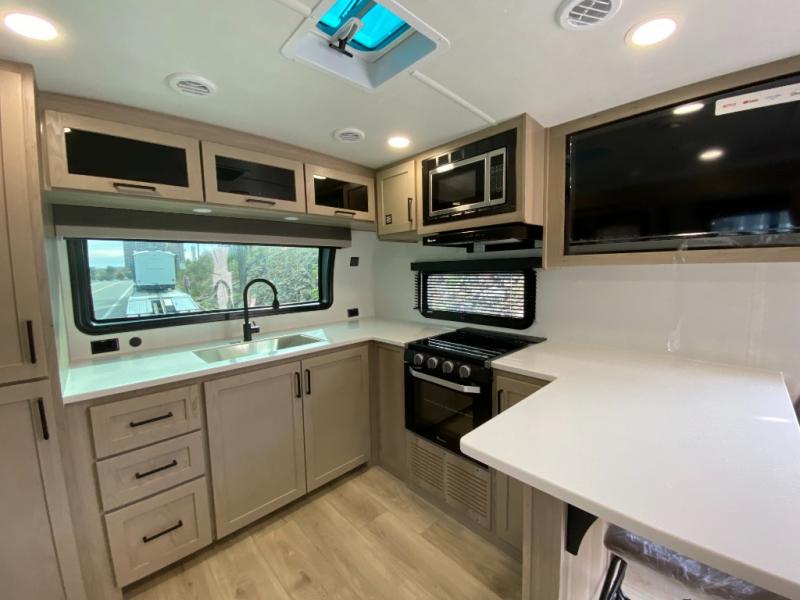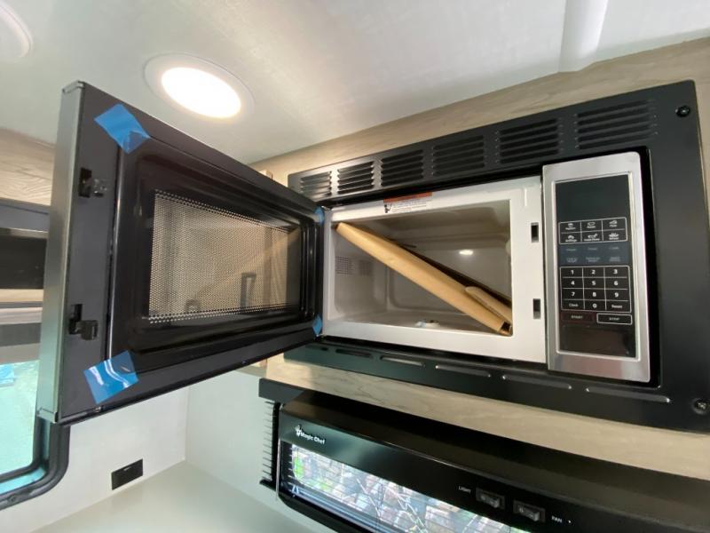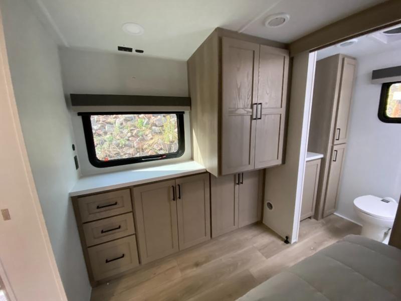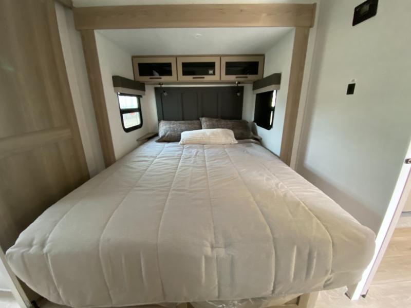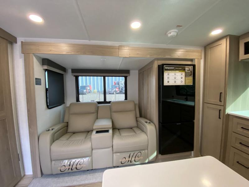 This travel trailer is the best option for you and your partner! The lavish full rear bathroom features a spacious layout and a convenient linen closet, perfect for relaxation and refreshment. The elegant bedroom boasts a plush queen bed, ample wardrobe space, and stylish dresser, creating a serene retreat. The spacious living room and kitchen combined area is the heart of the trailer, featuring plush theater seating for cozy movie nights, a generous closet for storing essentials, and a 12V Smart TV for entertainment on the go. Plus, the expansive countertop with chairs provides a perfect spot for gourmet meals or socializing, while the premium three-burner cooktop, well-stocked kitchen pantry, and high-performance microwave make meal prep and cooking a true delight.
