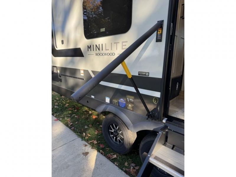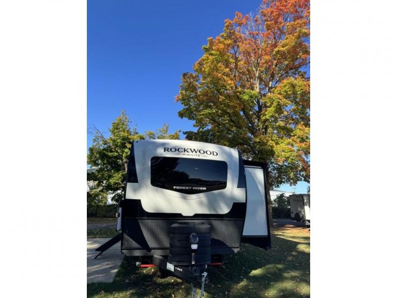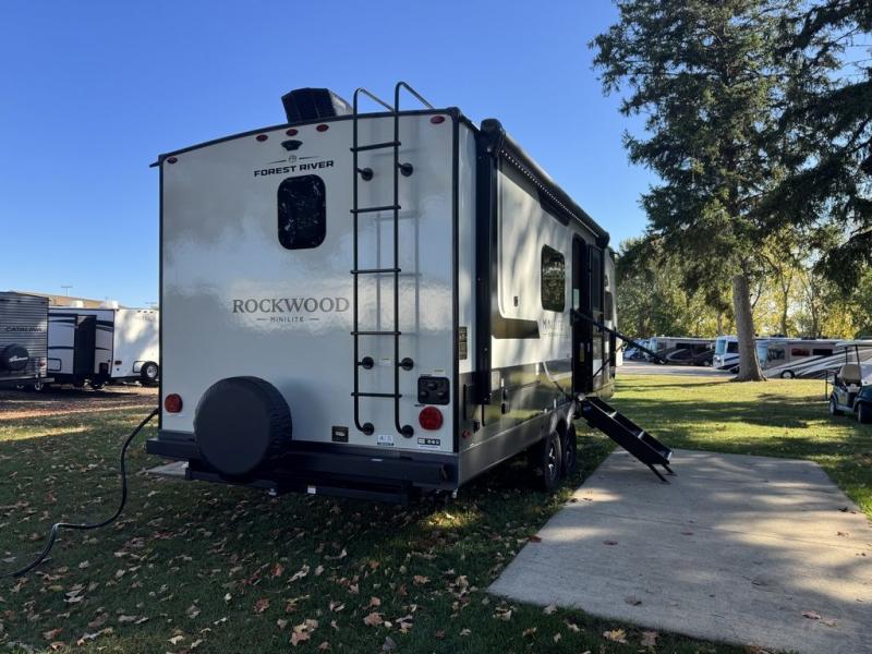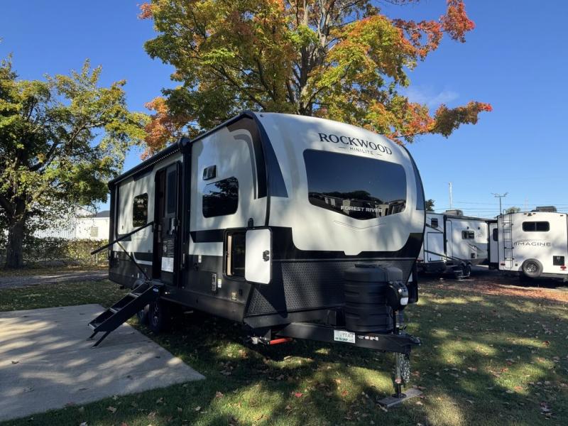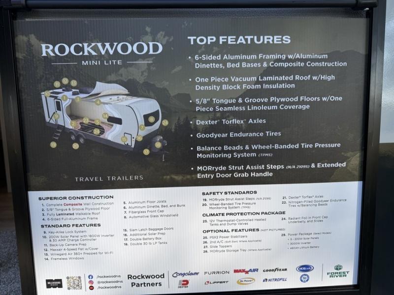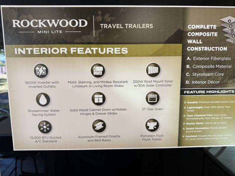 Each Rockwood Mini Lite travel trailer by Forest River is constructed with a fully laminated one-piece walkable roof, sleek frameless windows, and a six-sided full aluminum frame for strength and durability. The 12V thermostatically controlled heated tanks, plus radiant foil in the underbelly will allow you to camp well into the colder months, and the 200W roof solar panel will be perfect for a little off-gridding. Each model includes solid surface kitchen countertops, hidden hinge cabinet doors, roller shades, plus many more interior features. Having an AIR 360+ omnidirectional antenna with WiFi prep on board gives you the option to get some work done if it's needed, and the power tongue jack provides hassle-free set up, so you can enjoy more time relaxing!