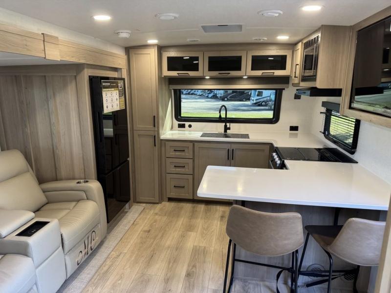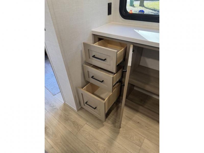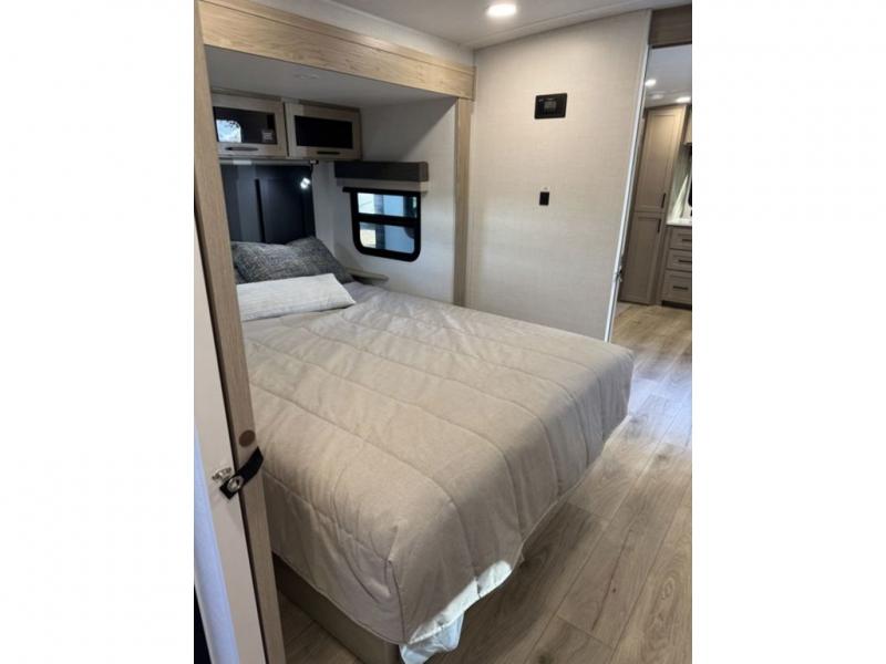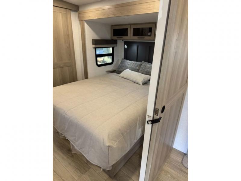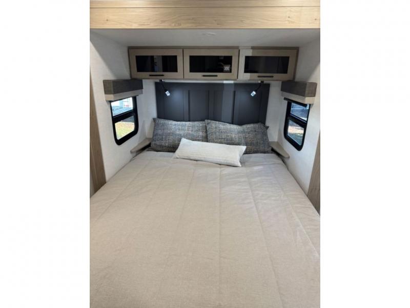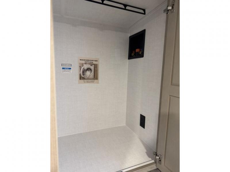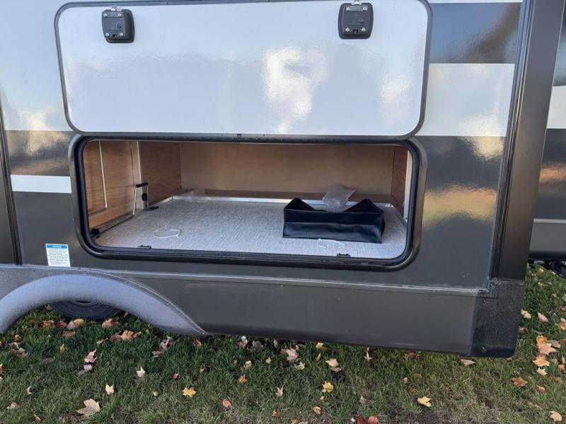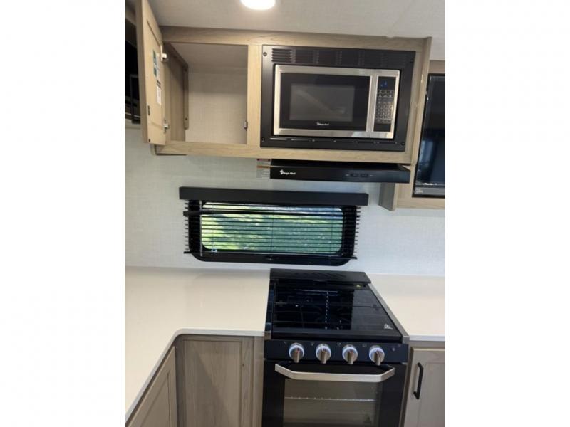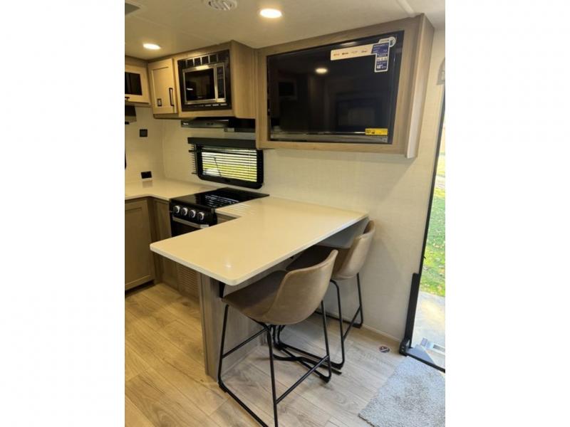 This travel trailer is the best option for you and your partner! The lavish full rear bathroom features a spacious layout and a convenient linen closet, perfect for relaxation and refreshment. The elegant bedroom boasts a plush queen bed, ample wardrobe space, and stylish dresser, creating a serene retreat. The spacious living room and kitchen combined area is the heart of the trailer, featuring plush theater seating for cozy movie nights, a generous closet for storing essentials, and a 12V Smart TV for entertainment on the go. Plus, the expansive countertop with chairs provides a perfect spot for gourmet meals or socializing, while the premium three-burner cooktop, well-stocked kitchen pantry, and high-performance microwave make meal prep and cooking a true delight.