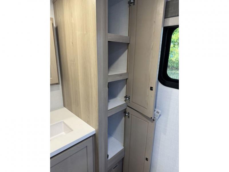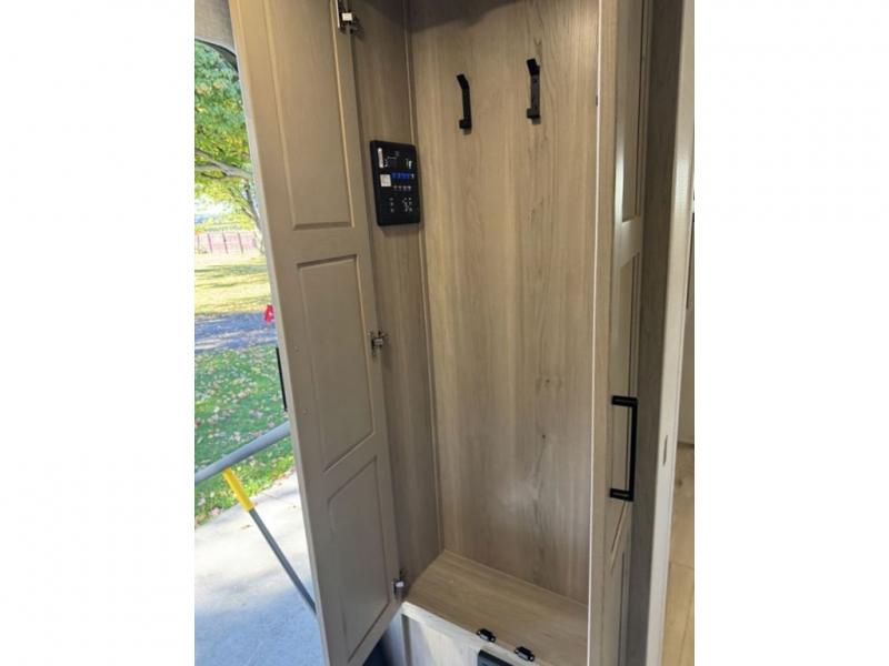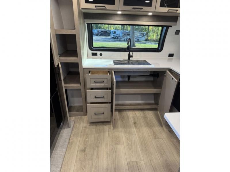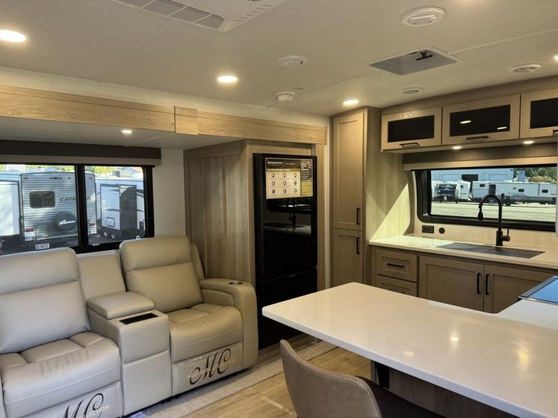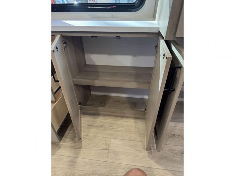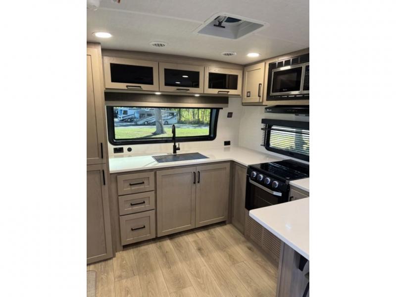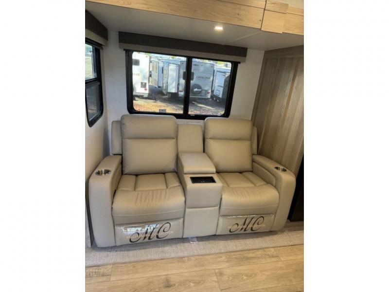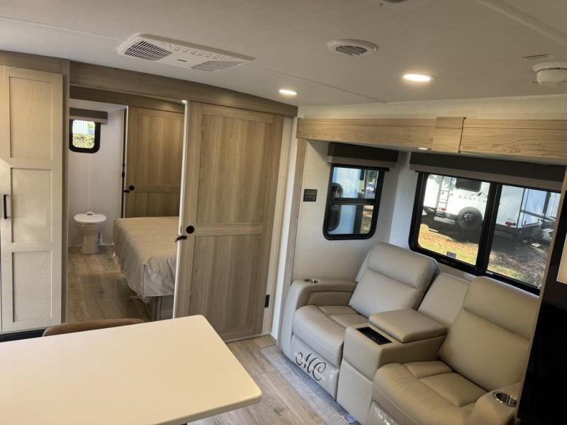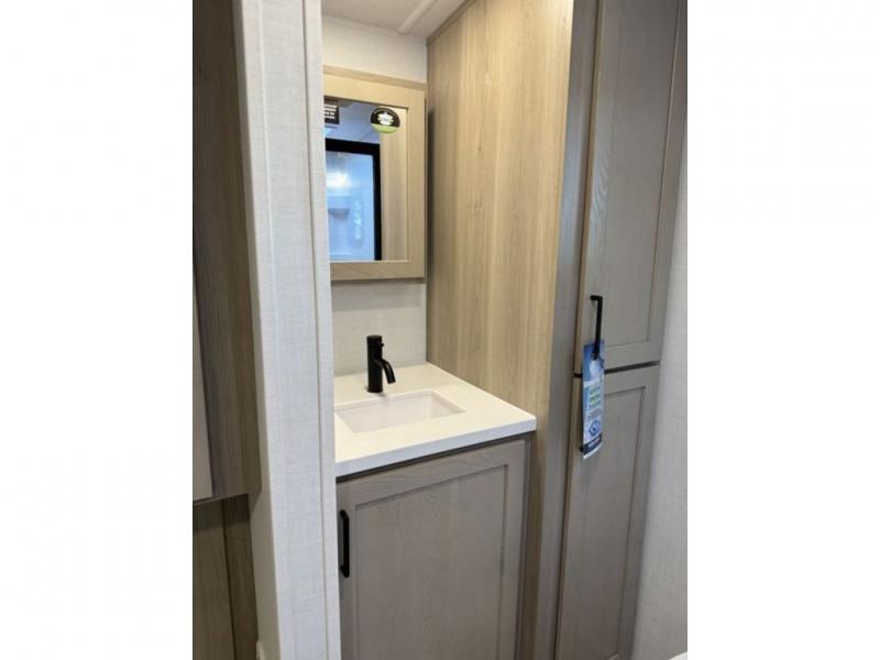This travel trailer is the best option for you and your partner! The lavish full rear bathroom features a spacious layout and a convenient linen closet, perfect for relaxation and refreshment. The elegant bedroom boasts a plush queen bed, ample wardrobe space, and stylish dresser, creating a serene retreat. The spacious living room and kitchen combined area is the heart of the trailer, featuring plush theater seating for cozy movie nights, a generous closet for storing essentials, and a 12V Smart TV for entertainment on the go. Plus, the expansive countertop with chairs provides a perfect spot for gourmet meals or socializing, while the premium three-burner cooktop, well-stocked kitchen pantry, and high-performance microwave make meal prep and cooking a true delight.