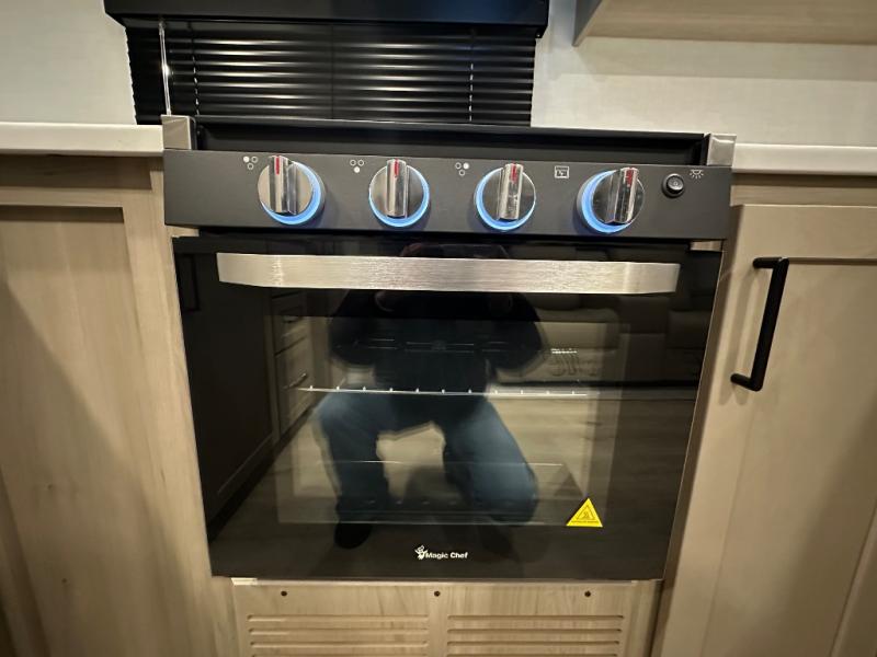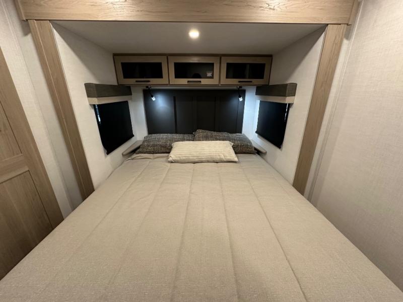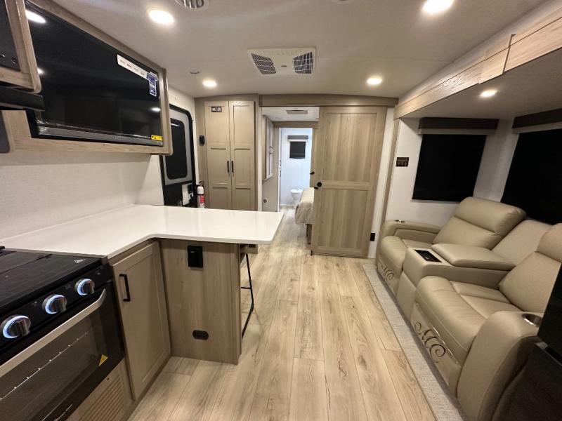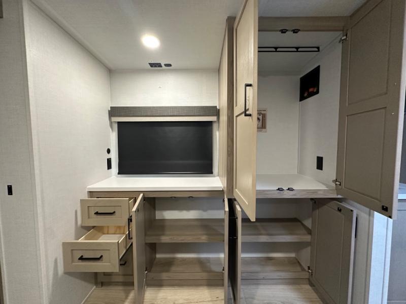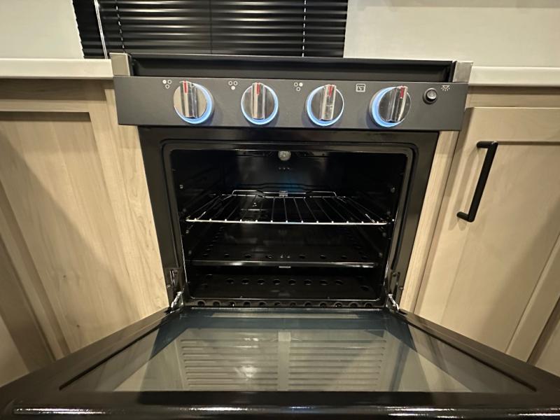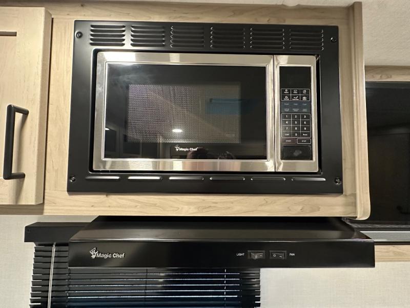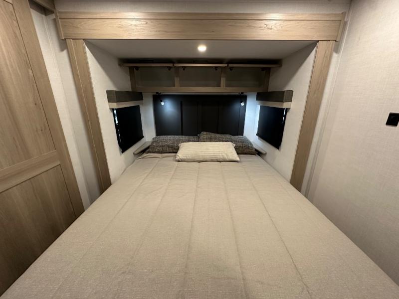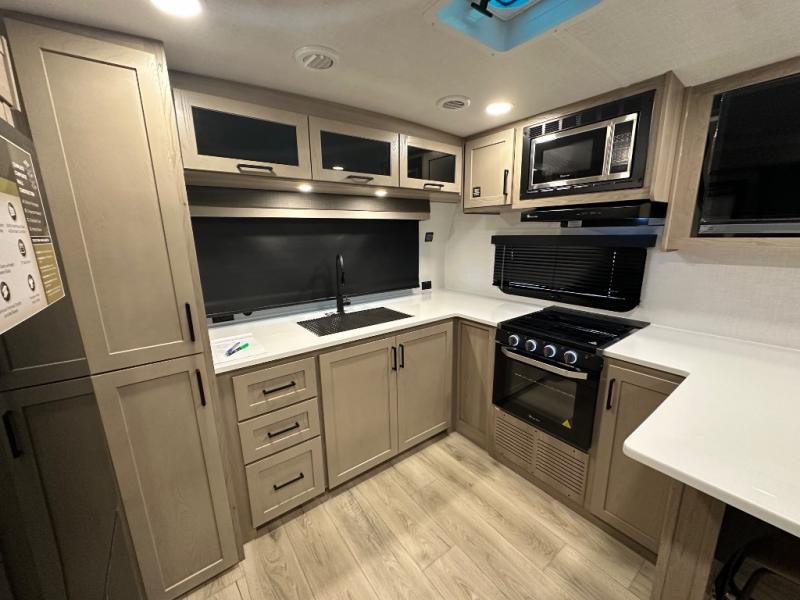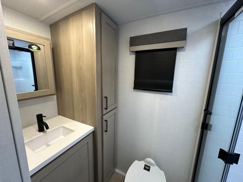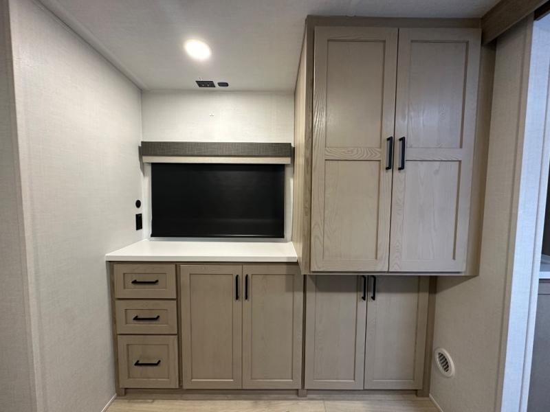 This travel trailer is the best option for you and your partner! The lavish full rear bathroom features a spacious layout and a convenient linen closet, perfect for relaxation and refreshment. The elegant bedroom boasts a plush queen bed, ample wardrobe space, and stylish dresser, creating a serene retreat. The spacious living room and kitchen combined area is the heart of the trailer, featuring plush theater seating for cozy movie nights, a generous closet for storing essentials, and a 12V Smart TV for entertainment on the go. Plus, the expansive countertop with chairs provides a perfect spot for gourmet meals or socializing, while the premium three-burner cooktop, well-stocked kitchen pantry, and high-performance microwave make meal prep and cooking a true delight.