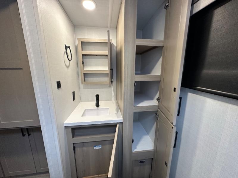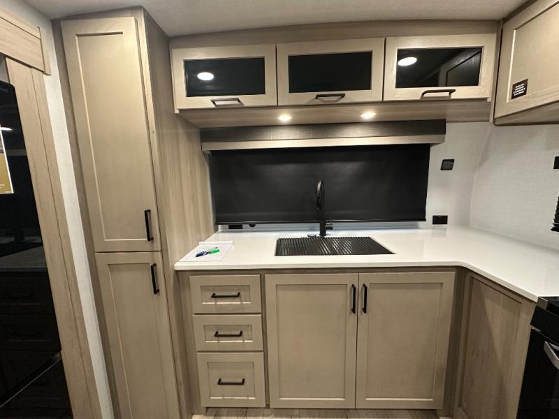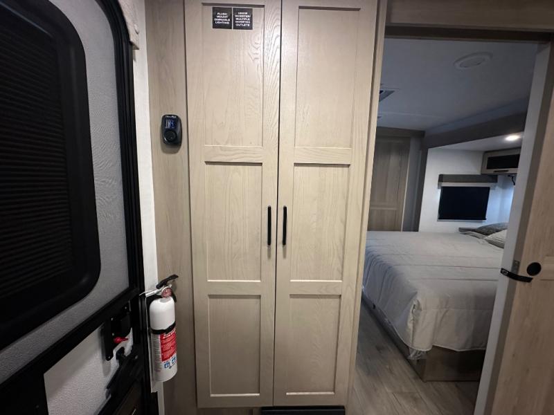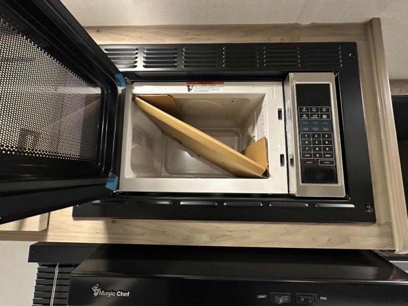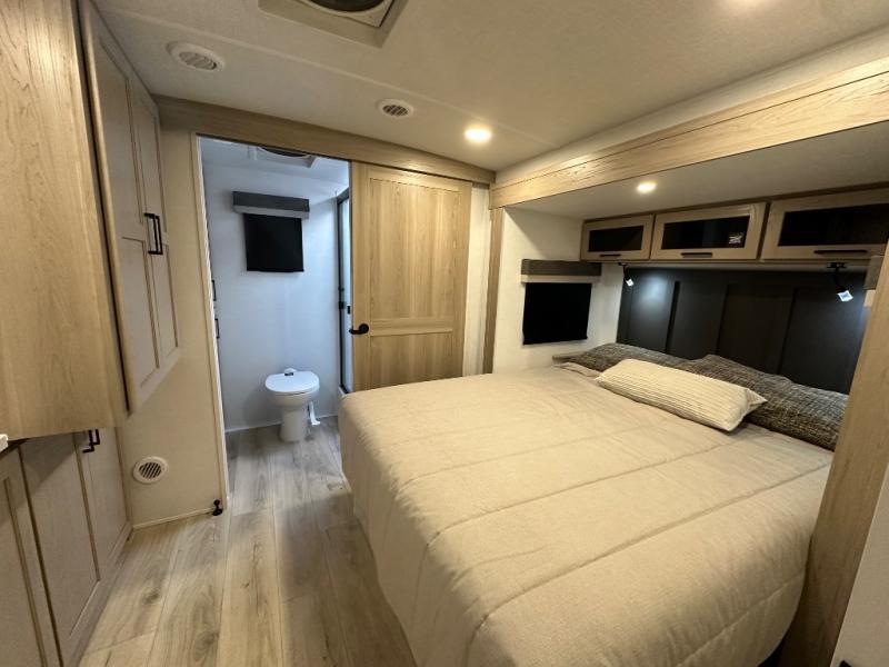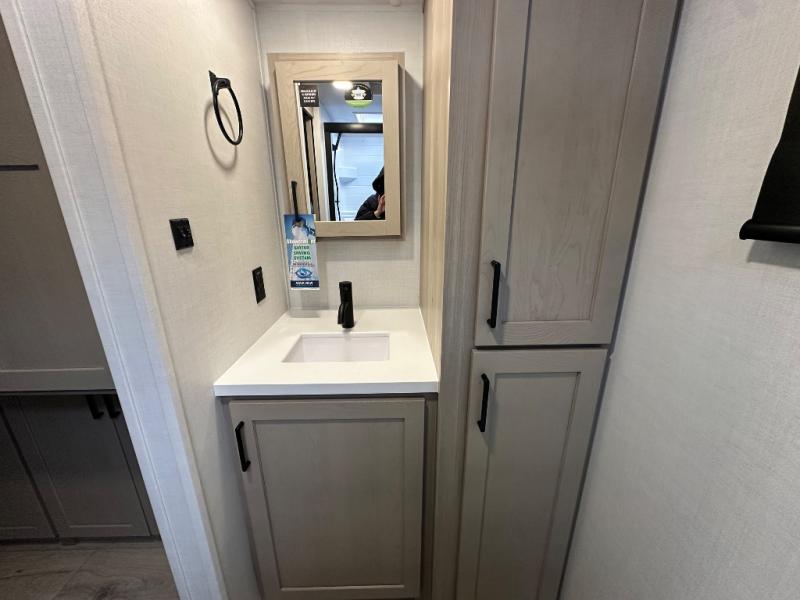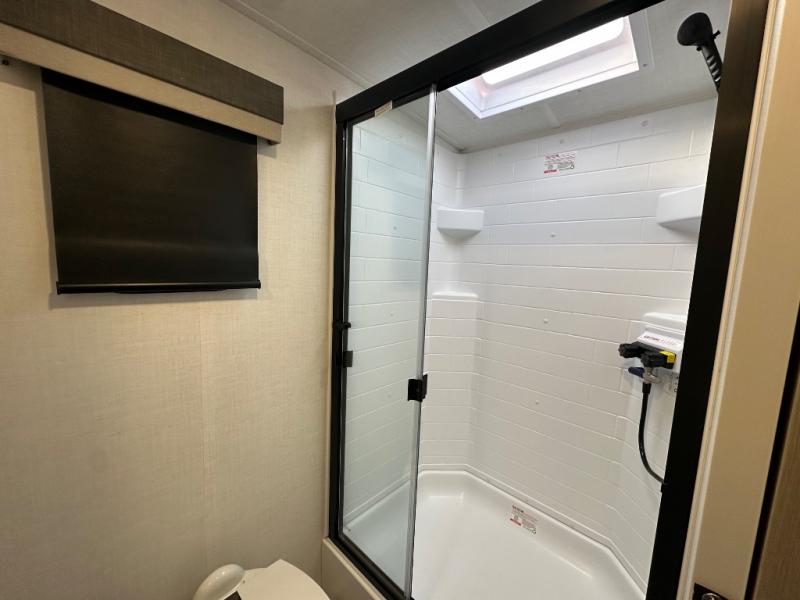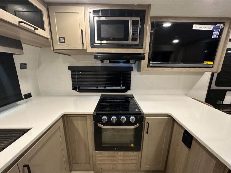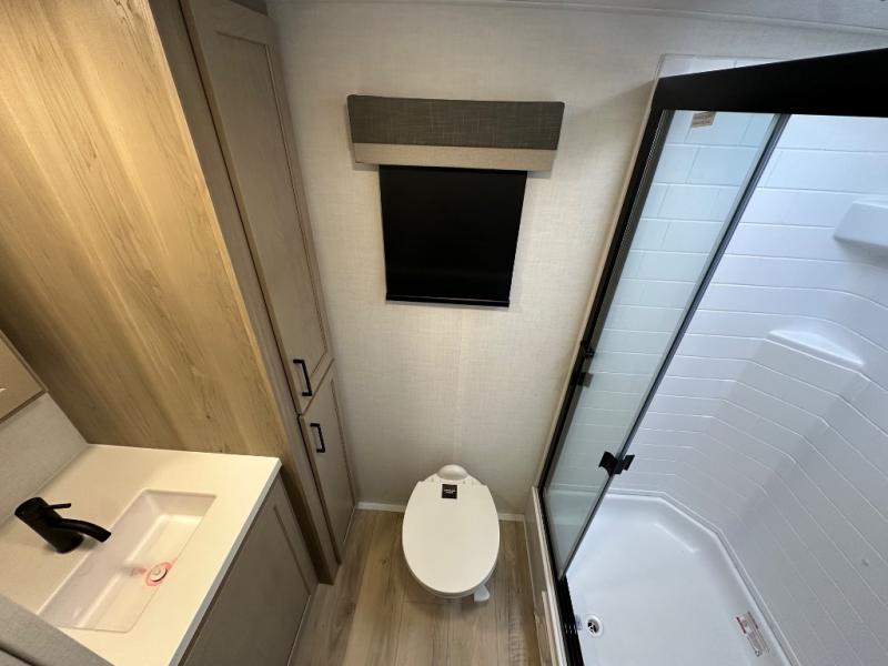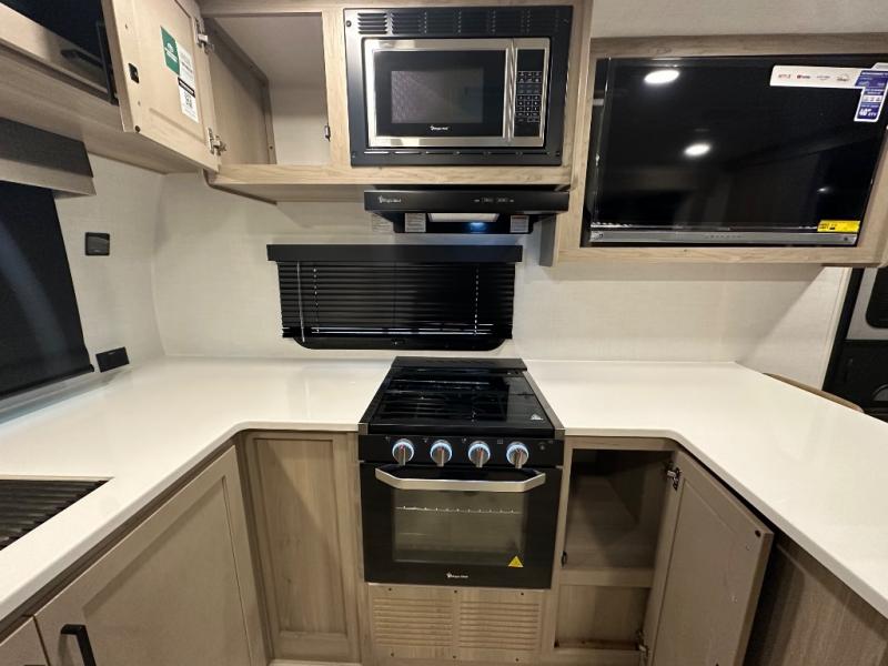 This travel trailer is the best option for you and your partner! The lavish full rear bathroom features a spacious layout and a convenient linen closet, perfect for relaxation and refreshment. The elegant bedroom boasts a plush queen bed, ample wardrobe space, and stylish dresser, creating a serene retreat. The spacious living room and kitchen combined area is the heart of the trailer, featuring plush theater seating for cozy movie nights, a generous closet for storing essentials, and a 12V Smart TV for entertainment on the go. Plus, the expansive countertop with chairs provides a perfect spot for gourmet meals or socializing, while the premium three-burner cooktop, well-stocked kitchen pantry, and high-performance microwave make meal prep and cooking a true delight.