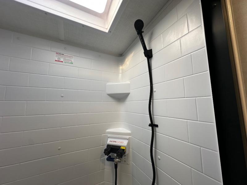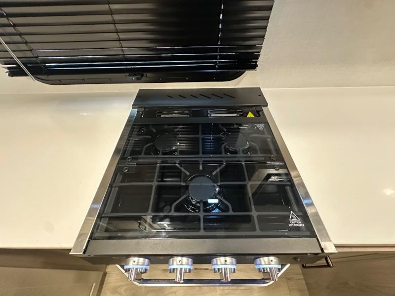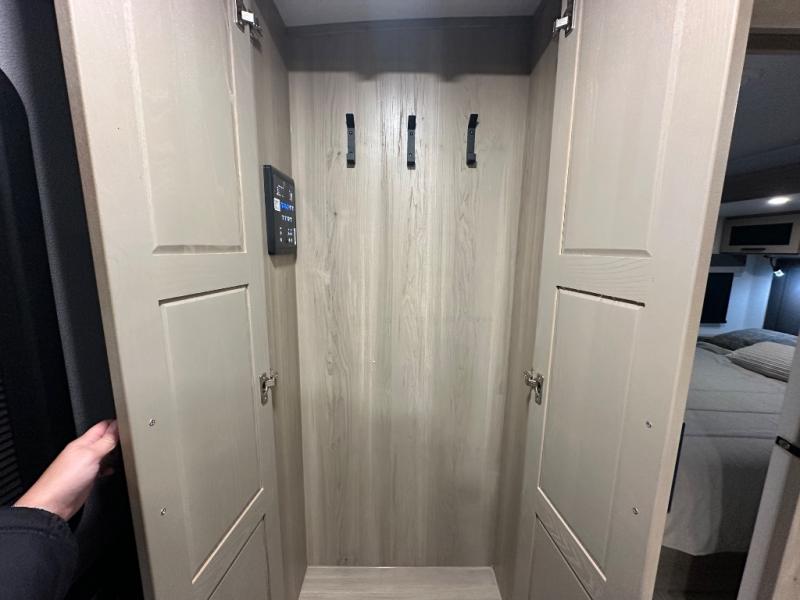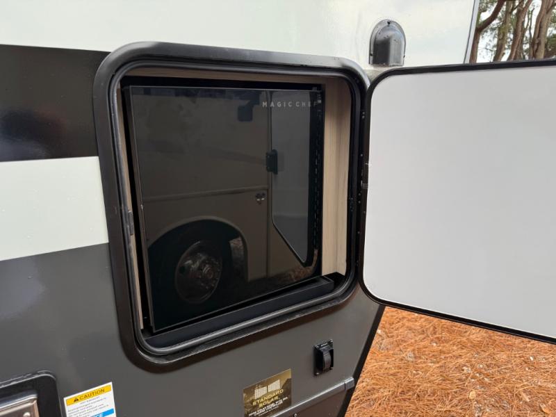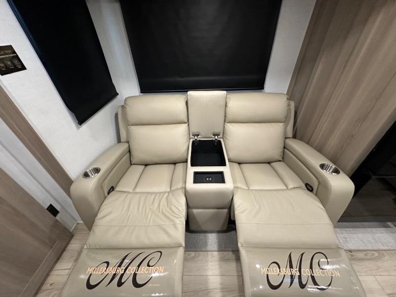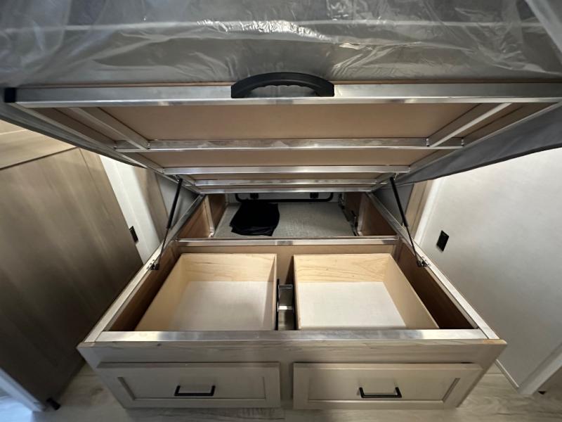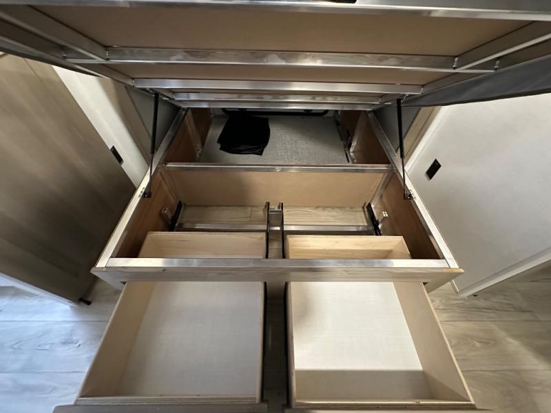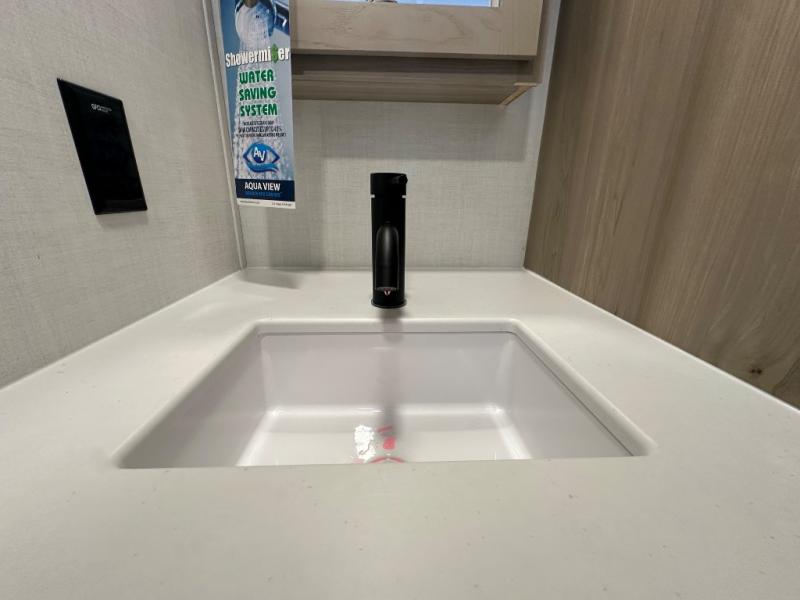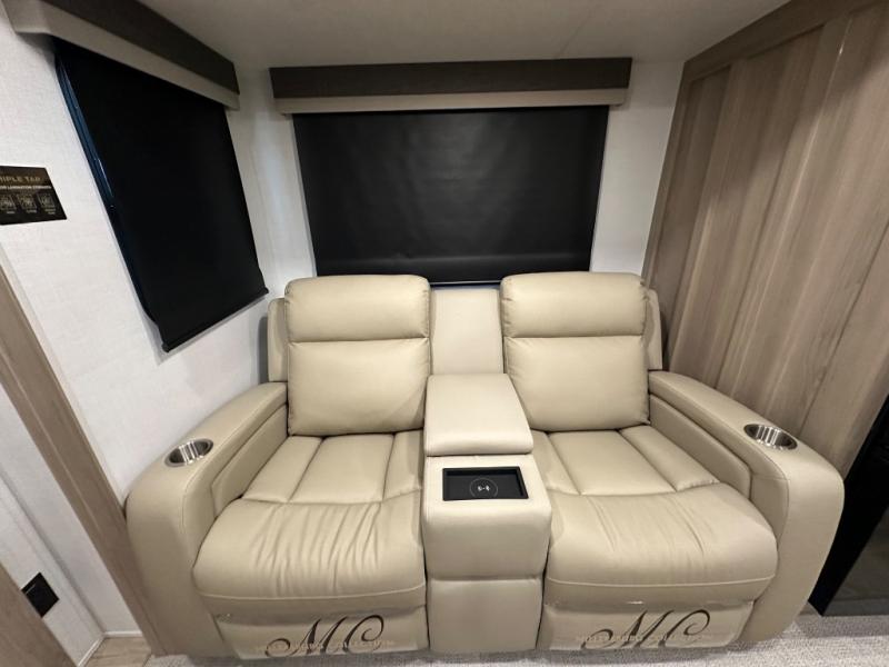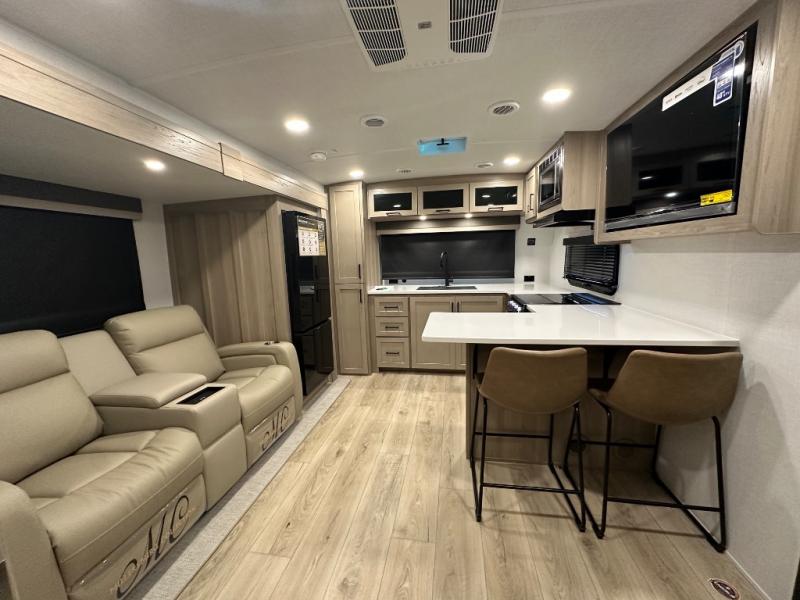 This travel trailer is the best option for you and your partner! The lavish full rear bathroom features a spacious layout and a convenient linen closet, perfect for relaxation and refreshment. The elegant bedroom boasts a plush queen bed, ample wardrobe space, and stylish dresser, creating a serene retreat. The spacious living room and kitchen combined area is the heart of the trailer, featuring plush theater seating for cozy movie nights, a generous closet for storing essentials, and a 12V Smart TV for entertainment on the go. Plus, the expansive countertop with chairs provides a perfect spot for gourmet meals or socializing, while the premium three-burner cooktop, well-stocked kitchen pantry, and high-performance microwave make meal prep and cooking a true delight.