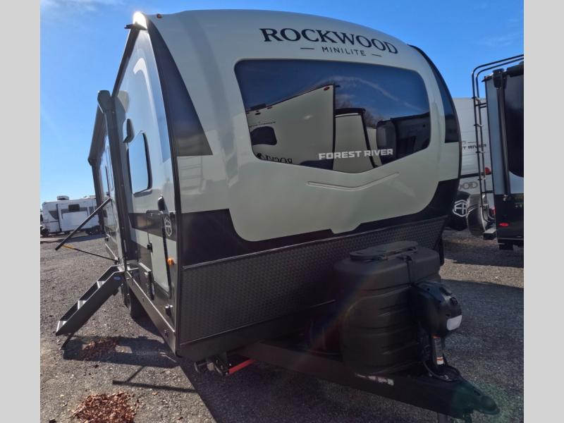 Each Rockwood Mini Lite travel trailer by Forest River is constructed with a fully laminated one-piece walkable roof, sleek frameless windows, and a six-sided full aluminum frame for strength and durability. The 12V thermostatically controlled heated tanks, plus radiant foil in the underbelly will allow you to camp well into the colder months, and the 200W roof solar panel will be perfect for a little off-gridding. Each model includes solid surface kitchen countertops, hidden hinge cabinet doors, roller shades, plus many more interior features. Having an AIR 360+ omnidirectional antenna with WiFi prep on board gives you the option to get some work done if it's needed, and the power tongue jack provides hassle-free set up, so you can enjoy more time relaxing!