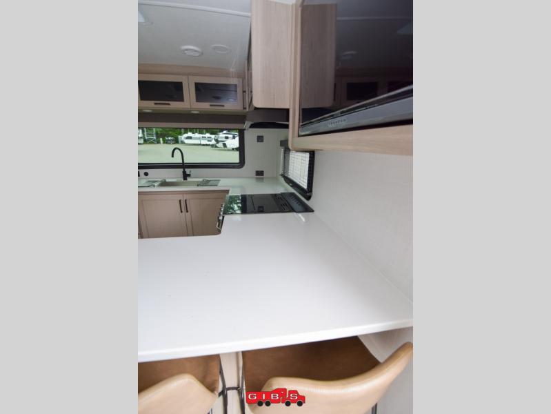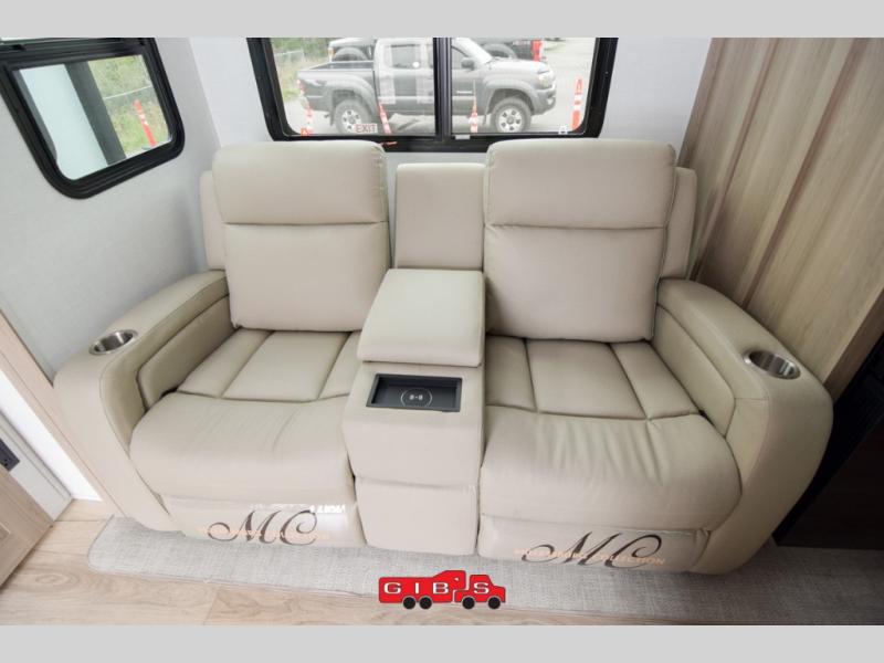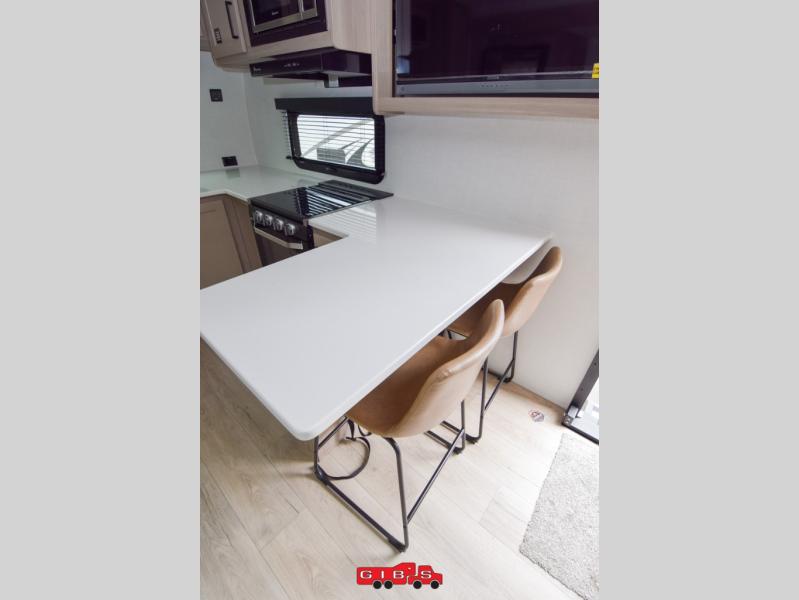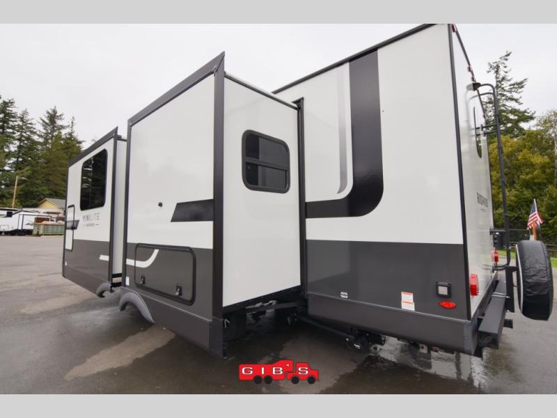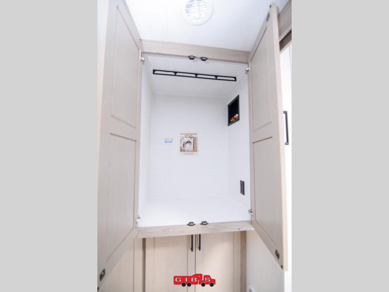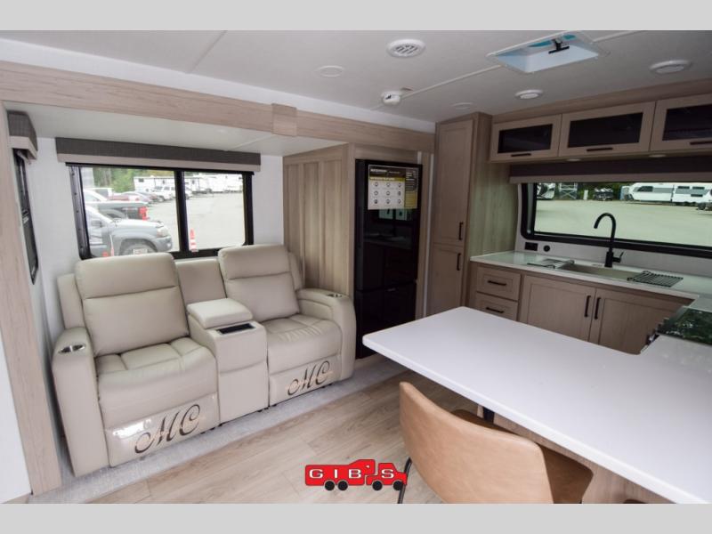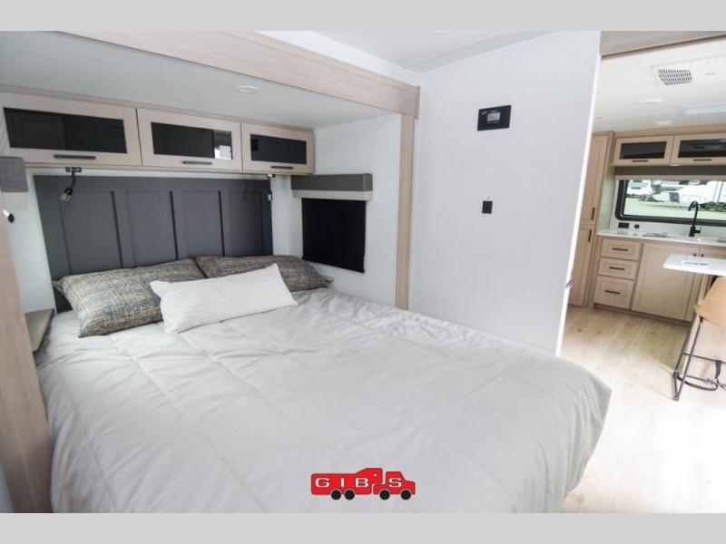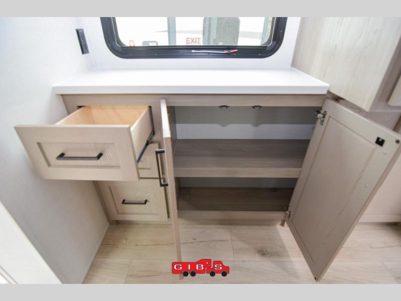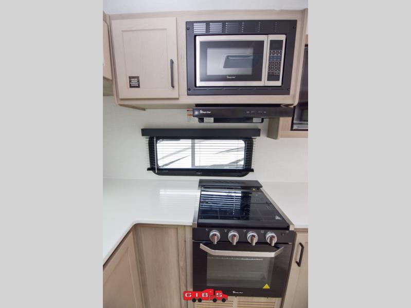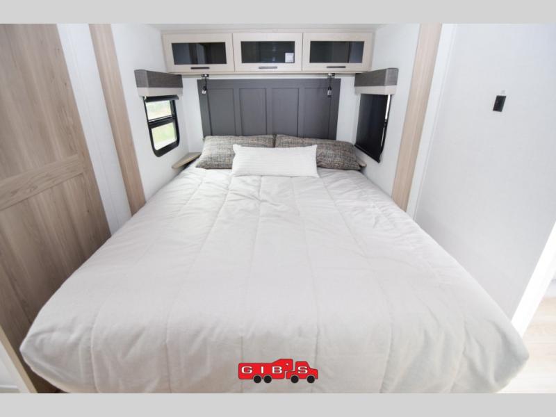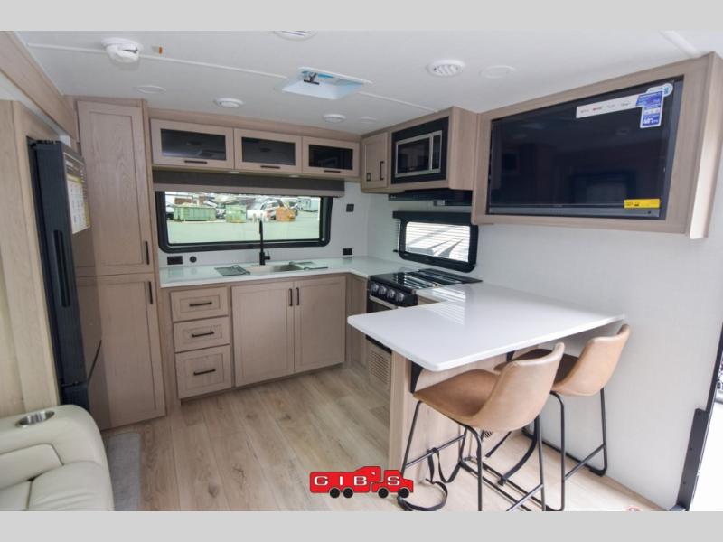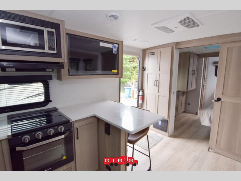 This travel trailer is the best option for you and your partner! The lavish full rear bathroom features a spacious layout and a convenient linen closet, perfect for relaxation and refreshment. The elegant bedroom boasts a plush queen bed, ample wardrobe space, and stylish dresser, creating a serene retreat. The spacious living room and kitchen combined area is the heart of the trailer, featuring plush theater seating for cozy movie nights, a generous closet for storing essentials, and a 12V Smart TV for entertainment on the go. Plus, the expansive countertop with chairs provides a perfect spot for gourmet meals or socializing, while the premium three-burner cooktop, well-stocked kitchen pantry, and high-performance microwave make meal prep and cooking a true delight.
