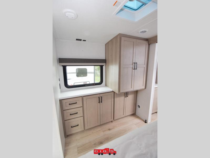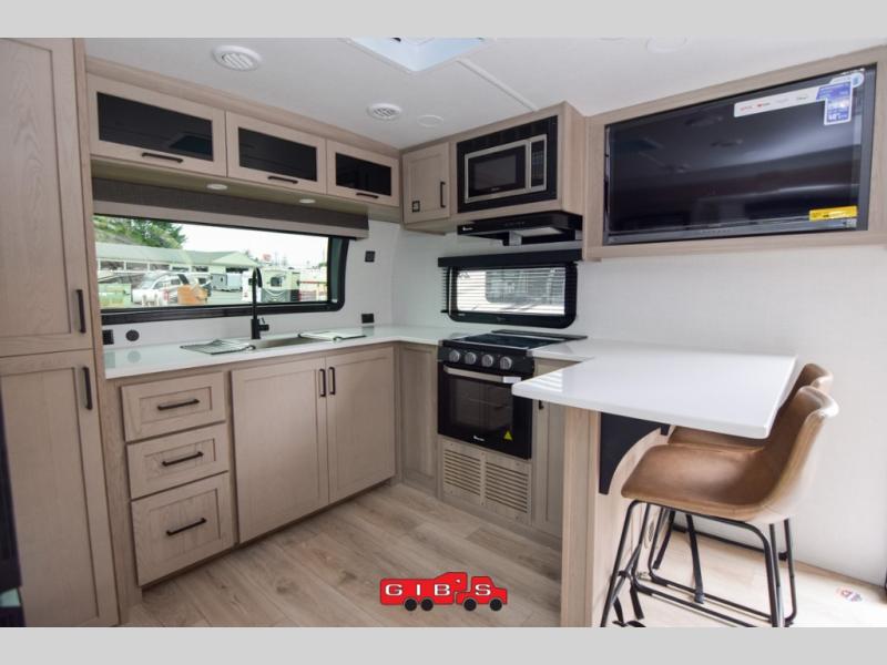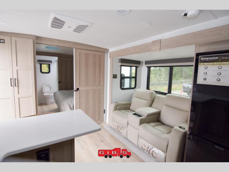 Each Rockwood Mini Lite travel trailer by Forest River is constructed with a fully laminated one-piece walkable roof, sleek frameless windows, and a six-sided full aluminum frame for strength and durability. The 12V thermostatically controlled heated tanks, plus radiant foil in the underbelly will allow you to camp well into the colder months, and the 200W roof solar panel will be perfect for a little off-gridding. Each model includes solid surface kitchen countertops, hidden hinge cabinet doors, roller shades, plus many more interior features. Having an AIR 360+ omnidirectional antenna with WiFi prep on board gives you the option to get some work done if it's needed, and the power tongue jack provides hassle-free set up, so you can enjoy more time relaxing!