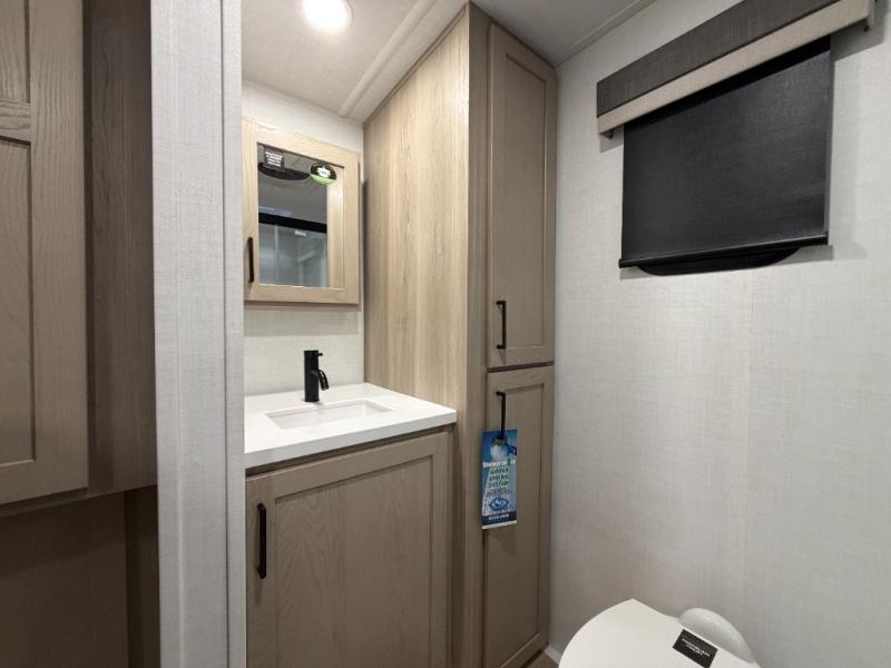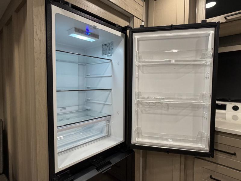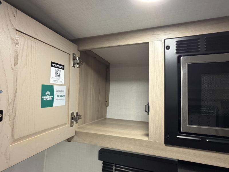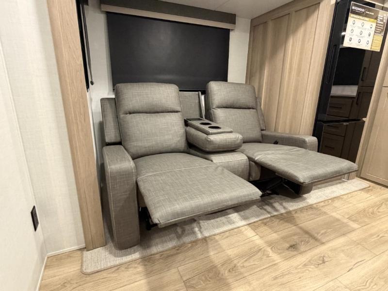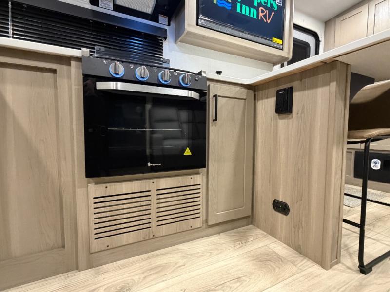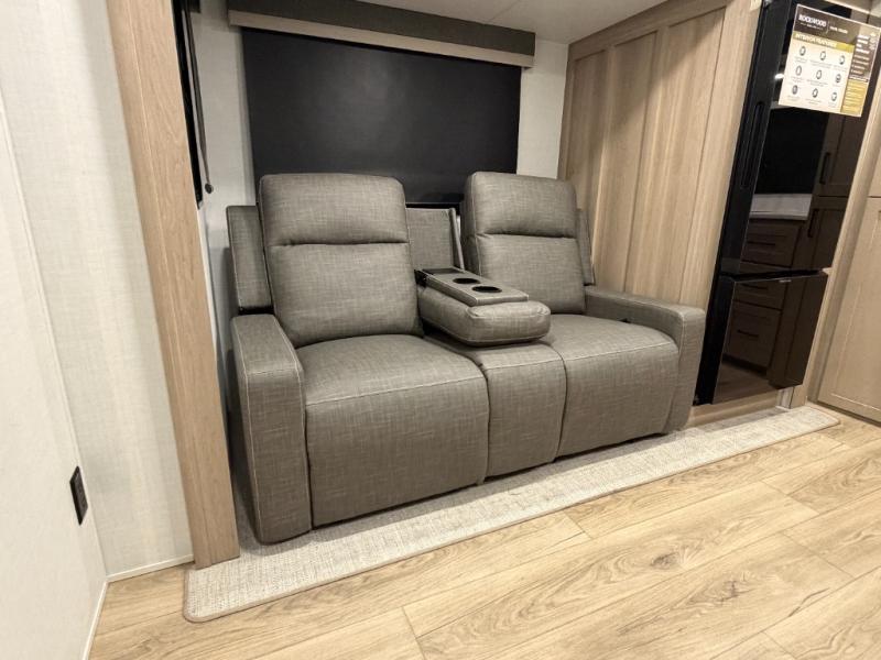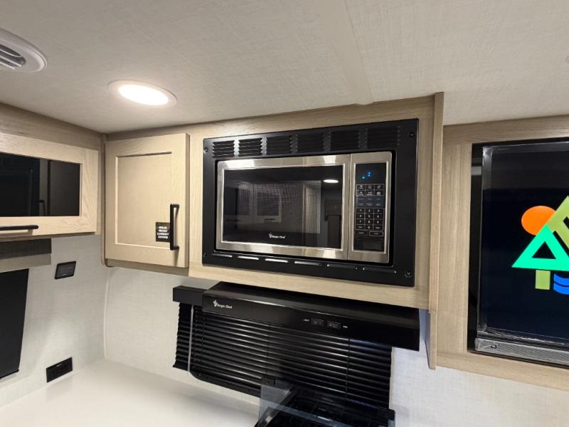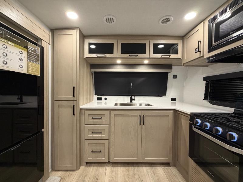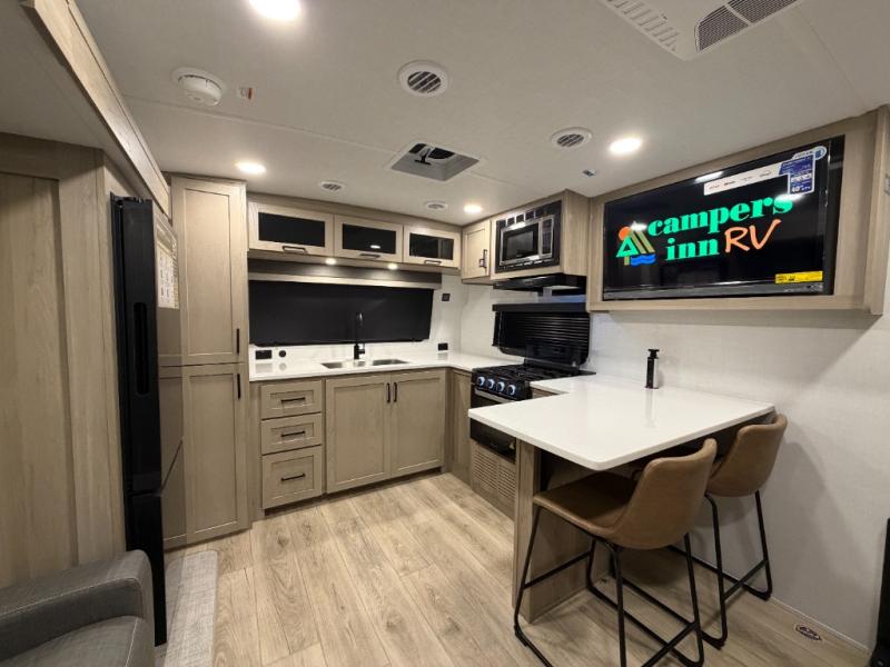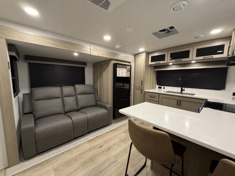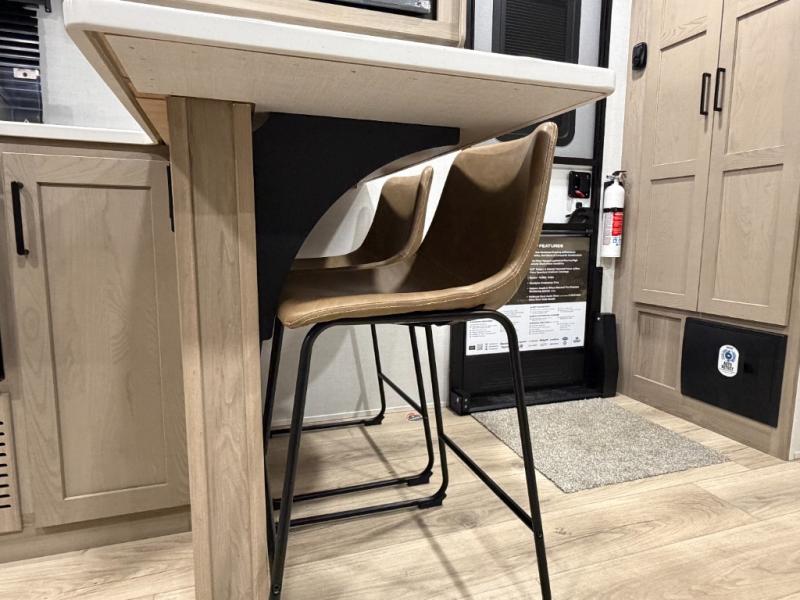 This travel trailer is the best option for you and your partner! The lavish full rear bathroom features a spacious layout and a convenient linen closet, perfect for relaxation and refreshment. The elegant bedroom boasts a plush queen bed, ample wardrobe space, and stylish dresser, creating a serene retreat. The spacious living room and kitchen combined area is the heart of the trailer, featuring plush theater seating for cozy movie nights, a generous closet for storing essentials, and a 12V Smart TV for entertainment on the go. Plus, the expansive countertop with chairs provides a perfect spot for gourmet meals or socializing, while the premium three-burner cooktop, well-stocked kitchen pantry, and high-performance microwave make meal prep and cooking a true delight.