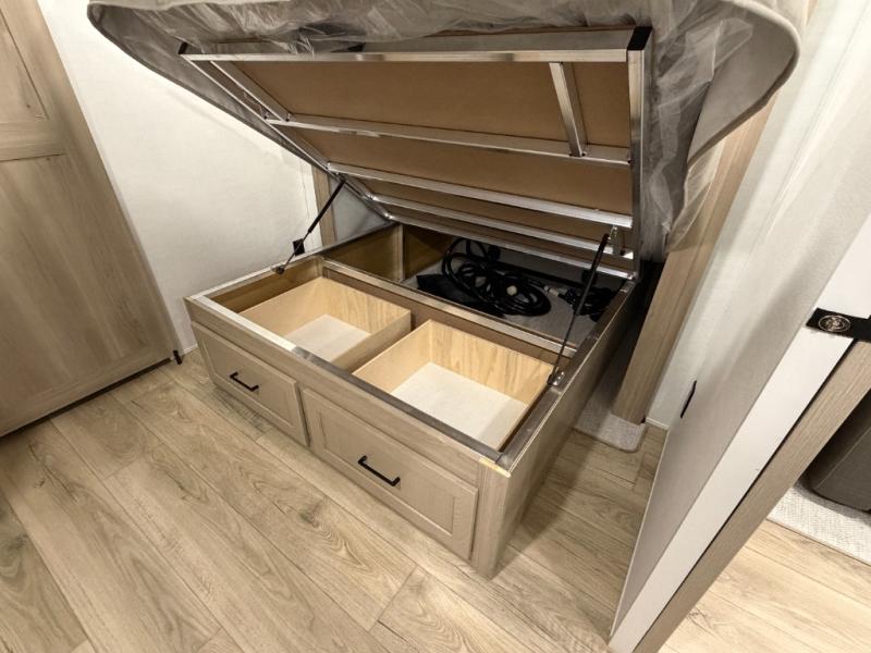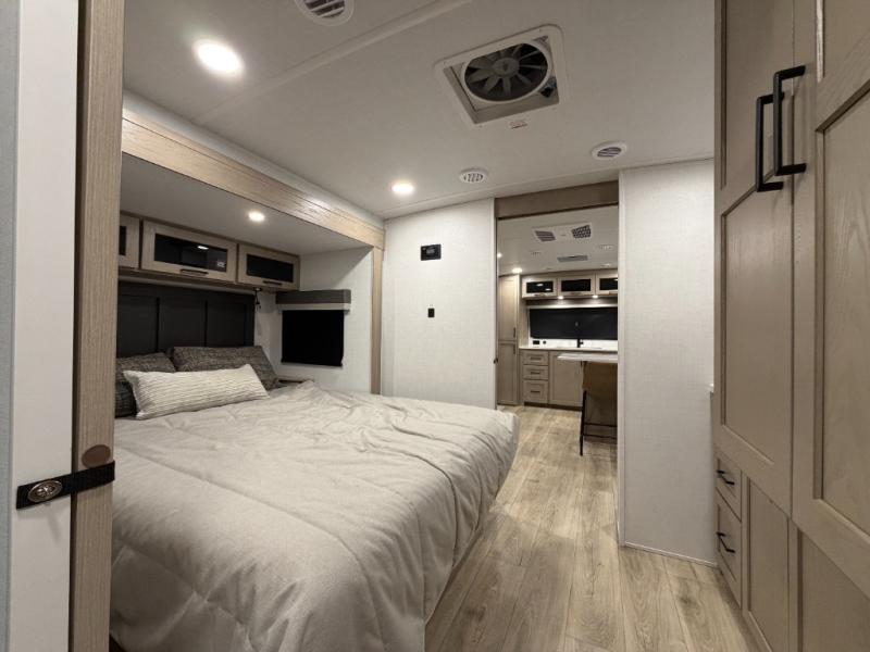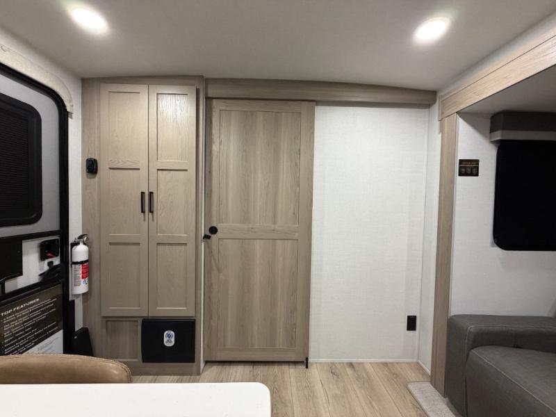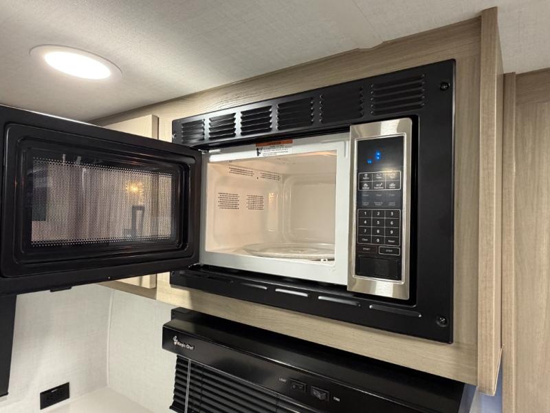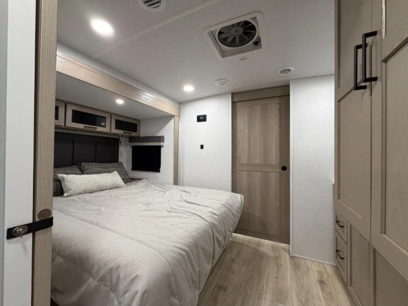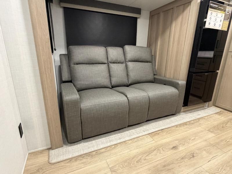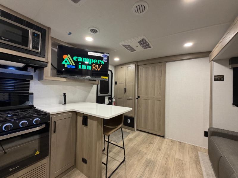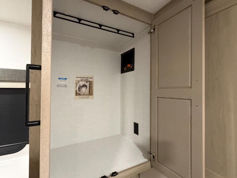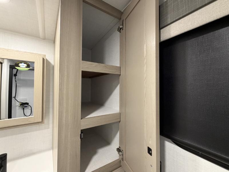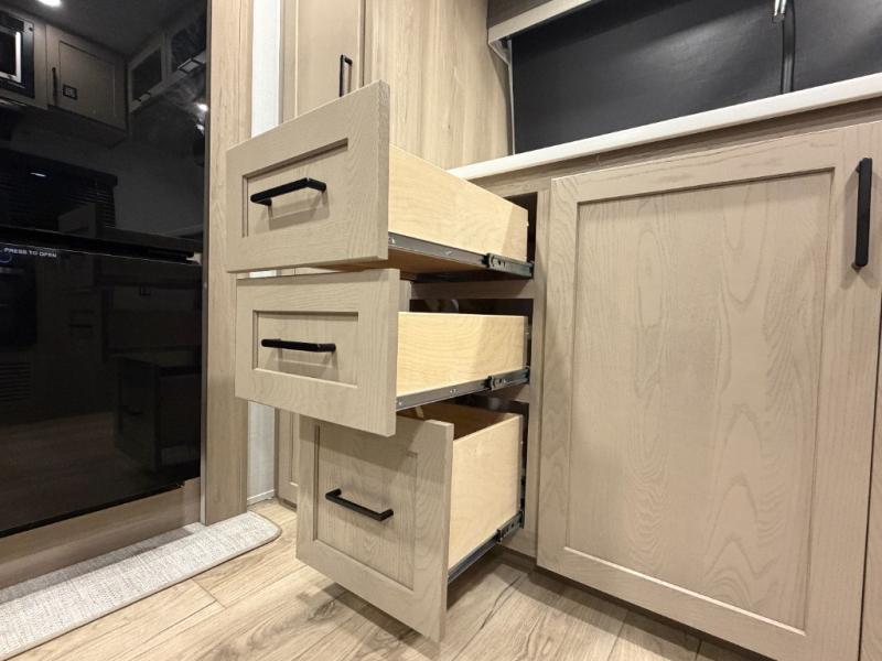 This travel trailer is the best option for you and your partner! The lavish full rear bathroom features a spacious layout and a convenient linen closet, perfect for relaxation and refreshment. The elegant bedroom boasts a plush queen bed, ample wardrobe space, and stylish dresser, creating a serene retreat. The spacious living room and kitchen combined area is the heart of the trailer, featuring plush theater seating for cozy movie nights, a generous closet for storing essentials, and a 12V Smart TV for entertainment on the go. Plus, the expansive countertop with chairs provides a perfect spot for gourmet meals or socializing, while the premium three-burner cooktop, well-stocked kitchen pantry, and high-performance microwave make meal prep and cooking a true delight.