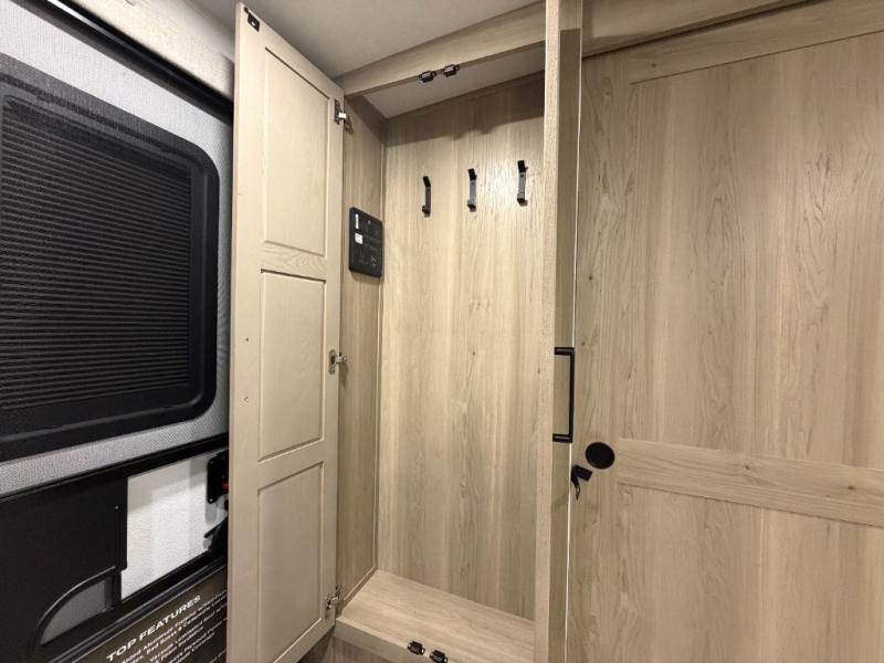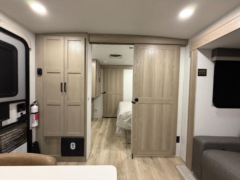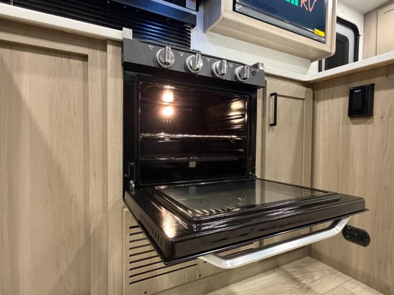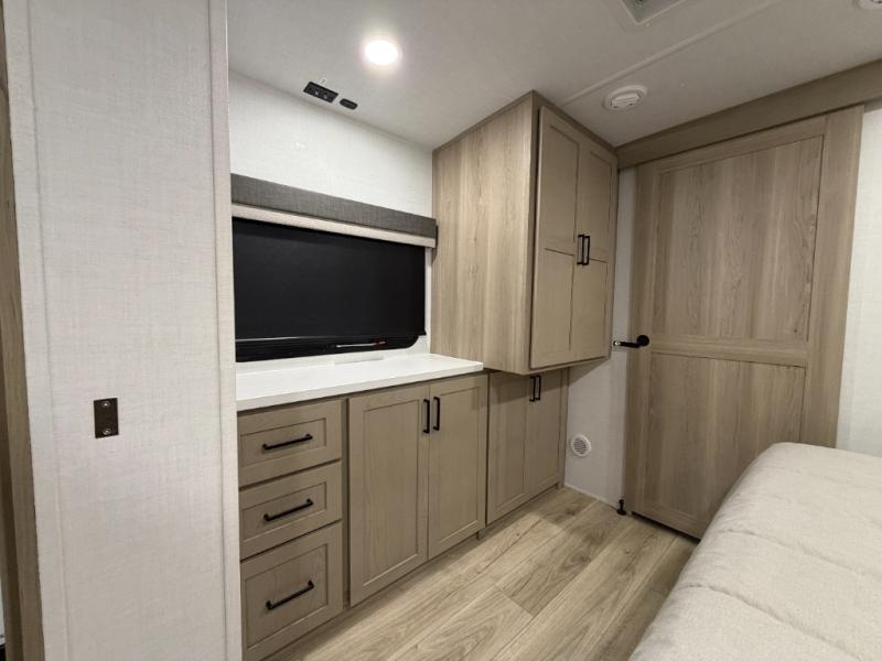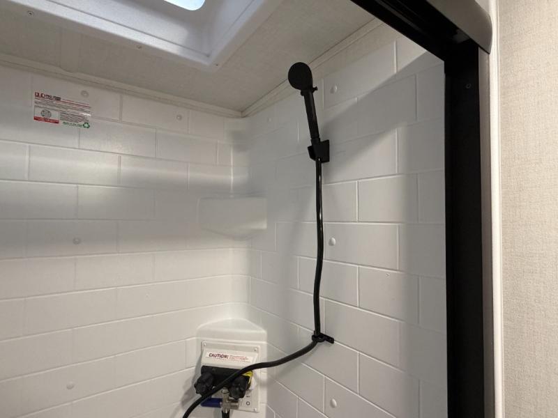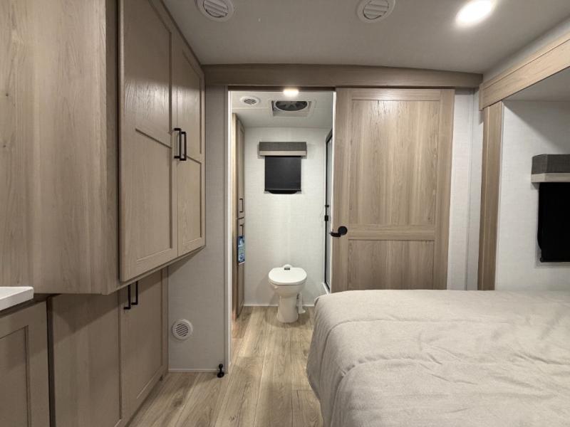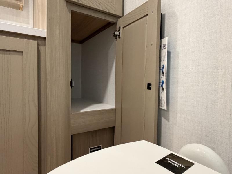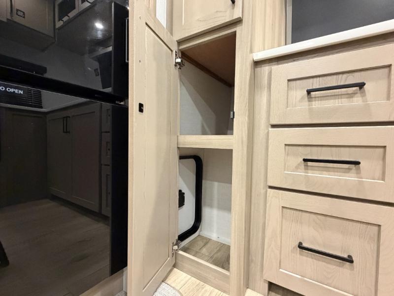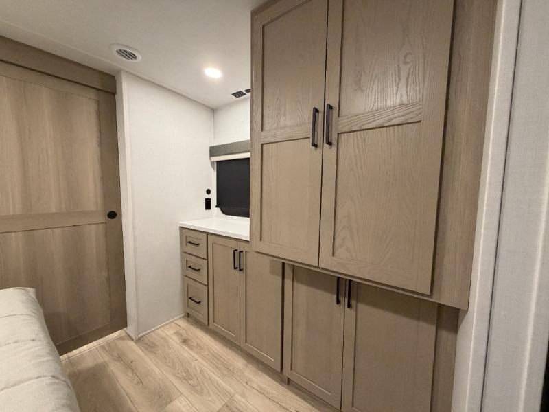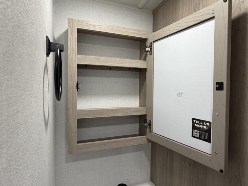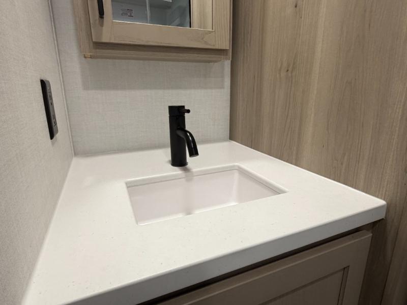 This travel trailer is the best option for you and your partner! The lavish full rear bathroom features a spacious layout and a convenient linen closet, perfect for relaxation and refreshment. The elegant bedroom boasts a plush queen bed, ample wardrobe space, and stylish dresser, creating a serene retreat. The spacious living room and kitchen combined area is the heart of the trailer, featuring plush theater seating for cozy movie nights, a generous closet for storing essentials, and a 12V Smart TV for entertainment on the go. Plus, the expansive countertop with chairs provides a perfect spot for gourmet meals or socializing, while the premium three-burner cooktop, well-stocked kitchen pantry, and high-performance microwave make meal prep and cooking a true delight.