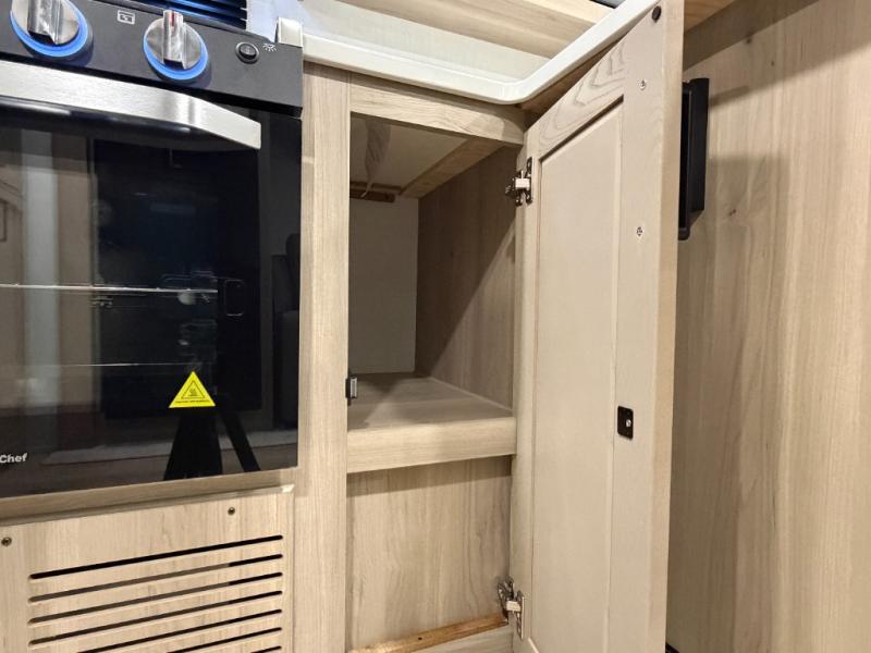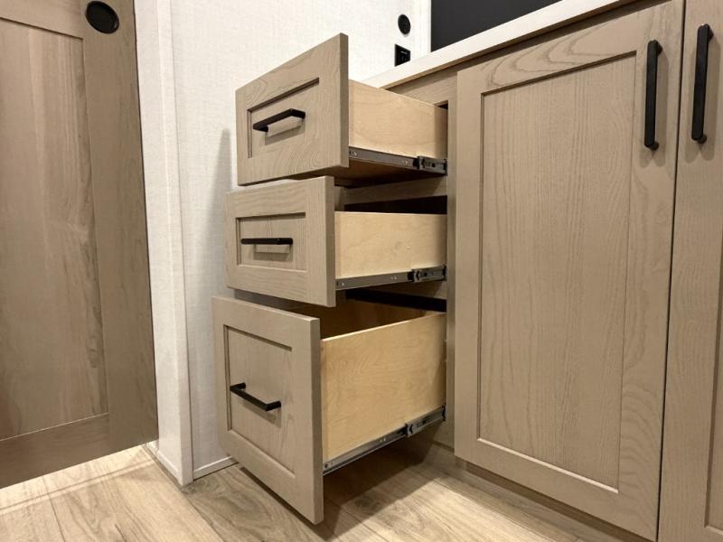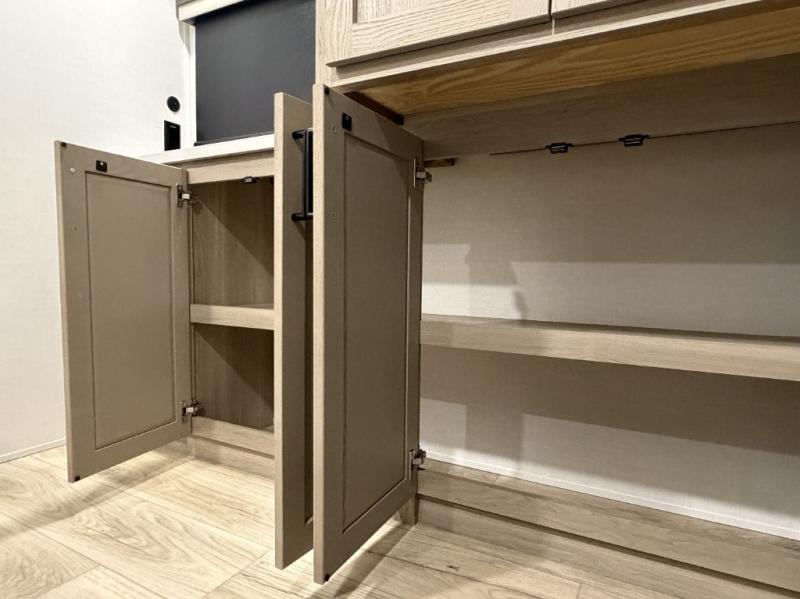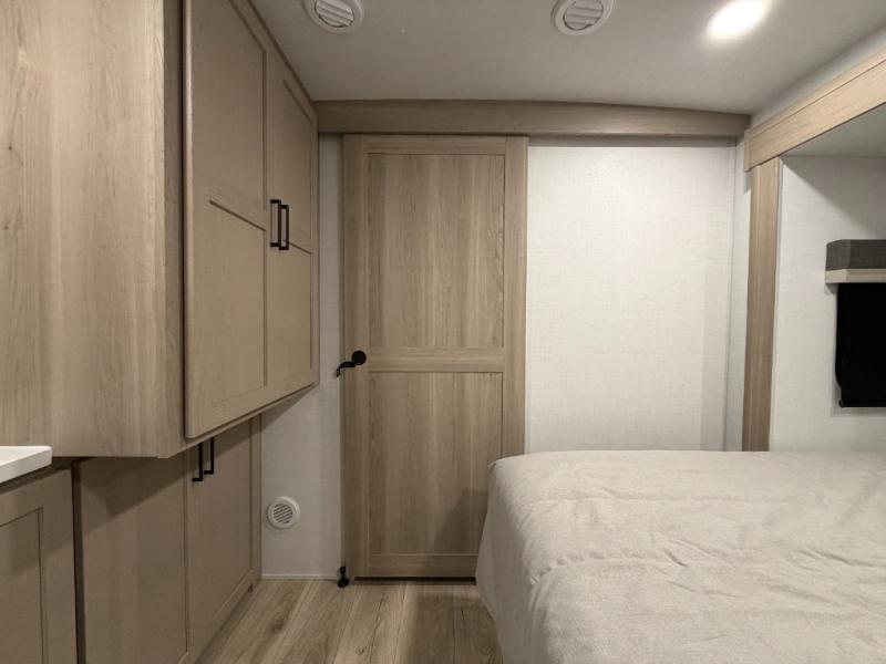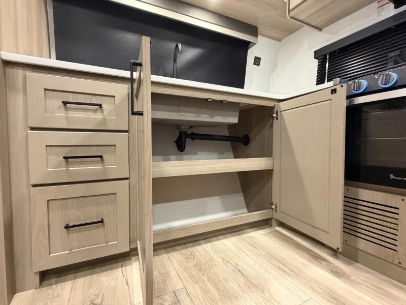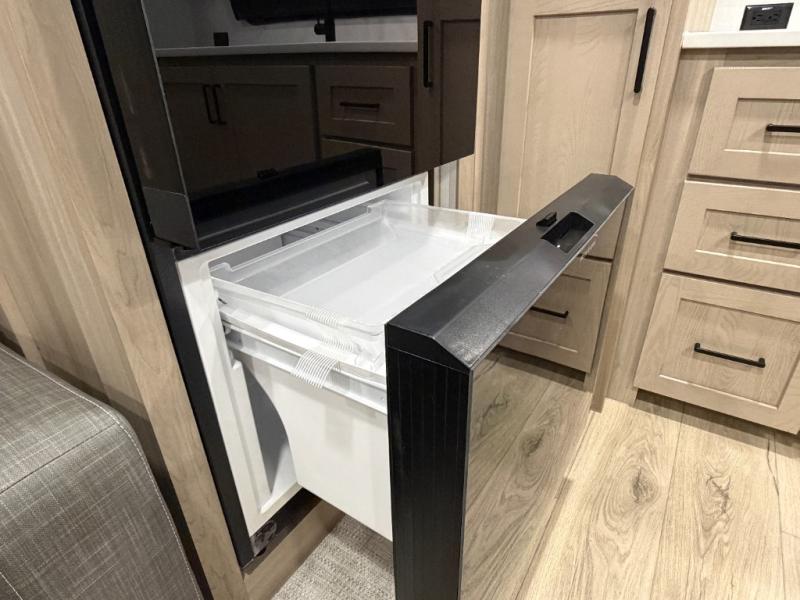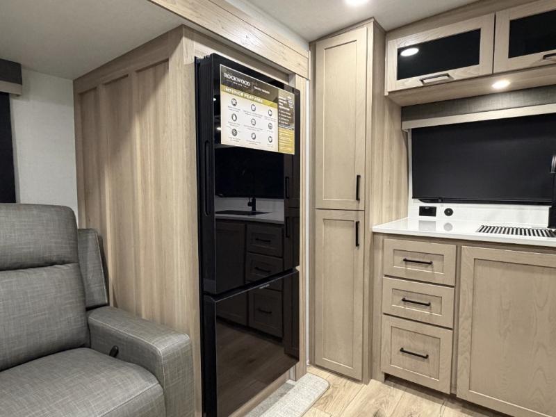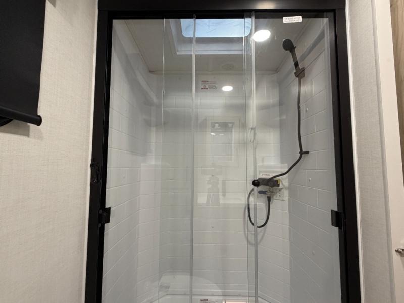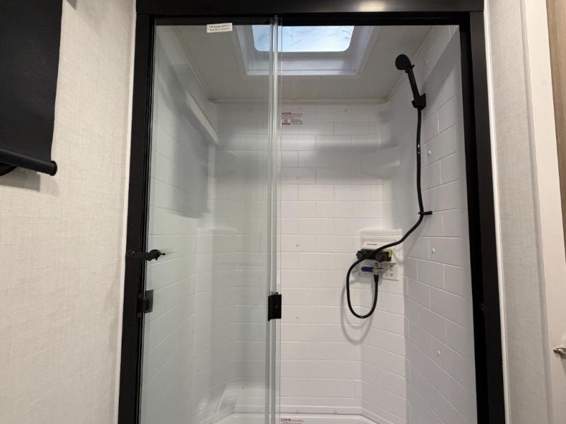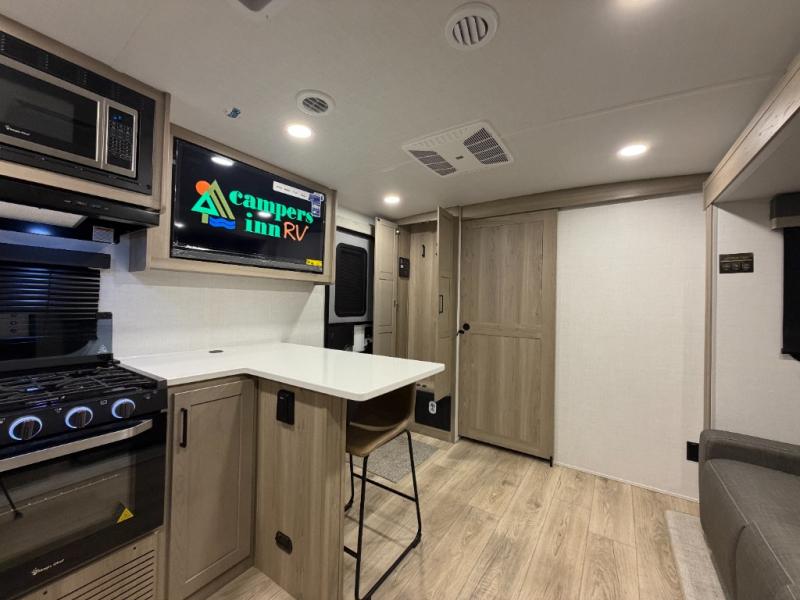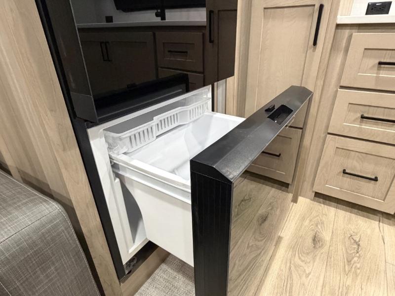 This travel trailer is the best option for you and your partner! The lavish full rear bathroom features a spacious layout and a convenient linen closet, perfect for relaxation and refreshment. The elegant bedroom boasts a plush queen bed, ample wardrobe space, and stylish dresser, creating a serene retreat. The spacious living room and kitchen combined area is the heart of the trailer, featuring plush theater seating for cozy movie nights, a generous closet for storing essentials, and a 12V Smart TV for entertainment on the go. Plus, the expansive countertop with chairs provides a perfect spot for gourmet meals or socializing, while the premium three-burner cooktop, well-stocked kitchen pantry, and high-performance microwave make meal prep and cooking a true delight.