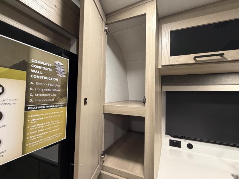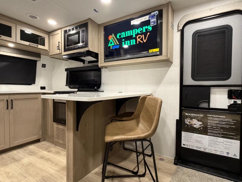Each Rockwood Mini Lite travel trailer by Forest River is constructed with a fully laminated one-piece walkable roof, sleek frameless windows, and a six-sided full aluminum frame for strength and durability. The 12V thermostatically controlled heated tanks, plus radiant foil in the underbelly will allow you to camp well into the colder months, and the 200W roof solar panel will be perfect for a little off-gridding. Each model includes solid surface kitchen countertops, hidden hinge cabinet doors, roller shades, plus many more interior features. Having an AIR 360+ omnidirectional antenna with WiFi prep on board gives you the option to get some work done if it's needed, and the power tongue jack provides hassle-free set up, so you can enjoy more time relaxing!
