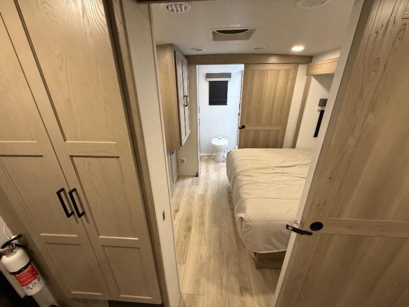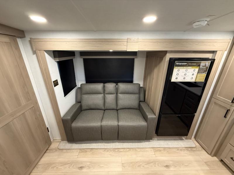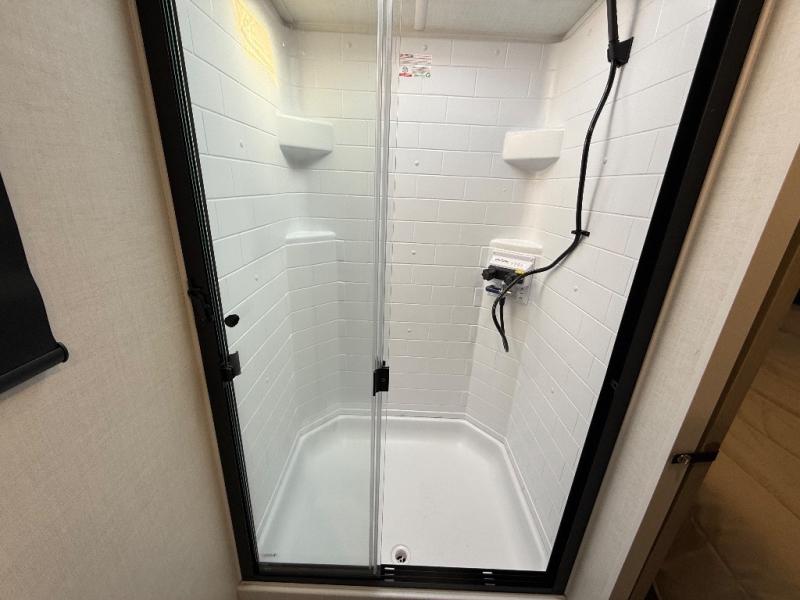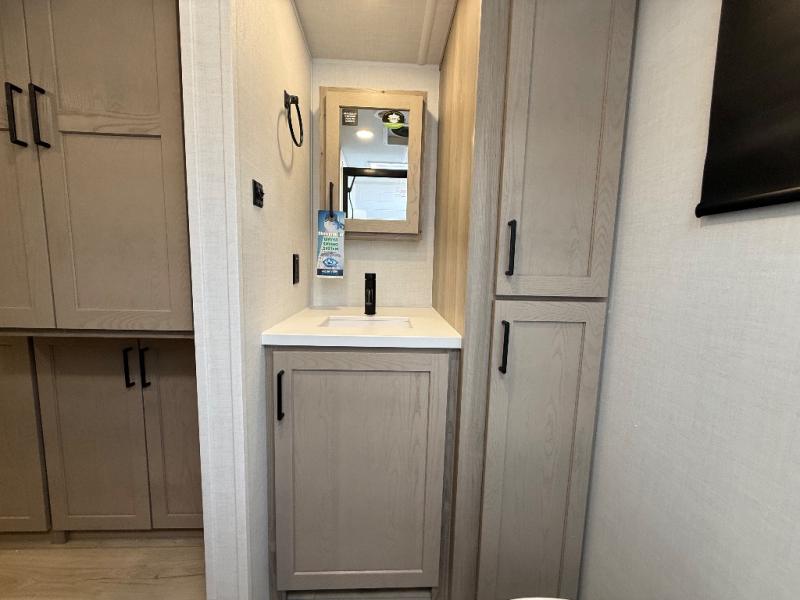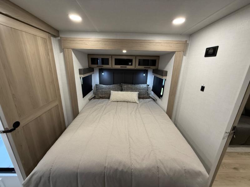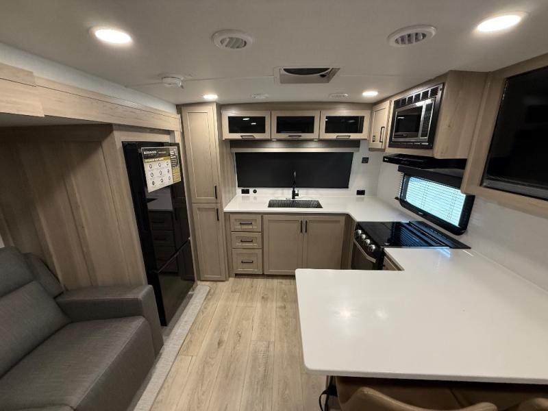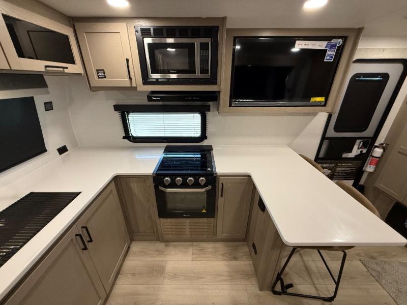 This travel trailer is the best option for you and your partner! The lavish full rear bathroom features a spacious layout and a convenient linen closet, perfect for relaxation and refreshment. The elegant bedroom boasts a plush queen bed, ample wardrobe space, and stylish dresser, creating a serene retreat. The spacious living room and kitchen combined area is the heart of the trailer, featuring plush theater seating for cozy movie nights, a generous closet for storing essentials, and a 12V Smart TV for entertainment on the go. Plus, the expansive countertop with chairs provides a perfect spot for gourmet meals or socializing, while the premium three-burner cooktop, well-stocked kitchen pantry, and high-performance microwave make meal prep and cooking a true delight.