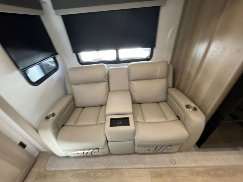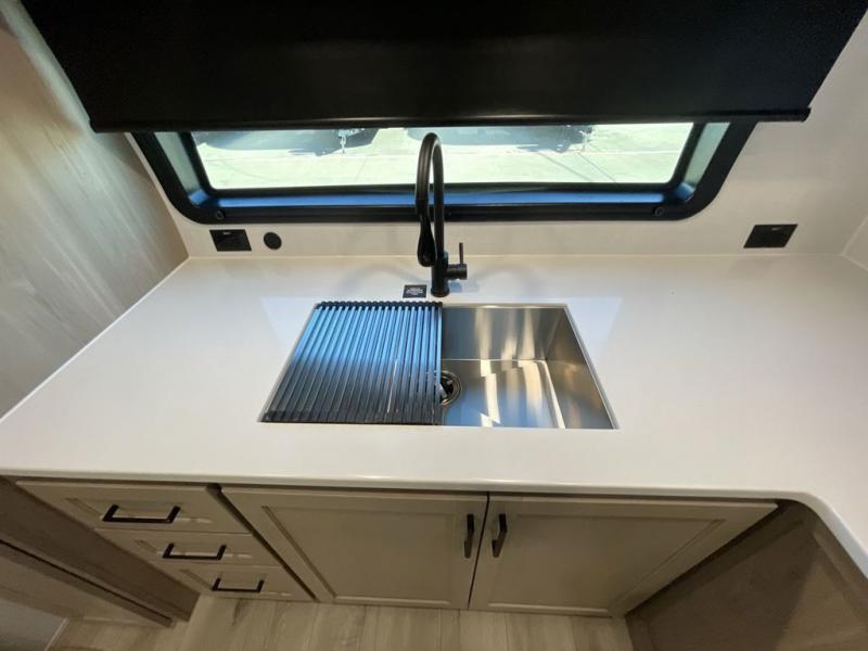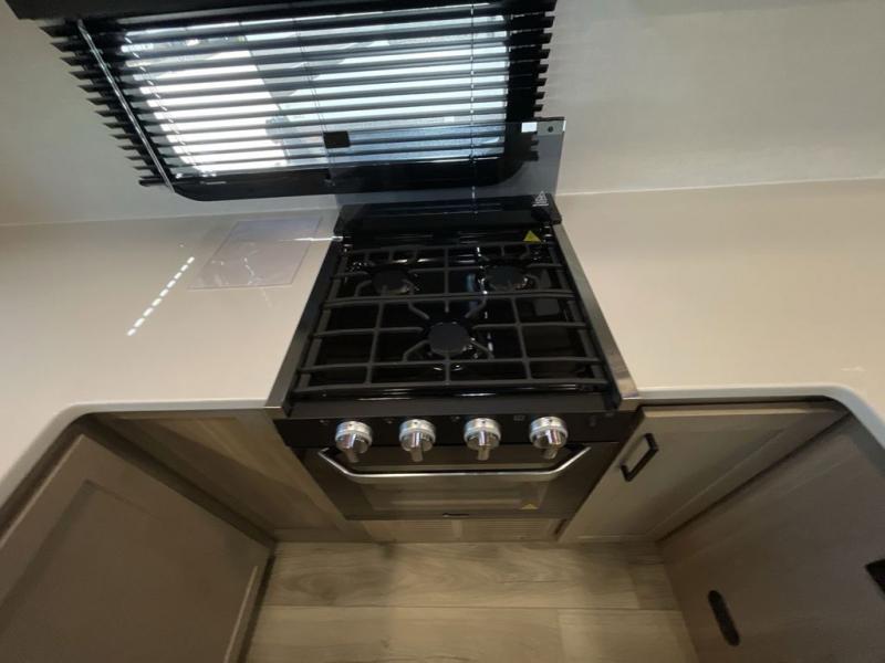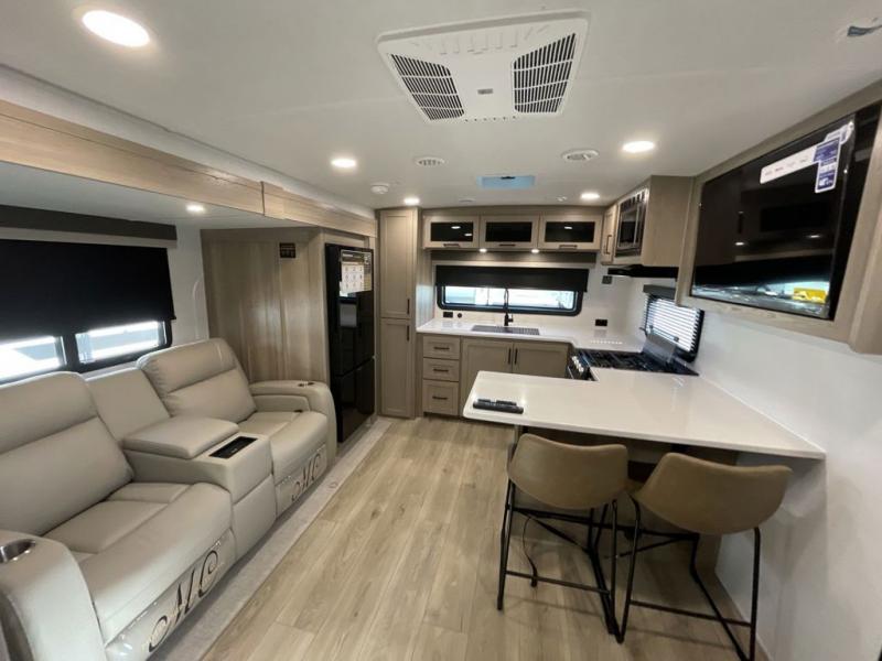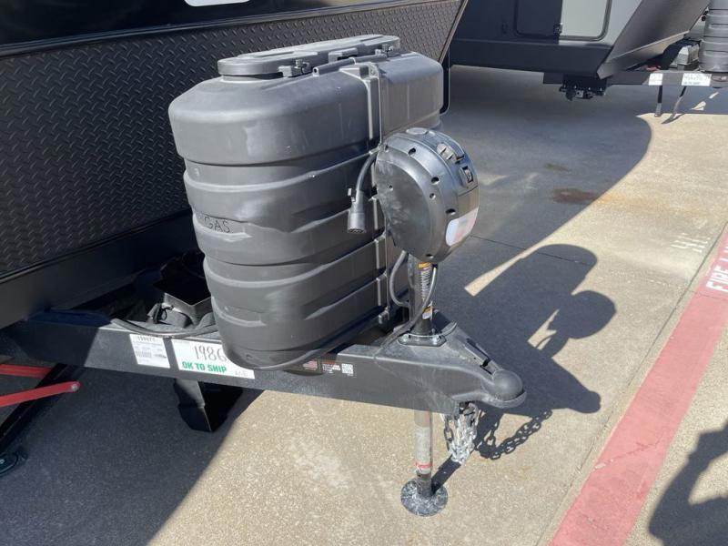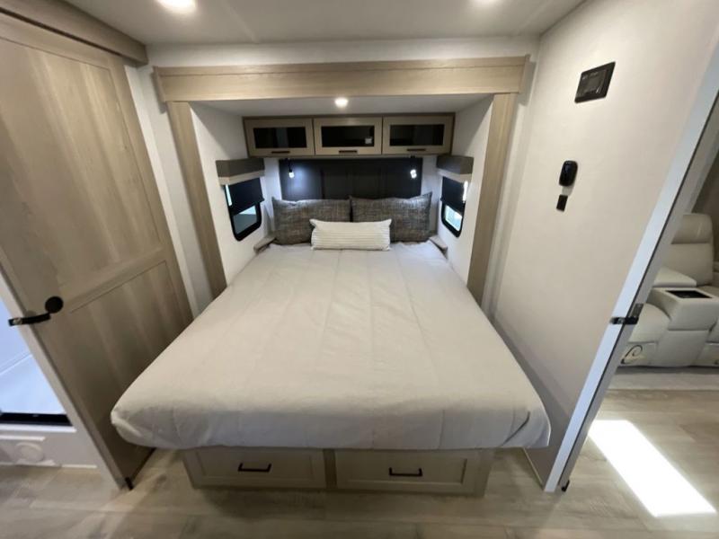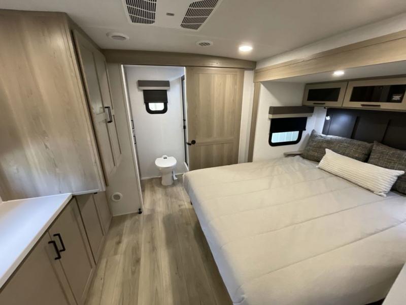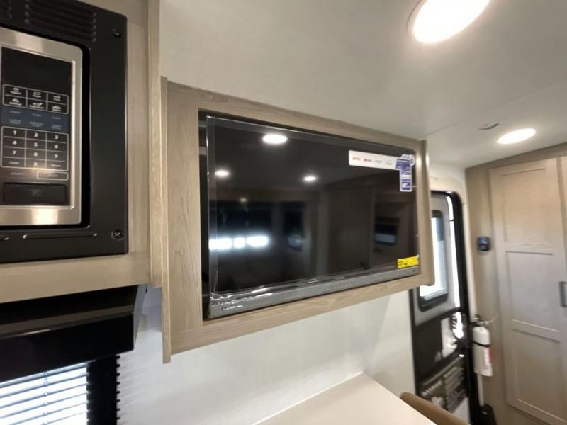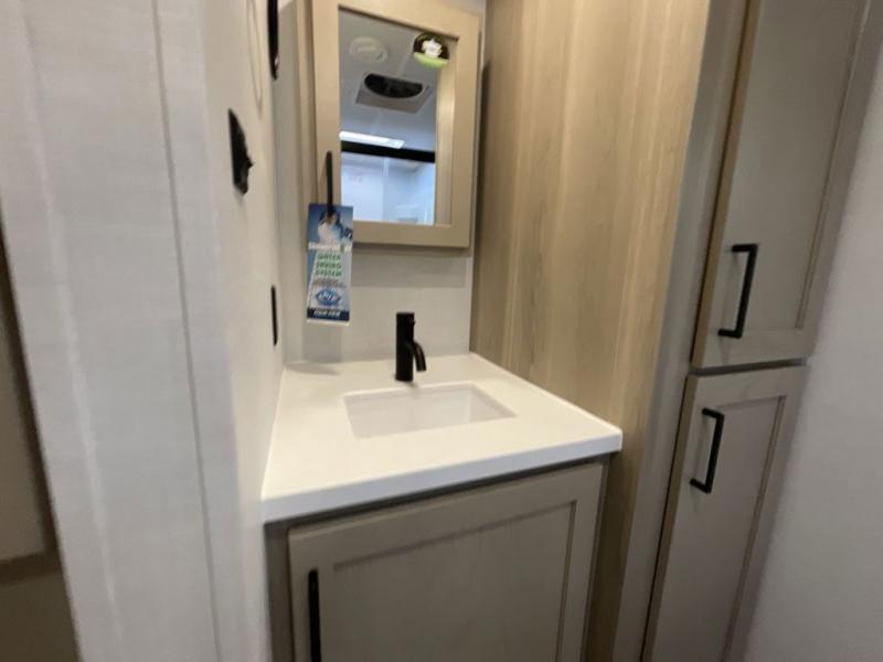 This travel trailer is the best option for you and your partner! The lavish full rear bathroom features a spacious layout and a convenient linen closet, perfect for relaxation and refreshment. The elegant bedroom boasts a plush queen bed, ample wardrobe space, and stylish dresser, creating a serene retreat. The spacious living room and kitchen combined area is the heart of the trailer, featuring plush theater seating for cozy movie nights, a generous closet for storing essentials, and a 12V Smart TV for entertainment on the go. Plus, the expansive countertop with chairs provides a perfect spot for gourmet meals or socializing, while the premium three-burner cooktop, well-stocked kitchen pantry, and high-performance microwave make meal prep and cooking a true delight.