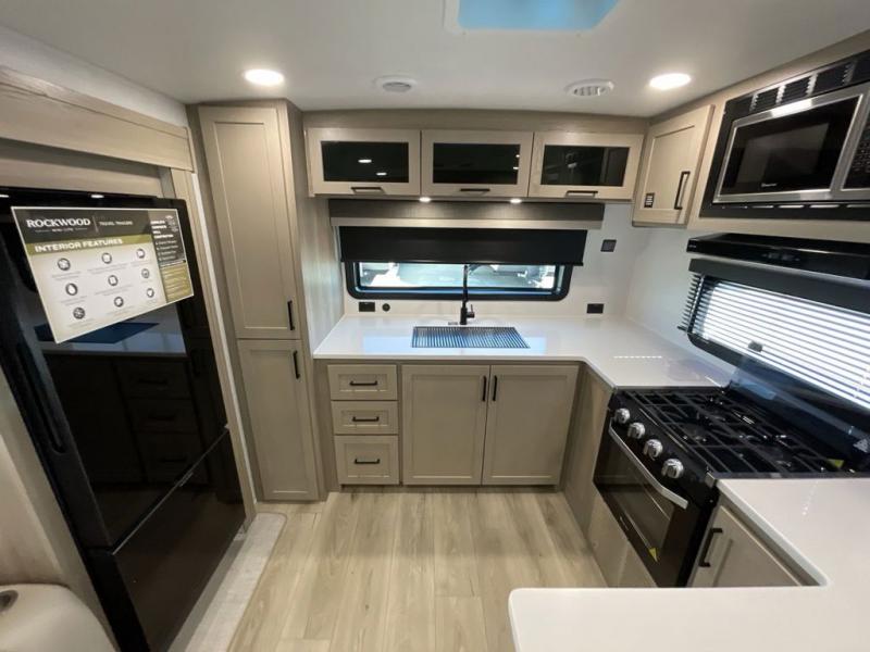 Each Rockwood Mini Lite travel trailer by Forest River is constructed with a fully laminated one-piece walkable roof, sleek frameless windows, and a six-sided full aluminum frame for strength and durability. The 12V thermostatically controlled heated tanks, plus radiant foil in the underbelly will allow you to camp well into the colder months, and the 200W roof solar panel will be perfect for a little off-gridding. Each model includes solid surface kitchen countertops, hidden hinge cabinet doors, roller shades, plus many more interior features. Having an AIR 360+ omnidirectional antenna with WiFi prep on board gives you the option to get some work done if it's needed, and the power tongue jack provides hassle-free set up, so you can enjoy more time relaxing!