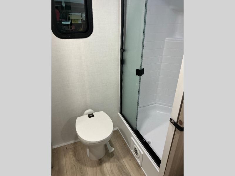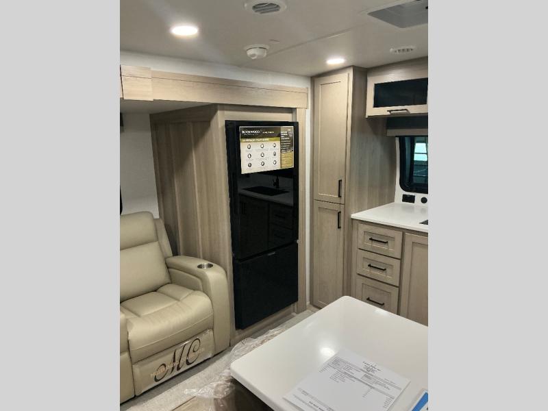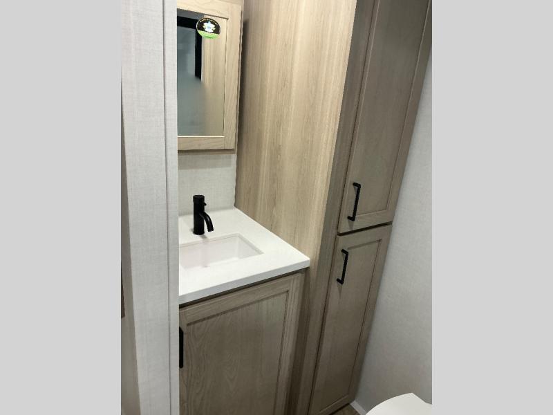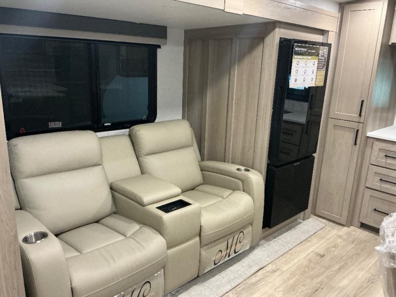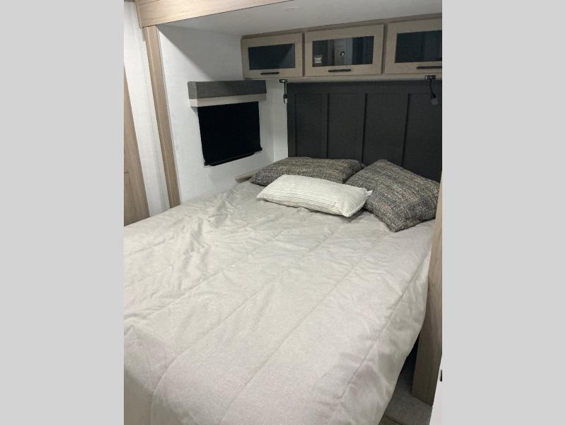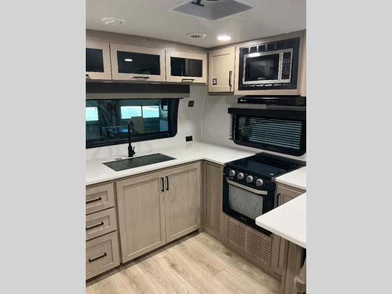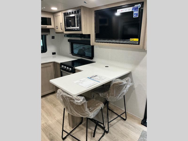 This travel trailer is the best option for you and your partner! The lavish full rear bathroom features a spacious layout and a convenient linen closet, perfect for relaxation and refreshment. The elegant bedroom boasts a plush queen bed, ample wardrobe space, and stylish dresser, creating a serene retreat. The spacious living room and kitchen combined area is the heart of the trailer, featuring plush theater seating for cozy movie nights, a generous closet for storing essentials, and a 12V Smart TV for entertainment on the go. Plus, the expansive countertop with chairs provides a perfect spot for gourmet meals or socializing, while the premium three-burner cooktop, well-stocked kitchen pantry, and high-performance microwave make meal prep and cooking a true delight.