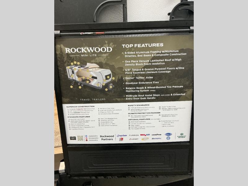 Each Rockwood Mini Lite travel trailer by Forest River is constructed with a fully laminated one-piece walkable roof, sleek frameless windows, and a six-sided full aluminum frame for strength and durability. The 12V thermostatically controlled heated tanks, plus radiant foil in the underbelly will allow you to camp well into the colder months, and the 200W roof solar panel will be perfect for a little off-gridding. Each model includes solid surface kitchen countertops, hidden hinge cabinet doors, roller shades, plus many more interior features. Having an AIR 360+ omnidirectional antenna with WiFi prep on board gives you the option to get some work done if it's needed, and the power tongue jack provides hassle-free set up, so you can enjoy more time relaxing!