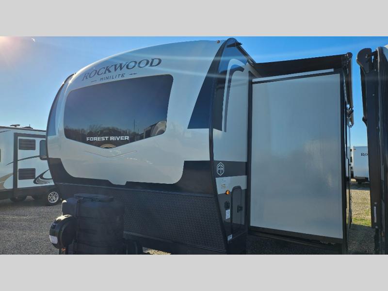 Each Rockwood Mini Lite travel trailer by Forest River is constructed with a fully laminated one-piece walkable roof, sleek frameless windows, and a six-sided full aluminum frame for strength and durability. The 12V thermostatically controlled heated tanks, plus radiant foil in the underbelly will allow you to camp well into the colder months, and the 200W roof solar panel will be perfect for a little off-gridding. Each model includes solid surface kitchen countertops, hidden hinge cabinet doors, roller shades, plus many more interior features. Having an AIR 360+ omnidirectional antenna with WiFi prep on board gives you the option to get some work done if it's needed, and the power tongue jack provides hassle-free set up, so you can enjoy more time relaxing!