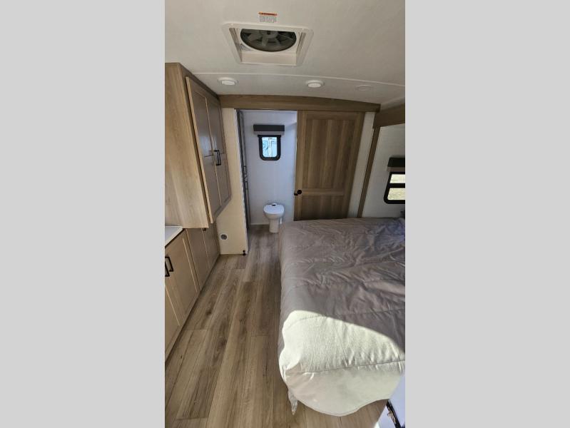 This travel trailer is the best option for you and your partner! The lavish full rear bathroom features a spacious layout and a convenient linen closet, perfect for relaxation and refreshment. The elegant bedroom boasts a plush queen bed, ample wardrobe space, and stylish dresser, creating a serene retreat. The spacious living room and kitchen combined area is the heart of the trailer, featuring plush theater seating for cozy movie nights, a generous closet for storing essentials, and a 12V Smart TV for entertainment on the go. Plus, the expansive countertop with chairs provides a perfect spot for gourmet meals or socializing, while the premium three-burner cooktop, well-stocked kitchen pantry, and high-performance microwave make meal prep and cooking a true delight.