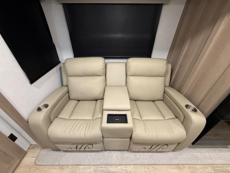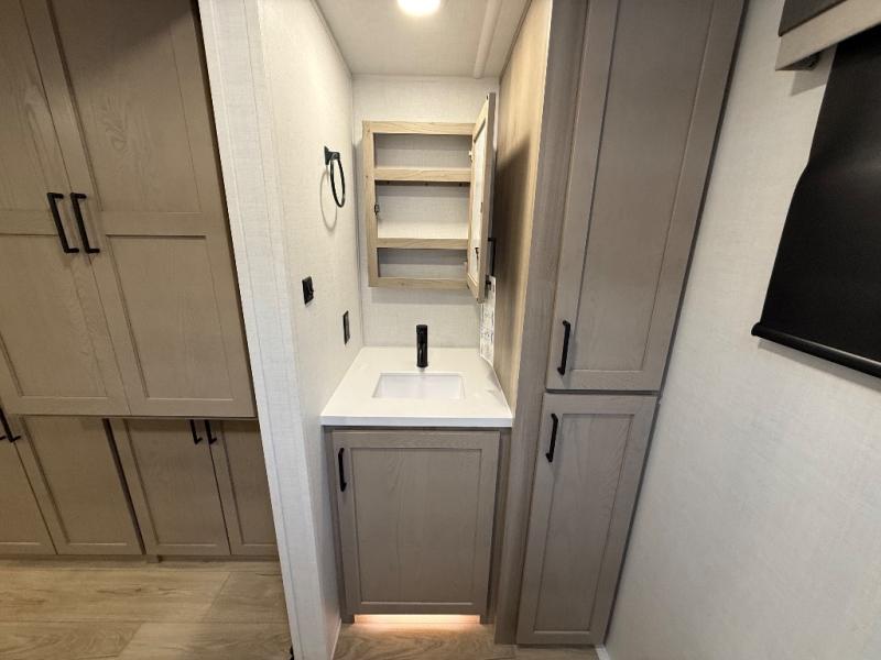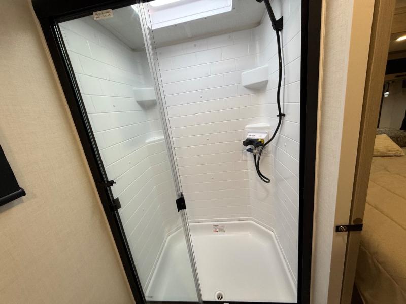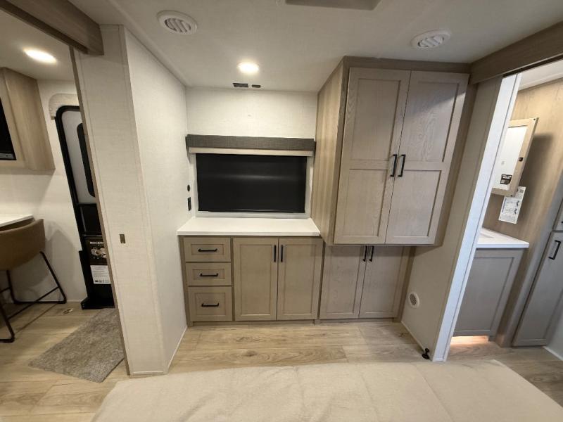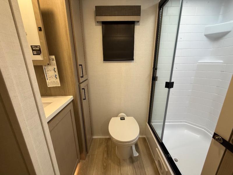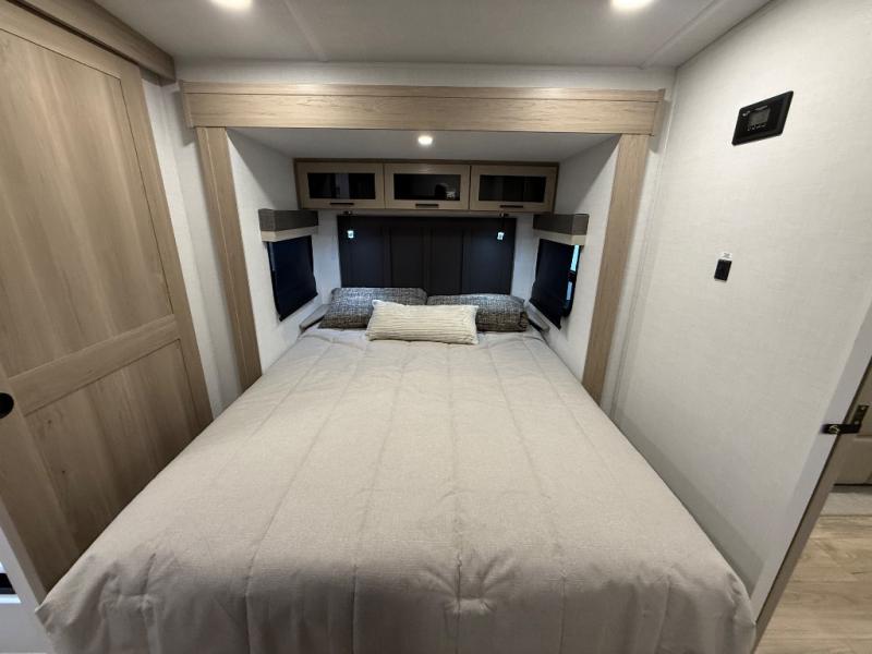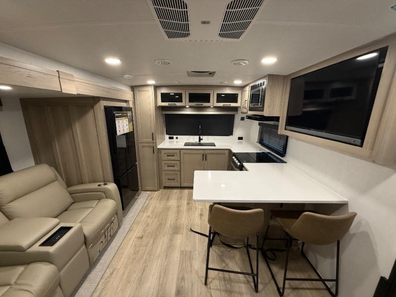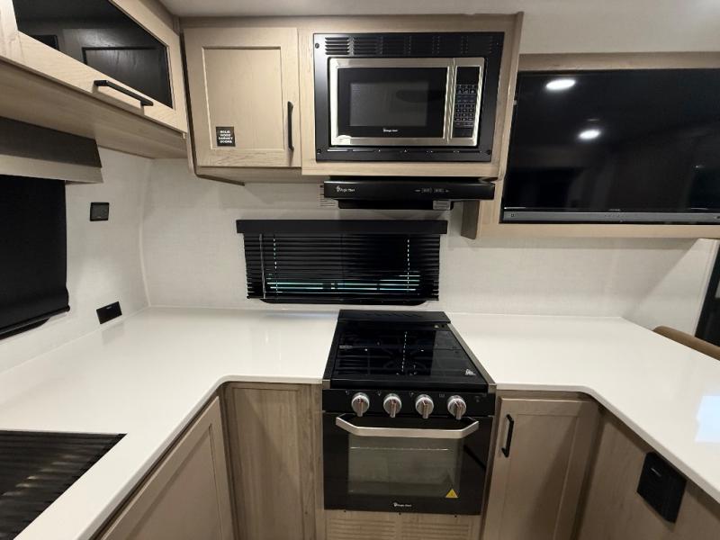 This travel trailer is the best option for you and your partner! The lavish full rear bathroom features a spacious layout and a convenient linen closet, perfect for relaxation and refreshment. The elegant bedroom boasts a plush queen bed, ample wardrobe space, and stylish dresser, creating a serene retreat. The spacious living room and kitchen combined area is the heart of the trailer, featuring plush theater seating for cozy movie nights, a generous closet for storing essentials, and a 12V Smart TV for entertainment on the go. Plus, the expansive countertop with chairs provides a perfect spot for gourmet meals or socializing, while the premium three-burner cooktop, well-stocked kitchen pantry, and high-performance microwave make meal prep and cooking a true delight.