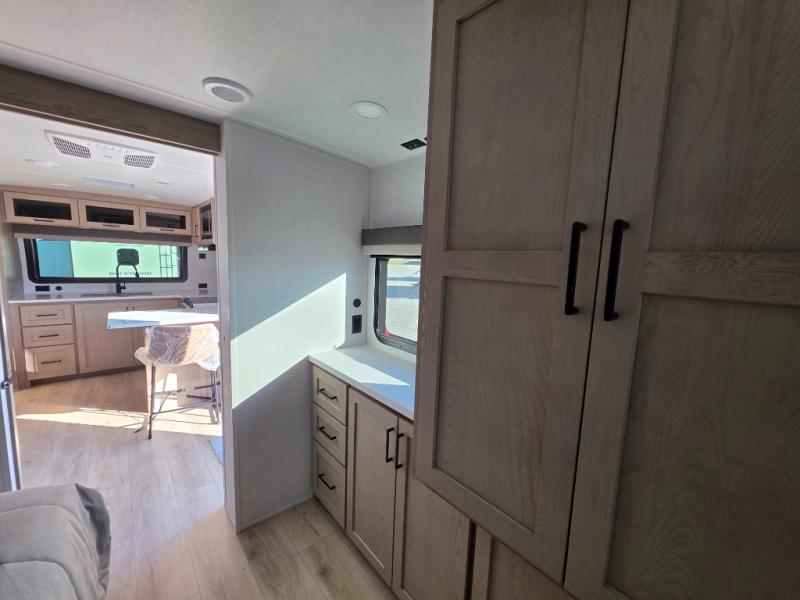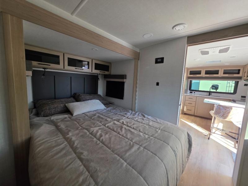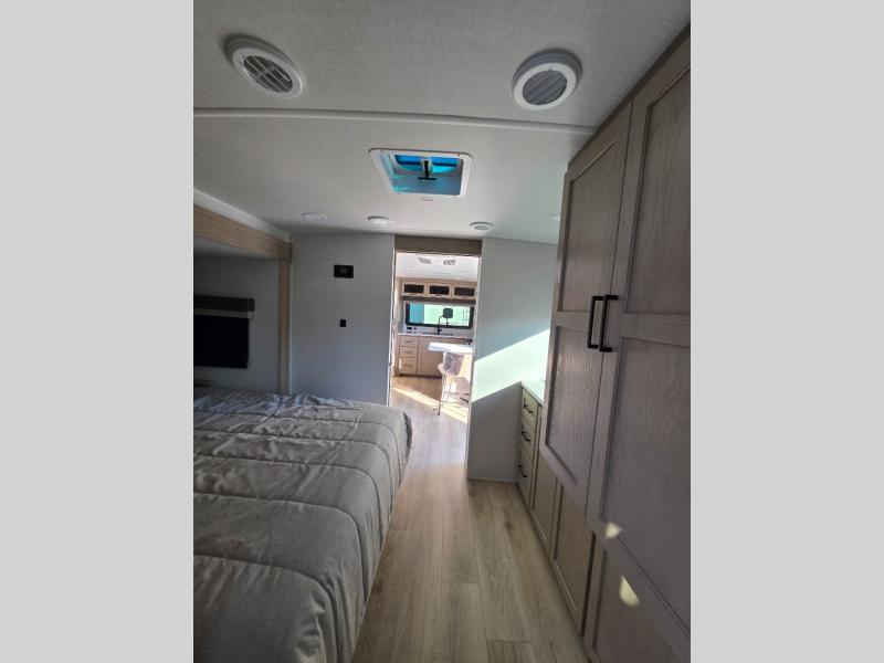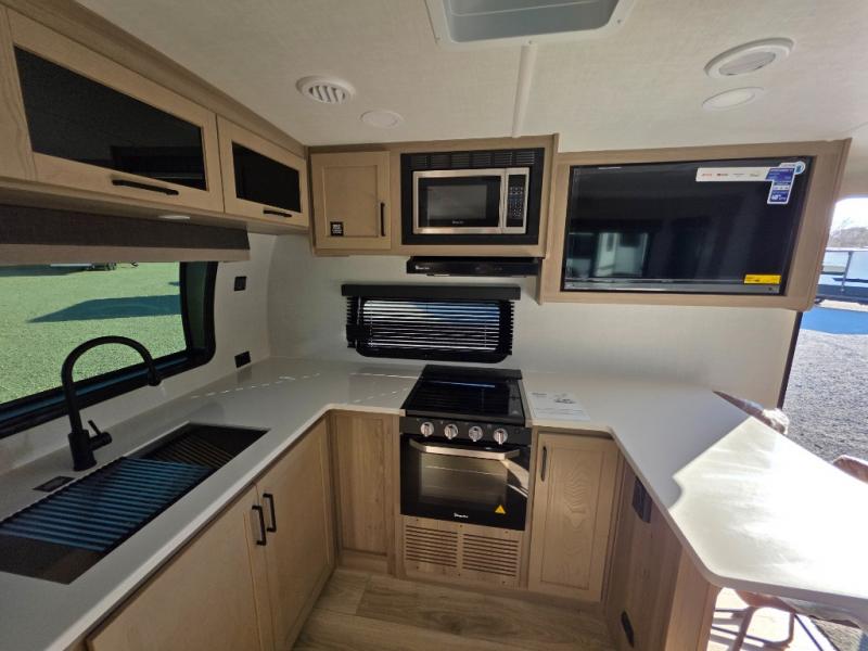 This travel trailer is the best option for you and your partner! The lavish full rear bathroom features a spacious layout and a convenient linen closet, perfect for relaxation and refreshment. The elegant bedroom boasts a plush queen bed, ample wardrobe space, and stylish dresser, creating a serene retreat. The spacious living room and kitchen combined area is the heart of the trailer, featuring plush theater seating for cozy movie nights, a generous closet for storing essentials, and a 12V Smart TV for entertainment on the go. Plus, the expansive countertop with chairs provides a perfect spot for gourmet meals or socializing, while the premium three-burner cooktop, well-stocked kitchen pantry, and high-performance microwave make meal prep and cooking a true delight.