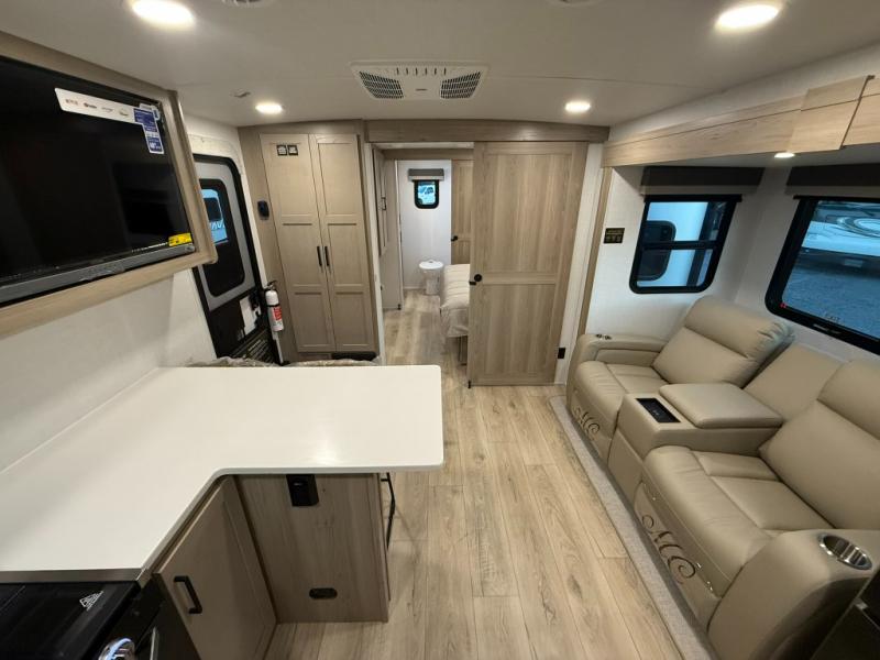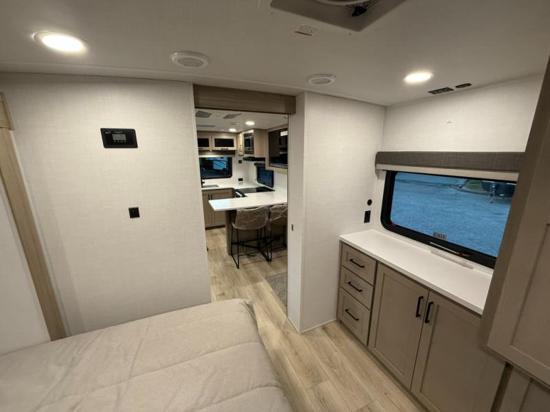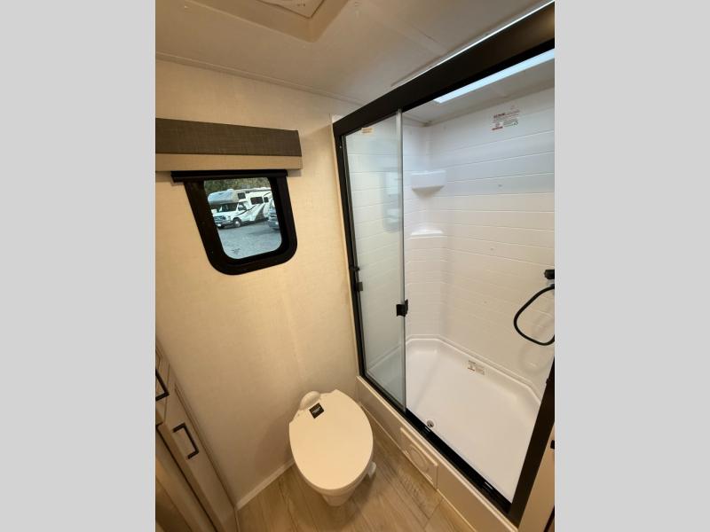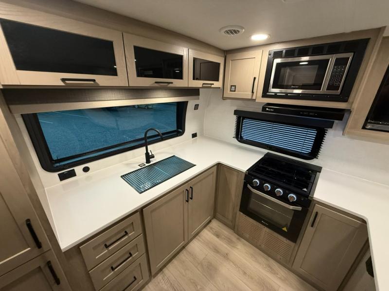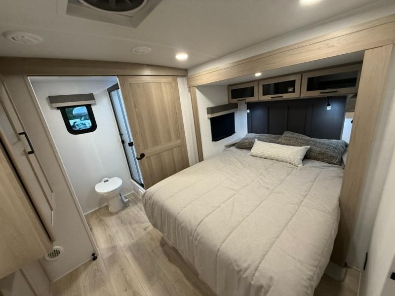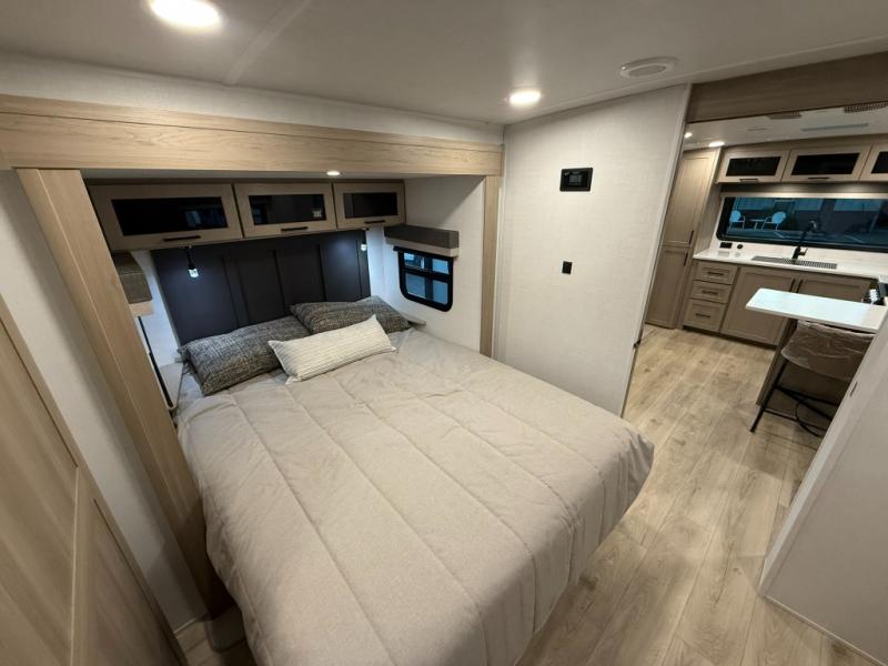This travel trailer is the best option for you and your partner! The lavish full rear bathroom features a spacious layout and a convenient linen closet, perfect for relaxation and refreshment. The elegant bedroom boasts a plush queen bed, ample wardrobe space, and stylish dresser, creating a serene retreat. The spacious living room and kitchen combined area is the heart of the trailer, featuring plush theater seating for cozy movie nights, a generous closet for storing essentials, and a 12V Smart TV for entertainment on the go. Plus, the expansive countertop with chairs provides a perfect spot for gourmet meals or socializing, while the premium three-burner cooktop, well-stocked kitchen pantry, and high-performance microwave make meal prep and cooking a true delight.
