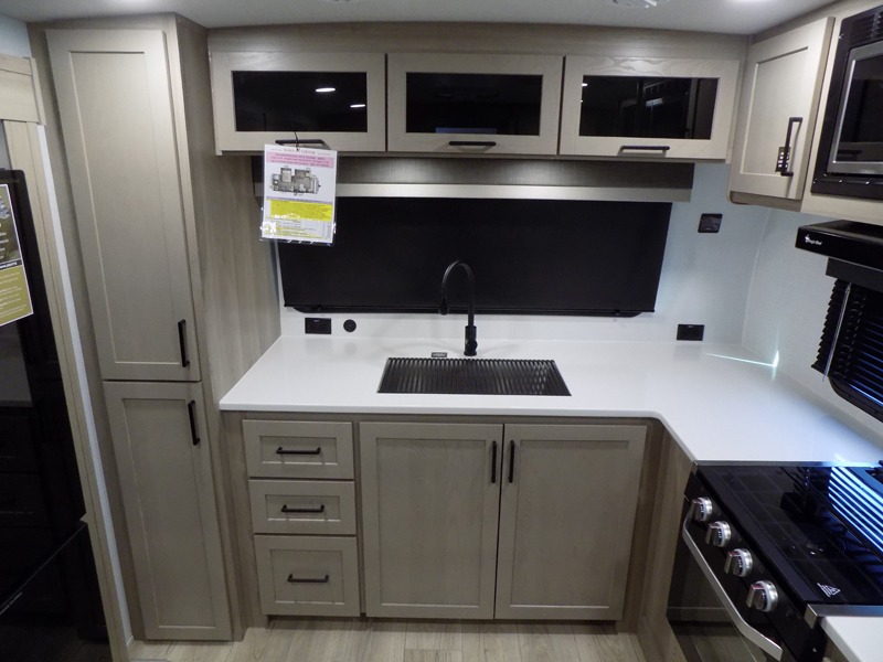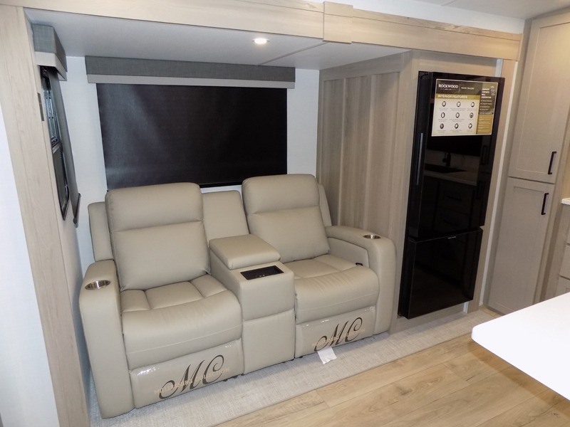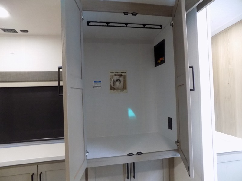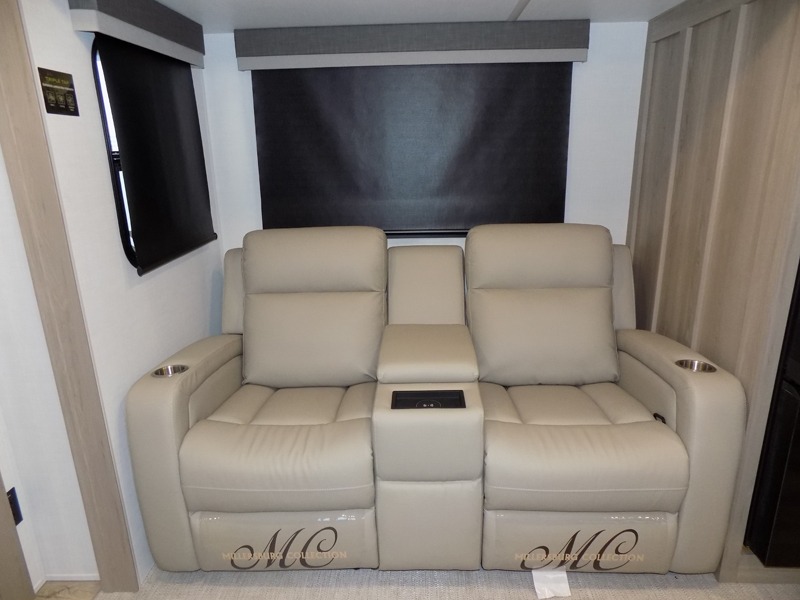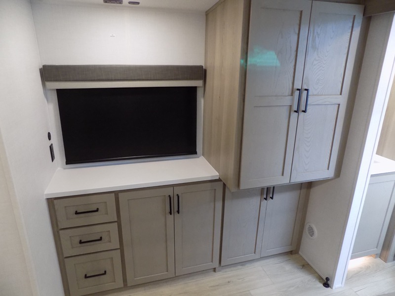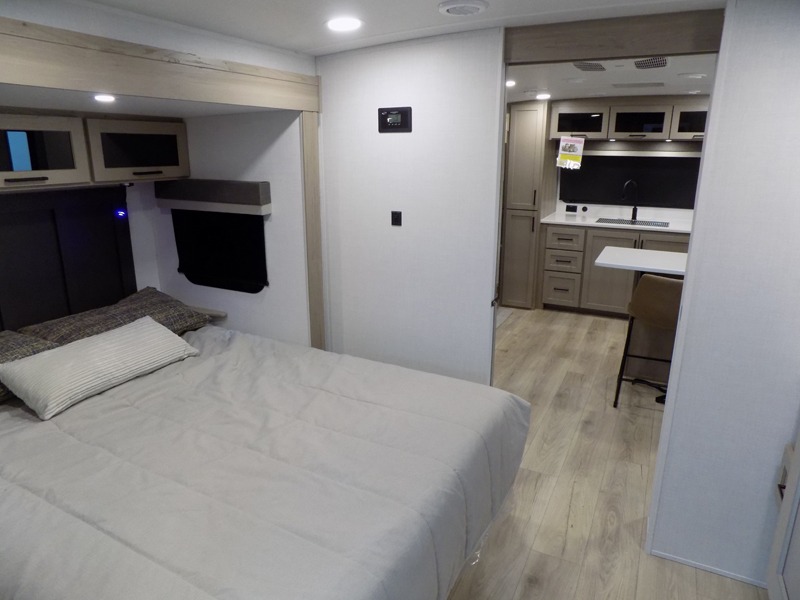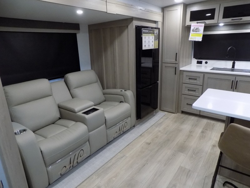 This travel trailer is the best option for you and your partner! The lavish full rear bathroom features a spacious layout and a convenient linen closet, perfect for relaxation and refreshment. The elegant bedroom boasts a plush queen bed, ample wardrobe space, and stylish dresser, creating a serene retreat. The spacious living room and kitchen combined area is the heart of the trailer, featuring plush theater seating for cozy movie nights, a generous closet for storing essentials, and a 12V Smart TV for entertainment on the go. Plus, the expansive countertop with chairs provides a perfect spot for gourmet meals or socializing, while the premium three-burner cooktop, well-stocked kitchen pantry, and high-performance microwave make meal prep and cooking a true delight.