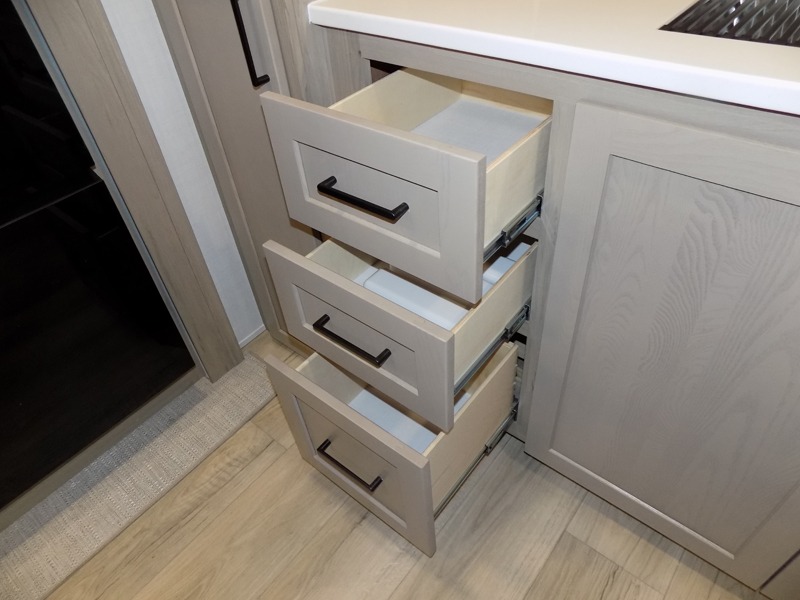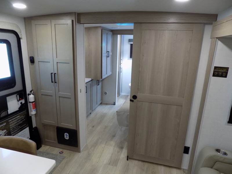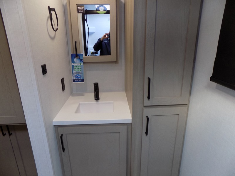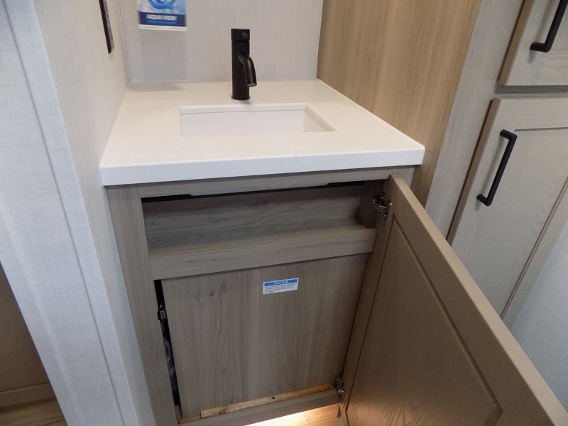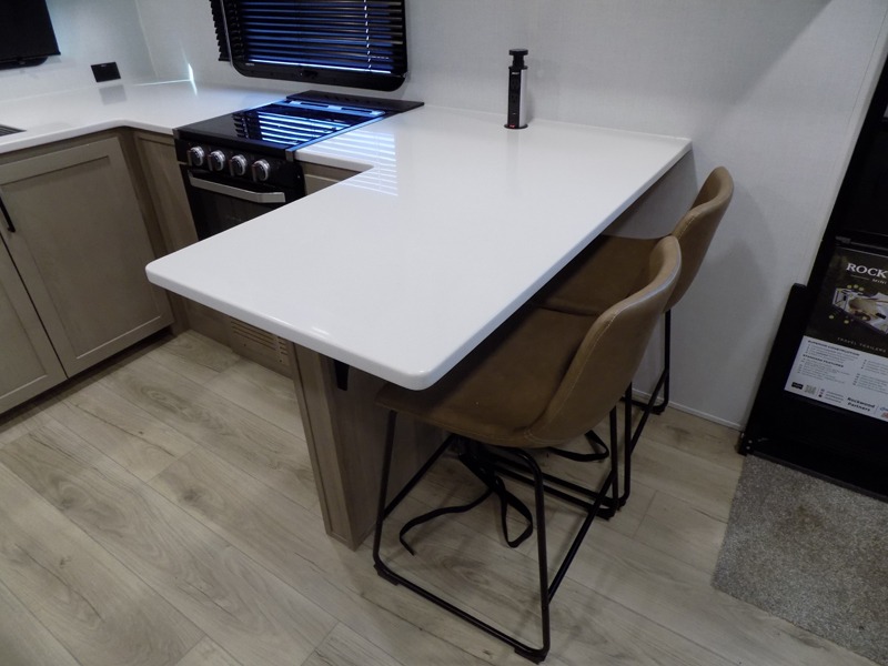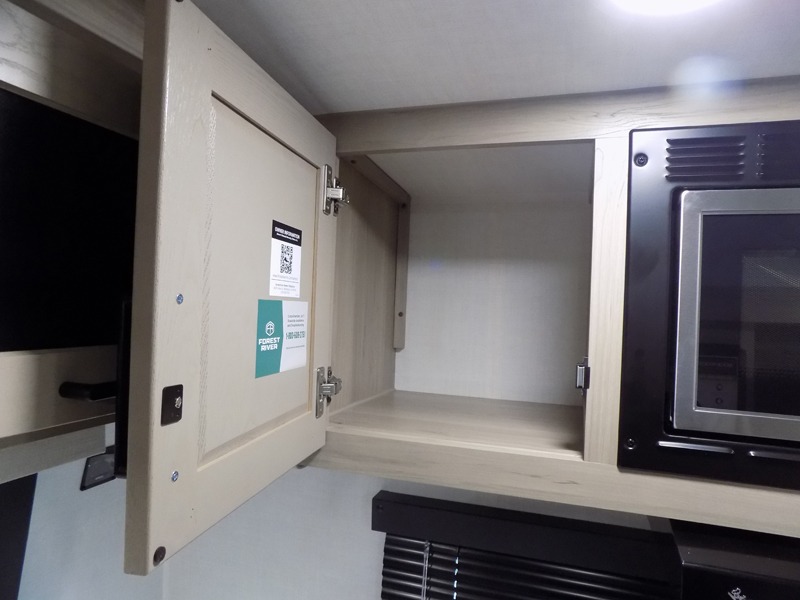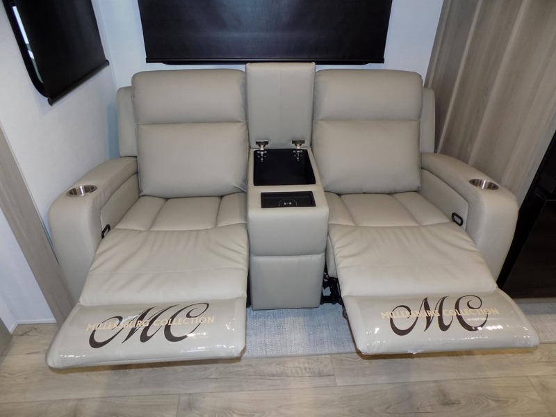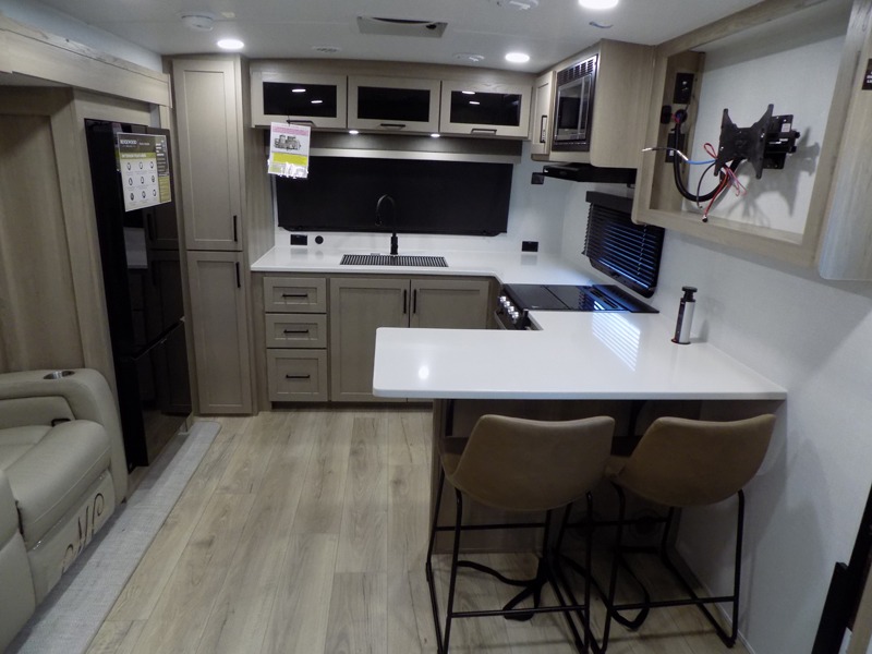 This travel trailer is the best option for you and your partner! The lavish full rear bathroom features a spacious layout and a convenient linen closet, perfect for relaxation and refreshment. The elegant bedroom boasts a plush queen bed, ample wardrobe space, and stylish dresser, creating a serene retreat. The spacious living room and kitchen combined area is the heart of the trailer, featuring plush theater seating for cozy movie nights, a generous closet for storing essentials, and a 12V Smart TV for entertainment on the go. Plus, the expansive countertop with chairs provides a perfect spot for gourmet meals or socializing, while the premium three-burner cooktop, well-stocked kitchen pantry, and high-performance microwave make meal prep and cooking a true delight.