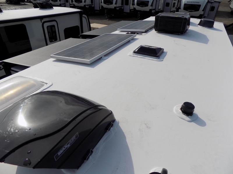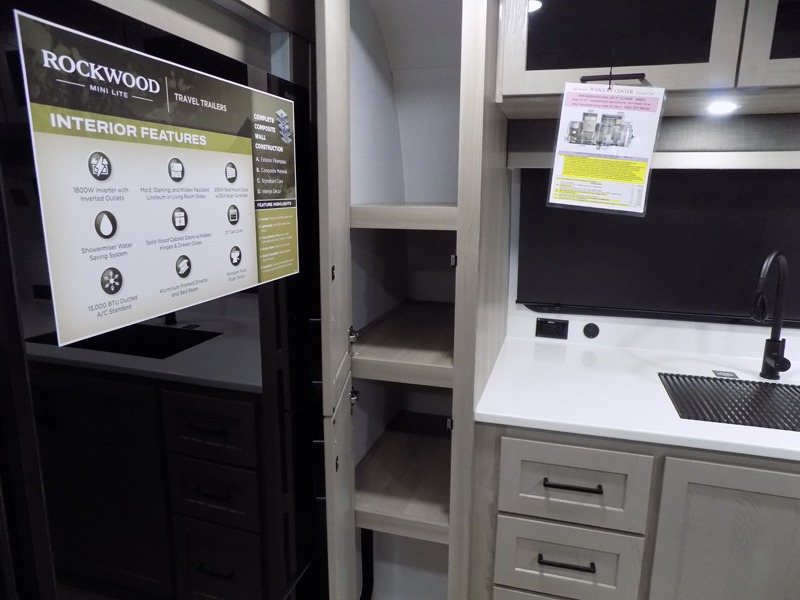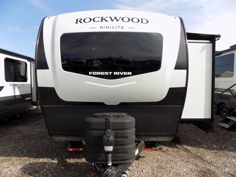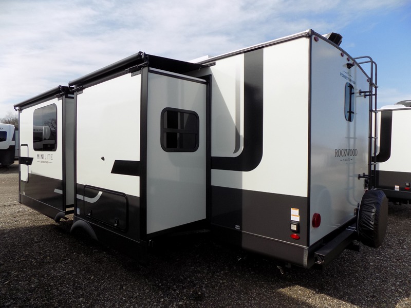 Each Rockwood Mini Lite travel trailer by Forest River is constructed with a fully laminated one-piece walkable roof, sleek frameless windows, and a six-sided full aluminum frame for strength and durability. The 12V thermostatically controlled heated tanks, plus radiant foil in the underbelly will allow you to camp well into the colder months, and the 200W roof solar panel will be perfect for a little off-gridding. Each model includes solid surface kitchen countertops, hidden hinge cabinet doors, roller shades, plus many more interior features. Having an AIR 360+ omnidirectional antenna with WiFi prep on board gives you the option to get some work done if it's needed, and the power tongue jack provides hassle-free set up, so you can enjoy more time relaxing!
