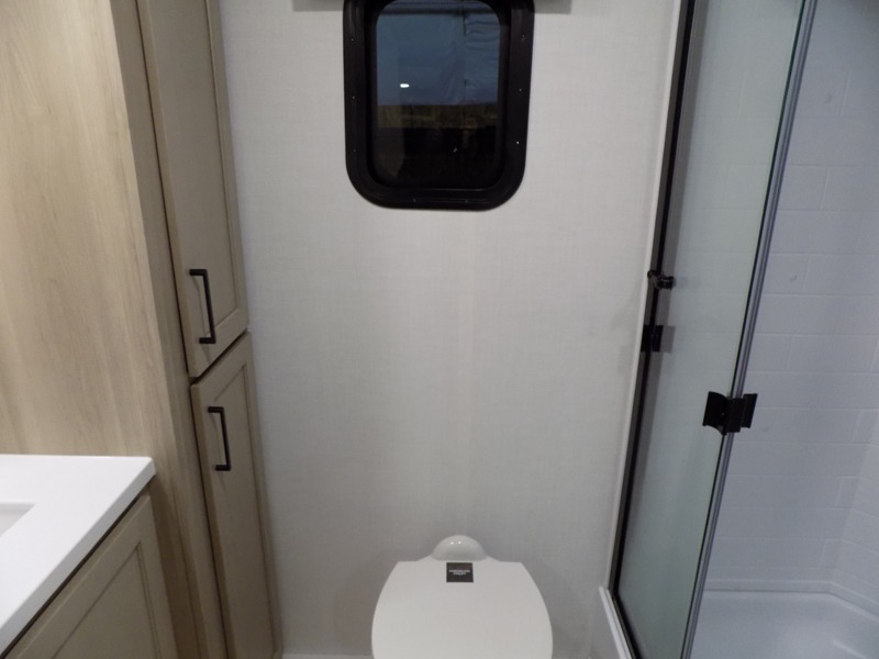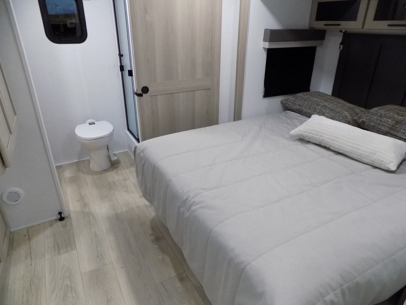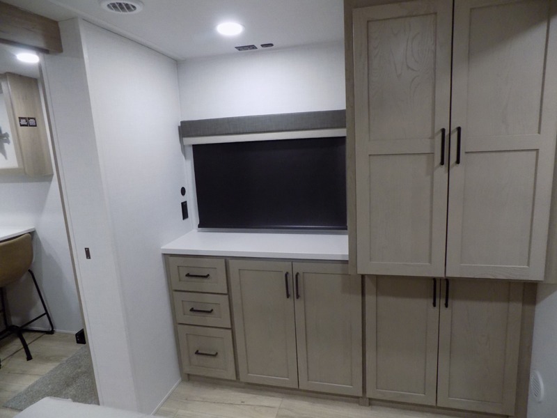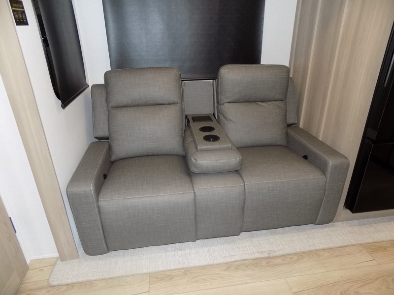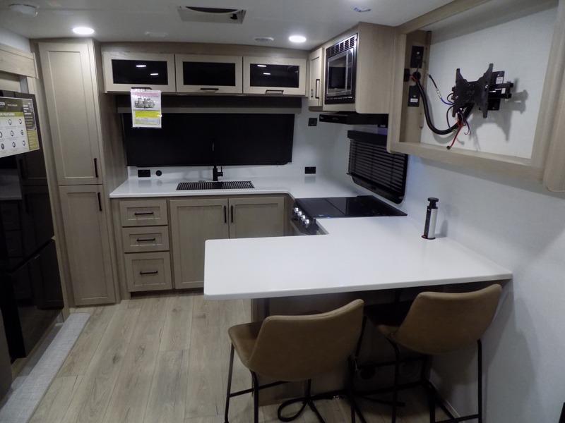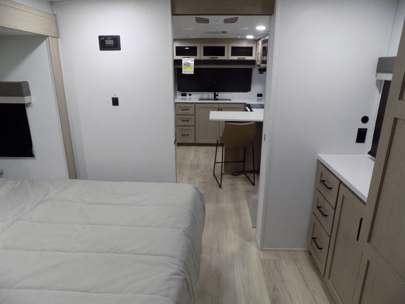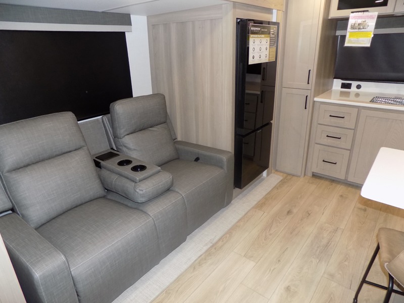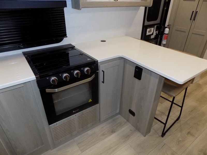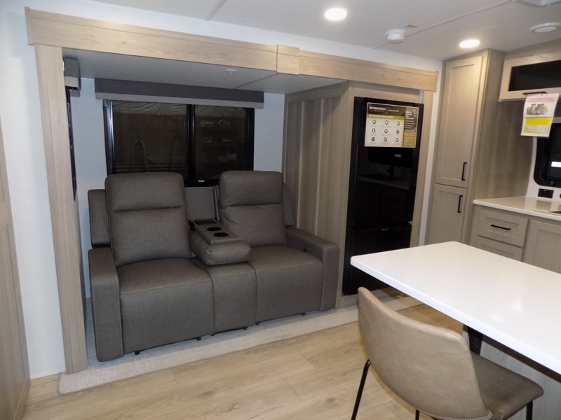 This travel trailer is the best option for you and your partner! The lavish full rear bathroom features a spacious layout and a convenient linen closet, perfect for relaxation and refreshment. The elegant bedroom boasts a plush queen bed, ample wardrobe space, and stylish dresser, creating a serene retreat. The spacious living room and kitchen combined area is the heart of the trailer, featuring plush theater seating for cozy movie nights, a generous closet for storing essentials, and a 12V Smart TV for entertainment on the go. Plus, the expansive countertop with chairs provides a perfect spot for gourmet meals or socializing, while the premium three-burner cooktop, well-stocked kitchen pantry, and high-performance microwave make meal prep and cooking a true delight.