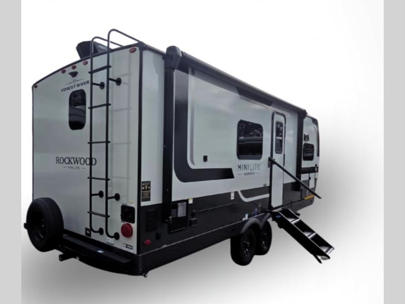 Each Rockwood Mini Lite travel trailer by Forest River is constructed with a fully laminated one-piece walkable roof, sleek frameless windows, and a six-sided full aluminum frame for strength and durability. The 12V thermostatically controlled heated tanks, plus radiant foil in the underbelly will allow you to camp well into the colder months, and the 200W roof solar panel will be perfect for a little off-gridding. Each model includes solid surface kitchen countertops, hidden hinge cabinet doors, roller shades, plus many more interior features. Having an AIR 360+ omnidirectional antenna with WiFi prep on board gives you the option to get some work done if it's needed, and the power tongue jack provides hassle-free set up, so you can enjoy more time relaxing!