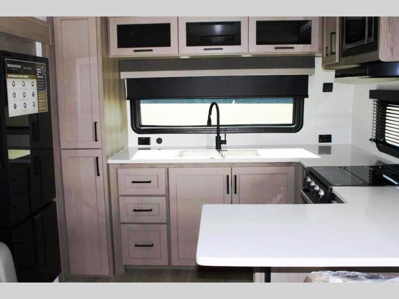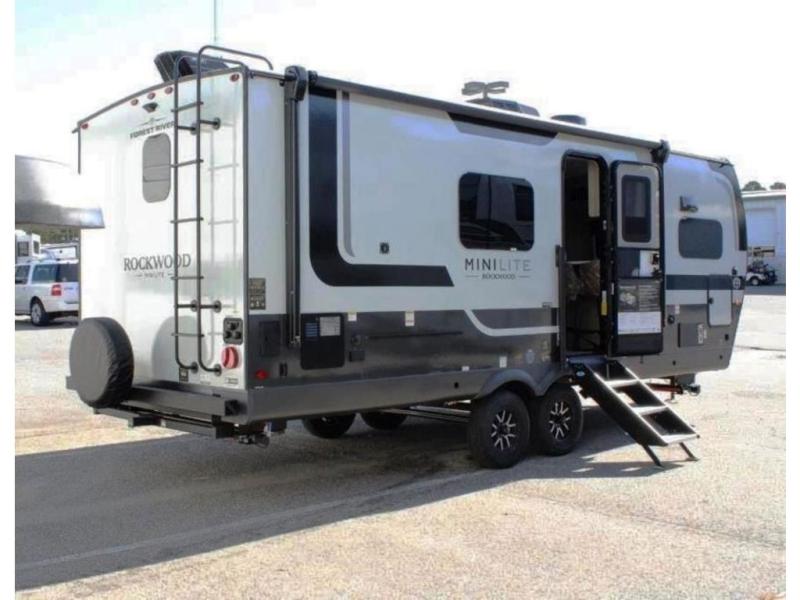 Each Rockwood Mini Lite travel trailer by Forest River is constructed with a fully laminated one-piece walkable roof, sleek frameless windows, and a six-sided full aluminum frame for strength and durability. The 12V thermostatically controlled heated tanks, plus radiant foil in the underbelly will allow you to camp well into the colder months, and the 200W roof solar panel will be perfect for a little off-gridding. Each model includes solid surface kitchen countertops, hidden hinge cabinet doors, roller shades, plus many more interior features. Having an AIR 360+ omnidirectional antenna with WiFi prep on board gives you the option to get some work done if it's needed, and the power tongue jack provides hassle-free set up, so you can enjoy more time relaxing!