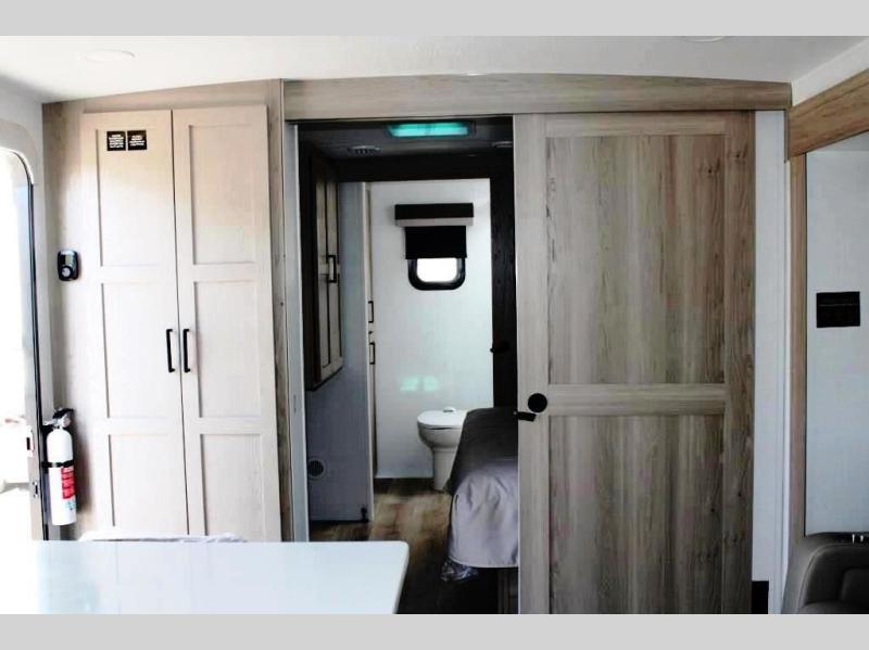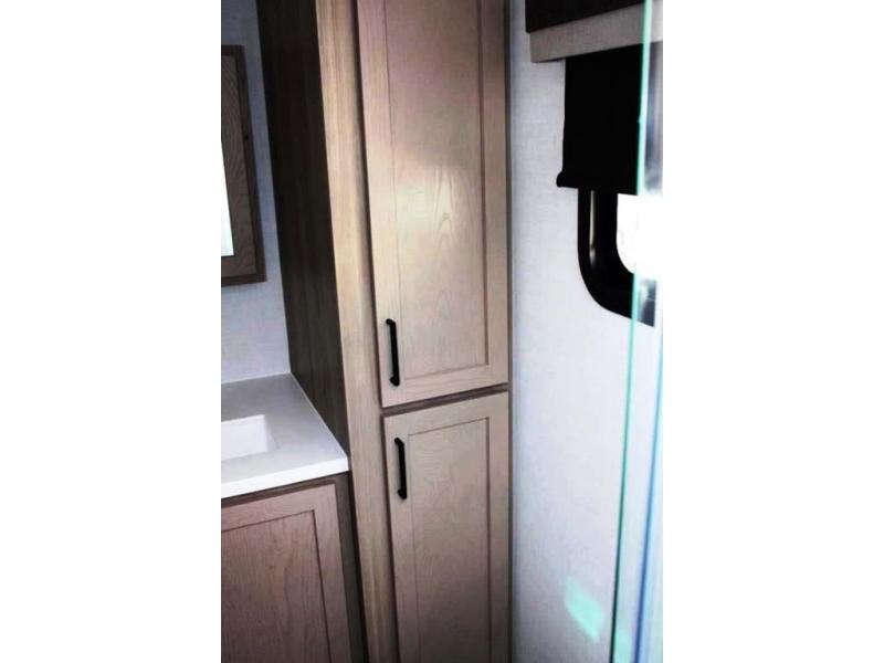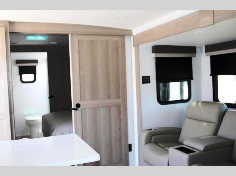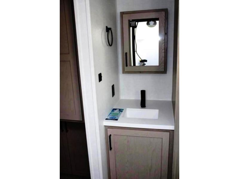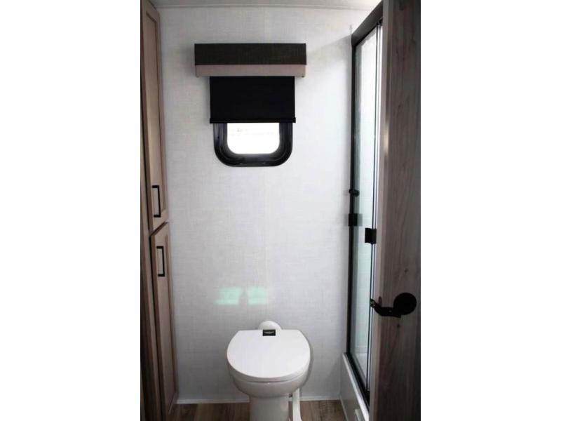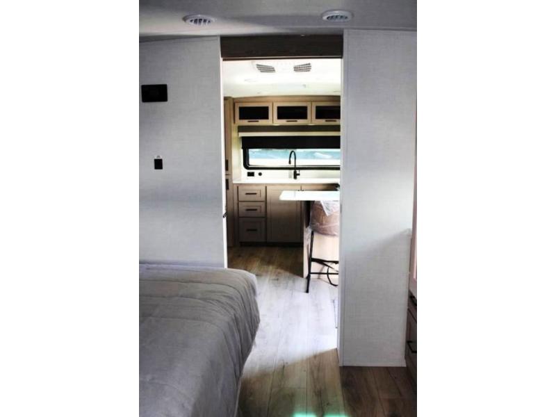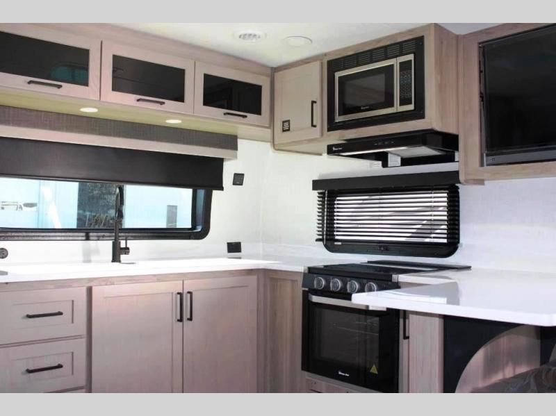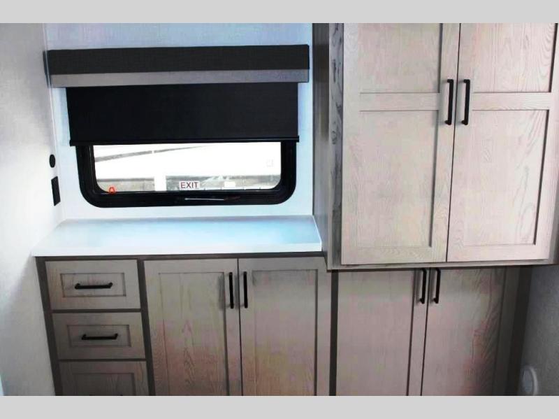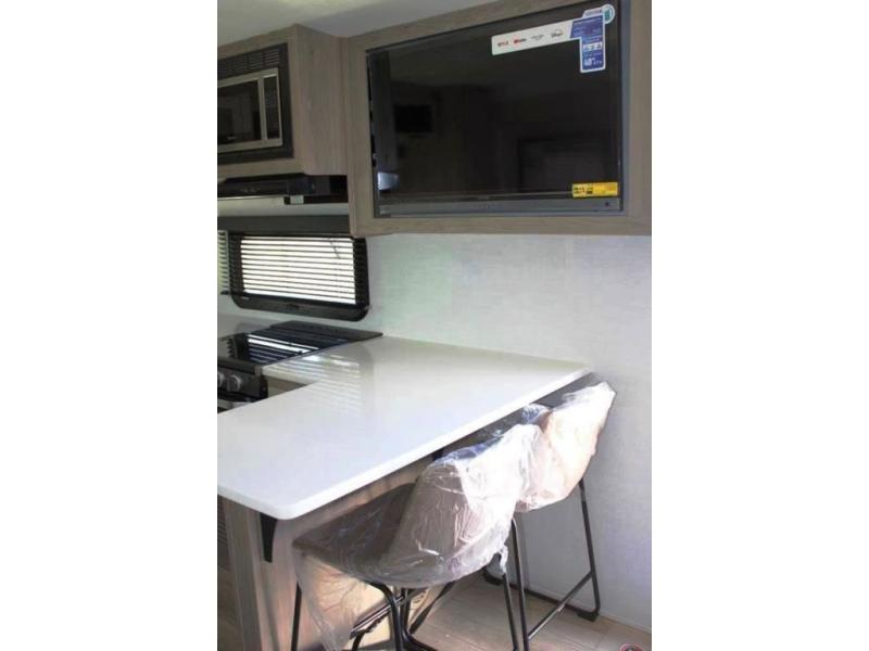 This travel trailer is the best option for you and your partner! The lavish full rear bathroom features a spacious layout and a convenient linen closet, perfect for relaxation and refreshment. The elegant bedroom boasts a plush queen bed, ample wardrobe space, and stylish dresser, creating a serene retreat. The spacious living room and kitchen combined area is the heart of the trailer, featuring plush theater seating for cozy movie nights, a generous closet for storing essentials, and a 12V Smart TV for entertainment on the go. Plus, the expansive countertop with chairs provides a perfect spot for gourmet meals or socializing, while the premium three-burner cooktop, kitchen pantry, and microwave make meal prep and cooking a true delight.