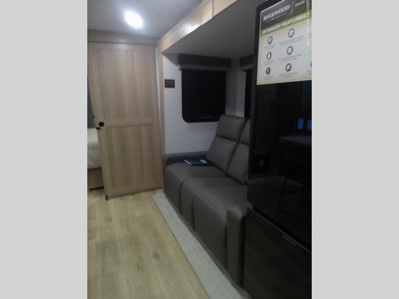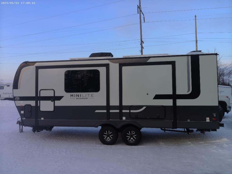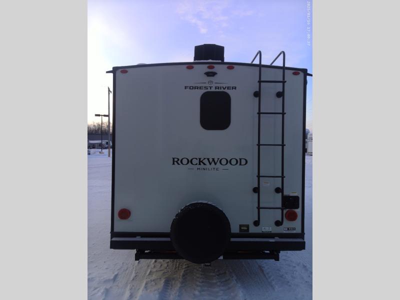 Each Rockwood Mini Lite travel trailer by Forest River is constructed with a fully laminated one-piece walkable roof, sleek frameless windows, and a six-sided full aluminum frame for strength and durability. The 12V thermostatically controlled heated tanks, plus radiant foil in the underbelly will allow you to camp well into the colder months, and the 200W roof solar panel will be perfect for a little off-gridding. Each model includes solid surface kitchen countertops, hidden hinge cabinet doors, roller shades, plus many more interior features. Having an AIR 360+ omnidirectional antenna with WiFi prep on board gives you the option to get some work done if it's needed, and the power tongue jack provides hassle-free set up, so you can enjoy more time relaxing!