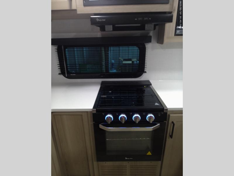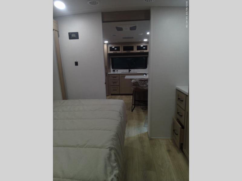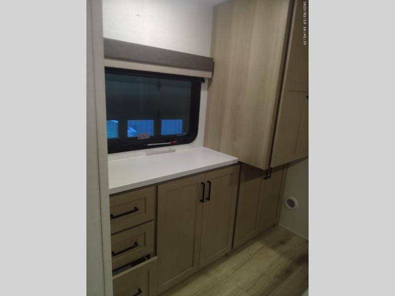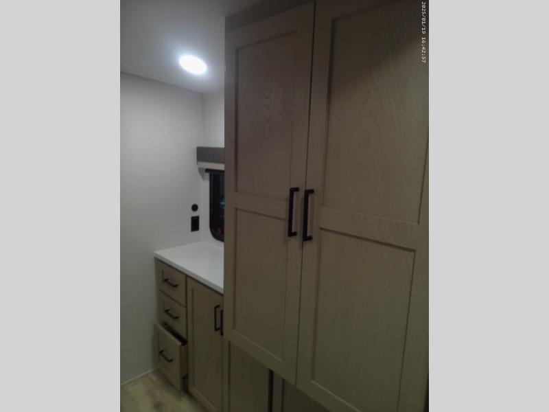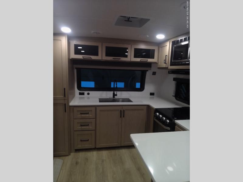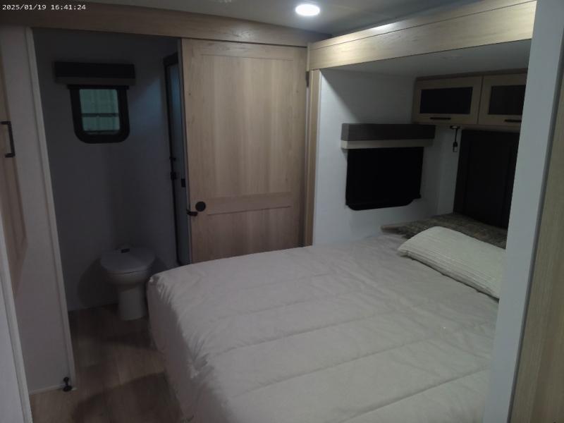 This travel trailer is the best option for you and your partner! The lavish full rear bathroom features a spacious layout and a convenient linen closet, perfect for relaxation and refreshment. The elegant bedroom boasts a plush queen bed, ample wardrobe space, and stylish dresser, creating a serene retreat. The spacious living room and kitchen combined area is the heart of the trailer, featuring plush theater seating for cozy movie nights, a generous closet for storing essentials, and a 12V Smart TV for entertainment on the go. Plus, the expansive countertop with chairs provides a perfect spot for gourmet meals or socializing, while the premium three-burner cooktop, kitchen pantry, and microwave make meal prep and cooking a true delight.