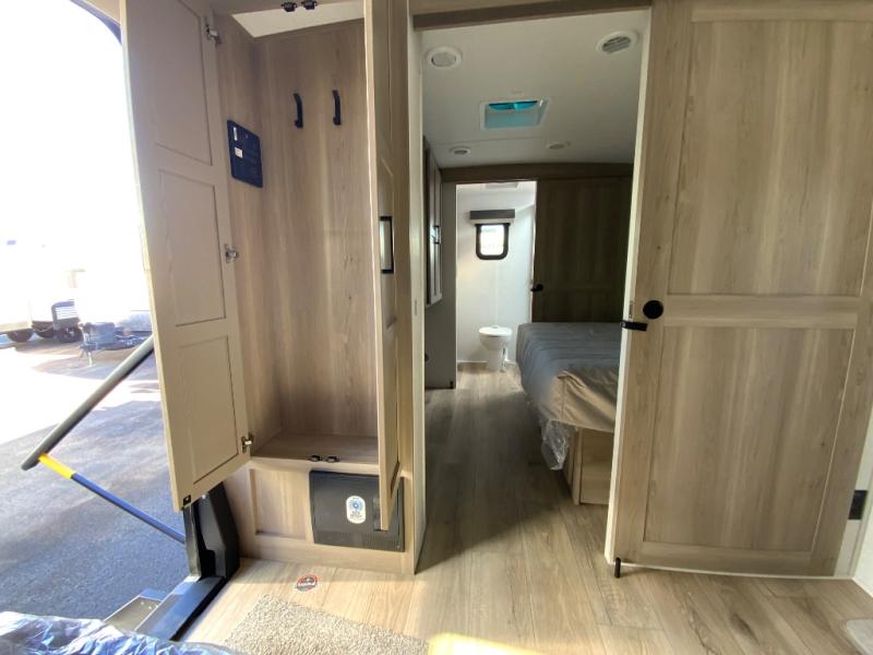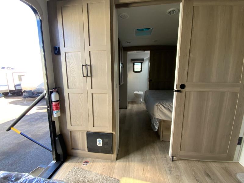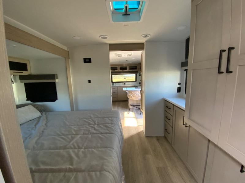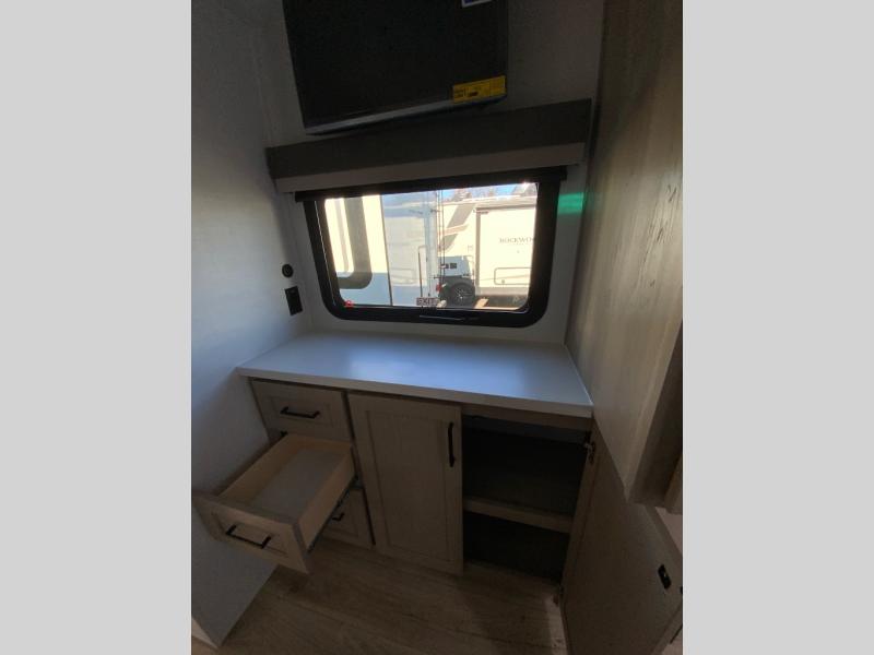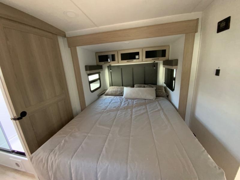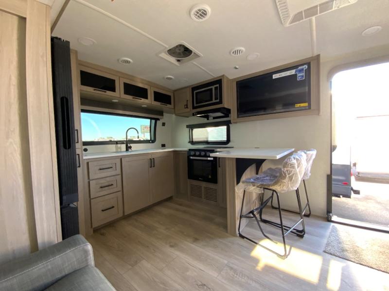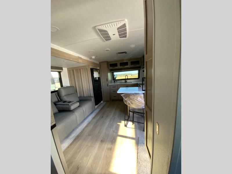 This travel trailer is the best option for you and your partner! The lavish full rear bathroom features a spacious layout and a convenient linen closet, perfect for relaxation and refreshment. The elegant bedroom boasts a plush queen bed, ample wardrobe space, and stylish dresser, creating a serene retreat. The spacious living room and kitchen combined area is the heart of the trailer, featuring plush theater seating for cozy movie nights, a generous closet for storing essentials, and a 12V Smart TV for entertainment on the go. Plus, the expansive countertop with chairs provides a perfect spot for gourmet meals or socializing, while the premium three-burner cooktop, kitchen pantry, and microwave make meal prep and cooking a true delight.